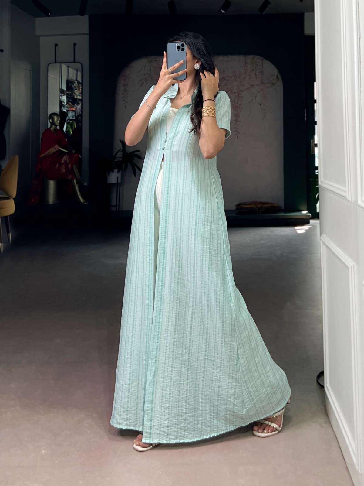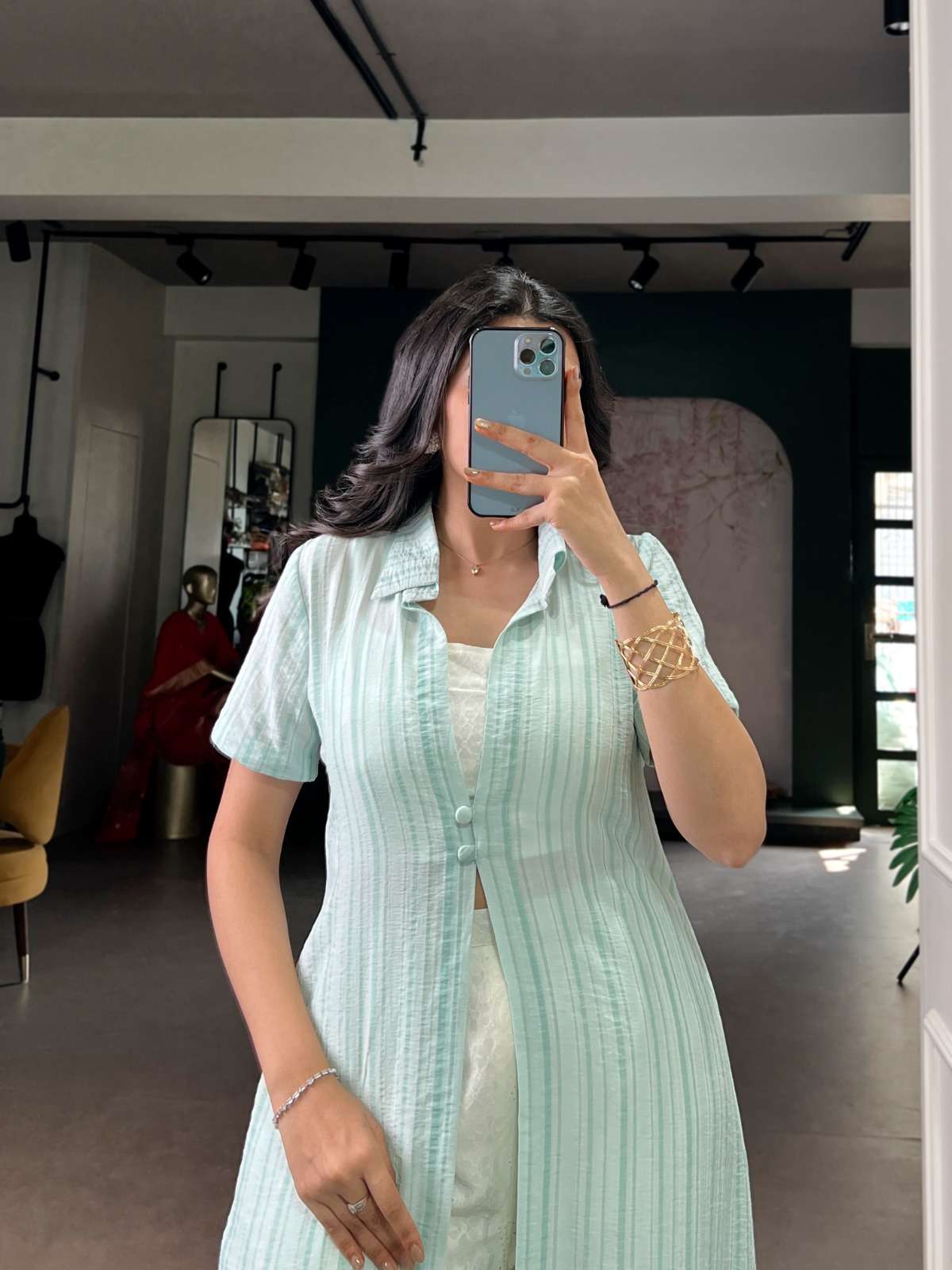 *Overlay Shrug (Stitched)* Top Fabric : N.V Texmar Top Work : Strip Top Chest : *38"(M),*40"(L), 42"(XL)* Top Length : 56 Top Sleeve Length : 9