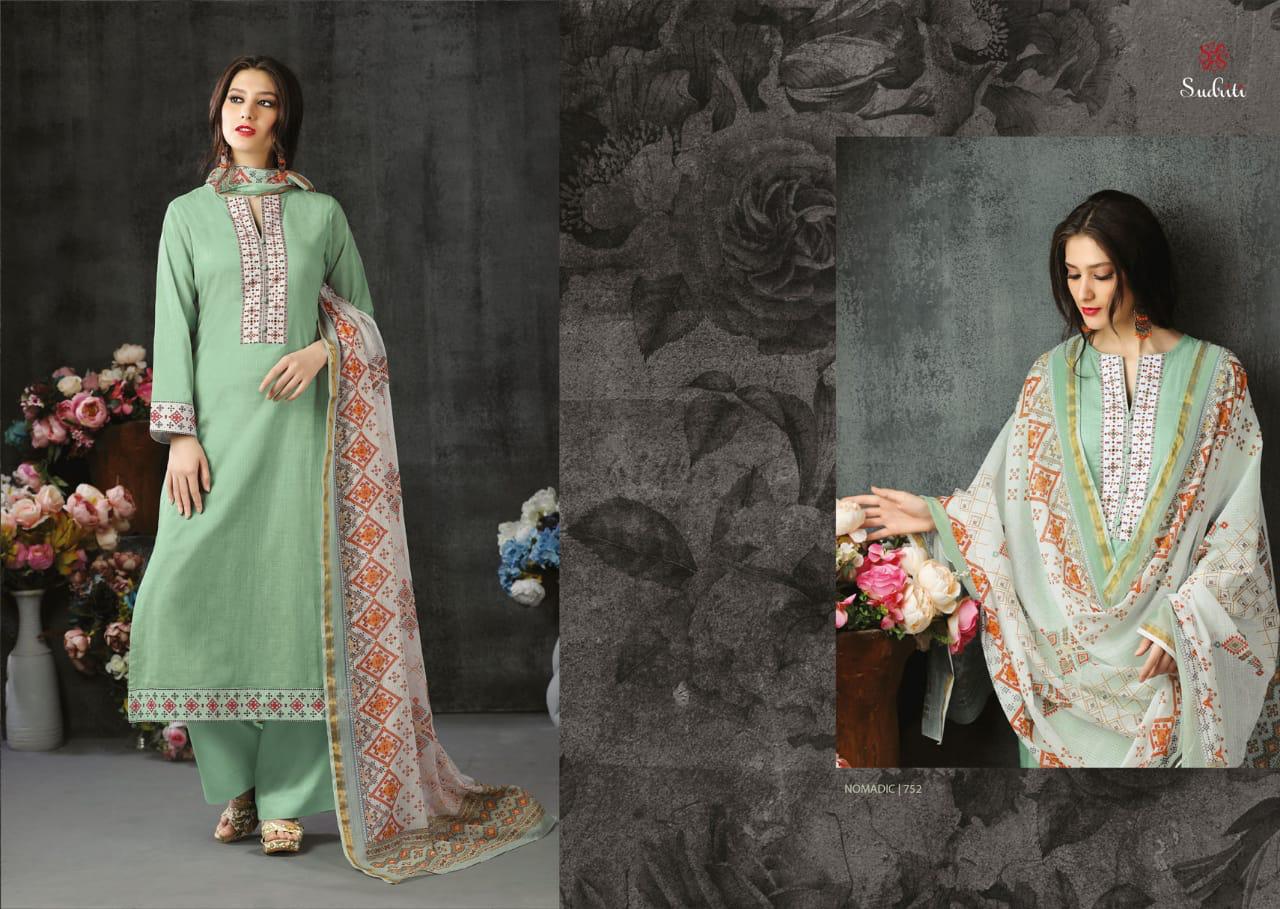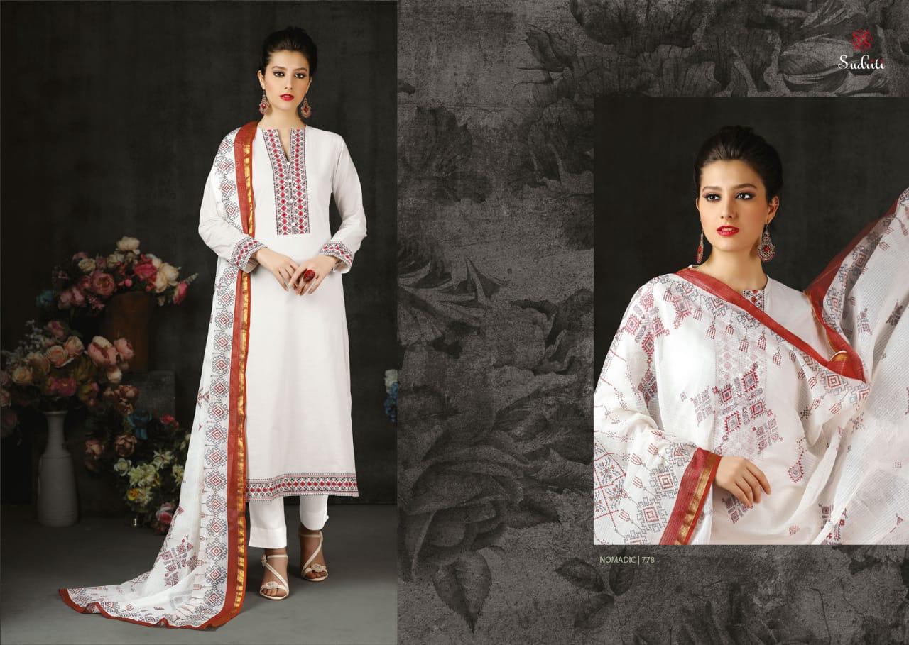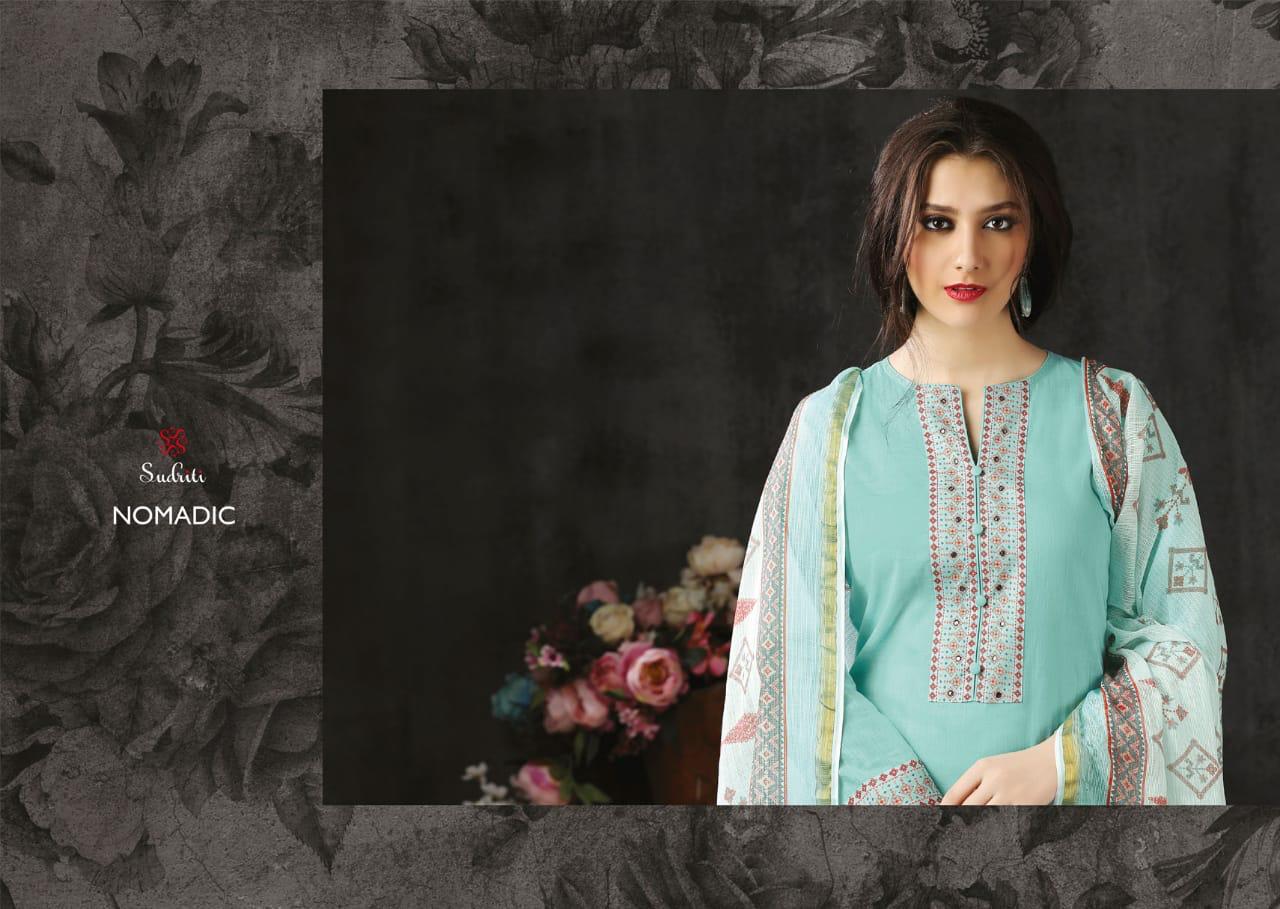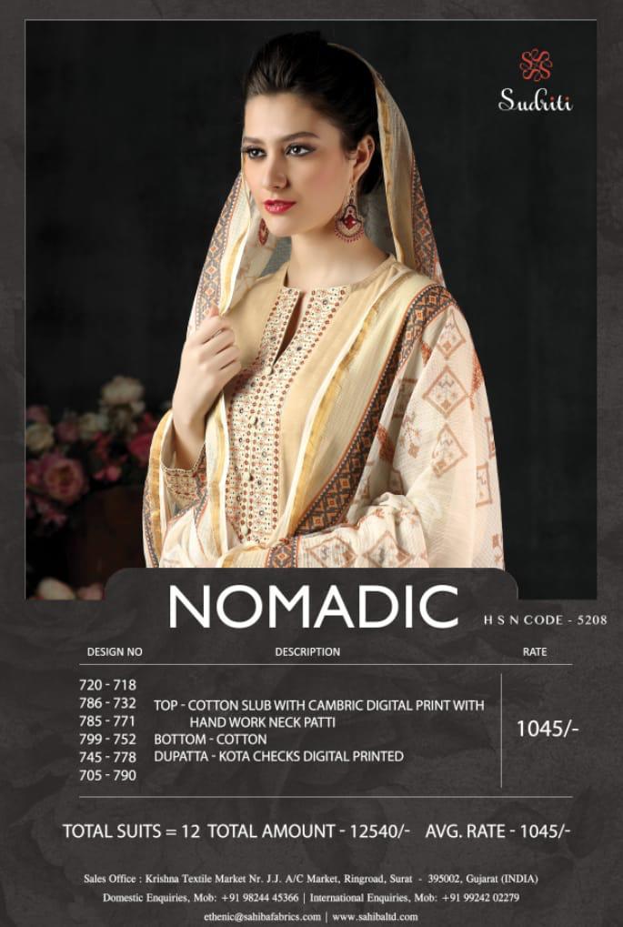 Buy Online Nomadic By Sudriti Cotton Designer Party Wear Suits Wholesale Supplier Surat 12 Pcs of Full Catalogue at Wholesale Price. Looking for Nomadic By Sudriti Cotton Designer Party Wear Suits Wholesale Supplier Surat Full Catalouge at Best Price? Buy Now Nomadic By Sudriti Cotton Designer Party Wear Suits Wholesale Supplier Surat at Wholesale Rate of Rs 12540 with Total 12 Pcs from authroized dealer and supplier of SUDRITI Brand. Cost of Each piece is just only Rs 1045 which is very low and affordable price to resale the product in your retail store ,This is Surat based Wholesale Supplier & Dealer of SUDRITI Brand. Click on Brand name to Know more about SUDRITI Brand's products.Call or Whatsapp on 9898838984 for booking or enquiry