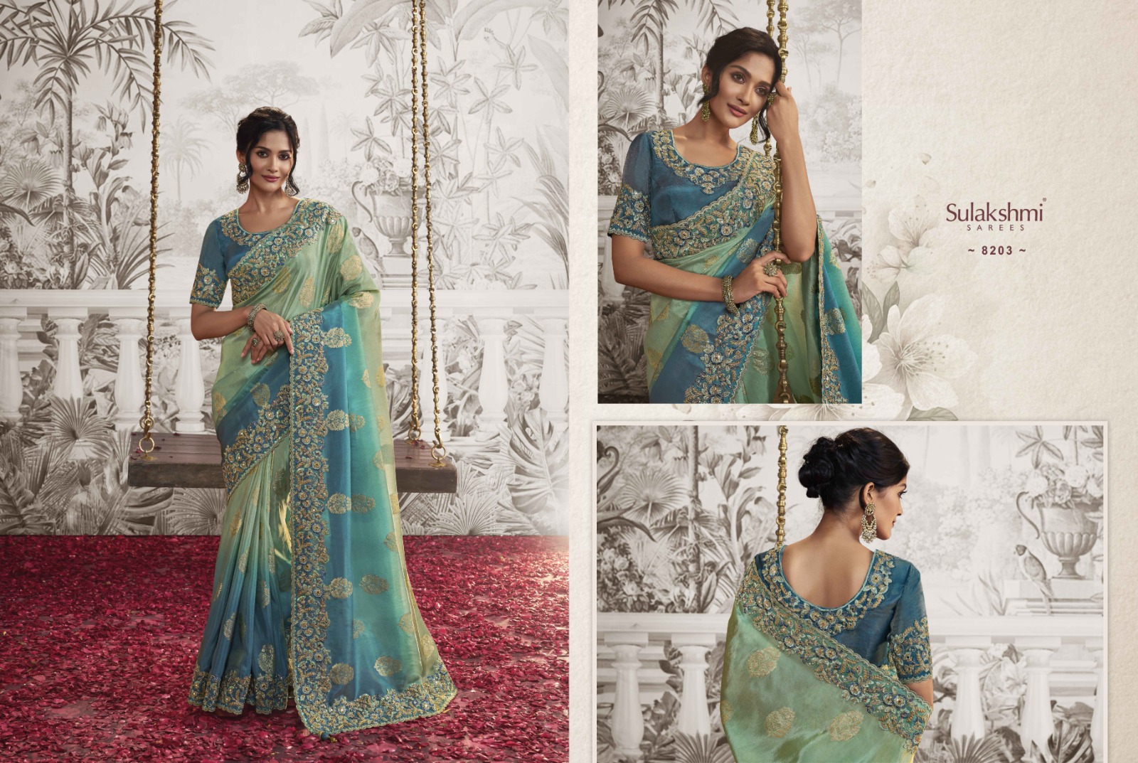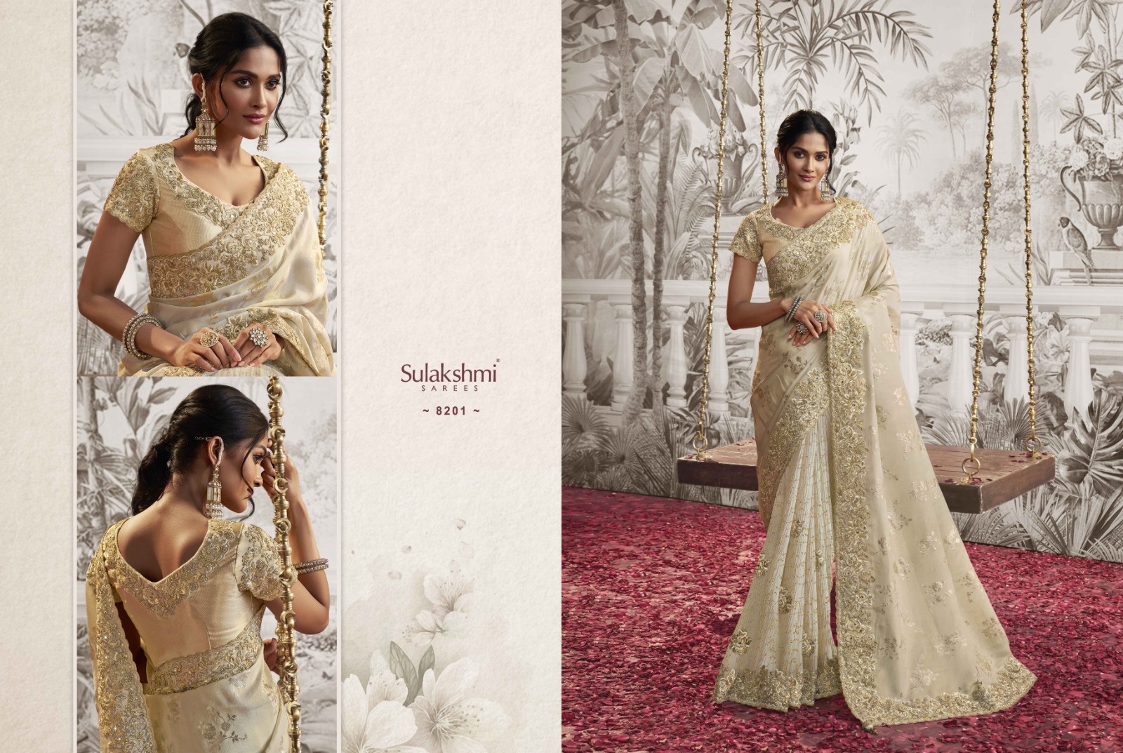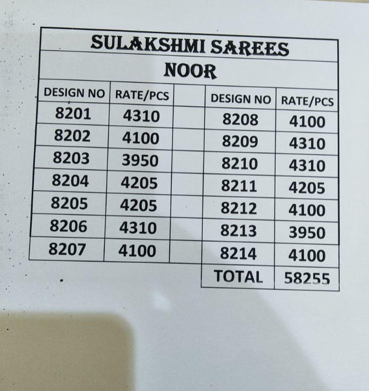 Buy Online Noor Sulakshmi Sarees Series 8201 To 8214 14 Pcs of Full Catalogue at Wholesale Price. Looking for Noor Sulakshmi Sarees Series 8201 To 8214 Full Catalouge at Best Price? Buy Now Noor Sulakshmi Sarees Series 8201 To 8214 at Wholesale Rate of Rs 59710 with Total 14 Pcs from authroized dealer and supplier of SULAKSHMI Brand. Cost of Each piece is just only Rs 4265 which is very low and affordable price to resale the product in your retail store ,This is Surat based Wholesale Supplier & Dealer of SULAKSHMI Brand. Click on Brand name to Know more about SULAKSHMI Brand's products.Call or Whatsapp on 9898838984 for booking or enquiry