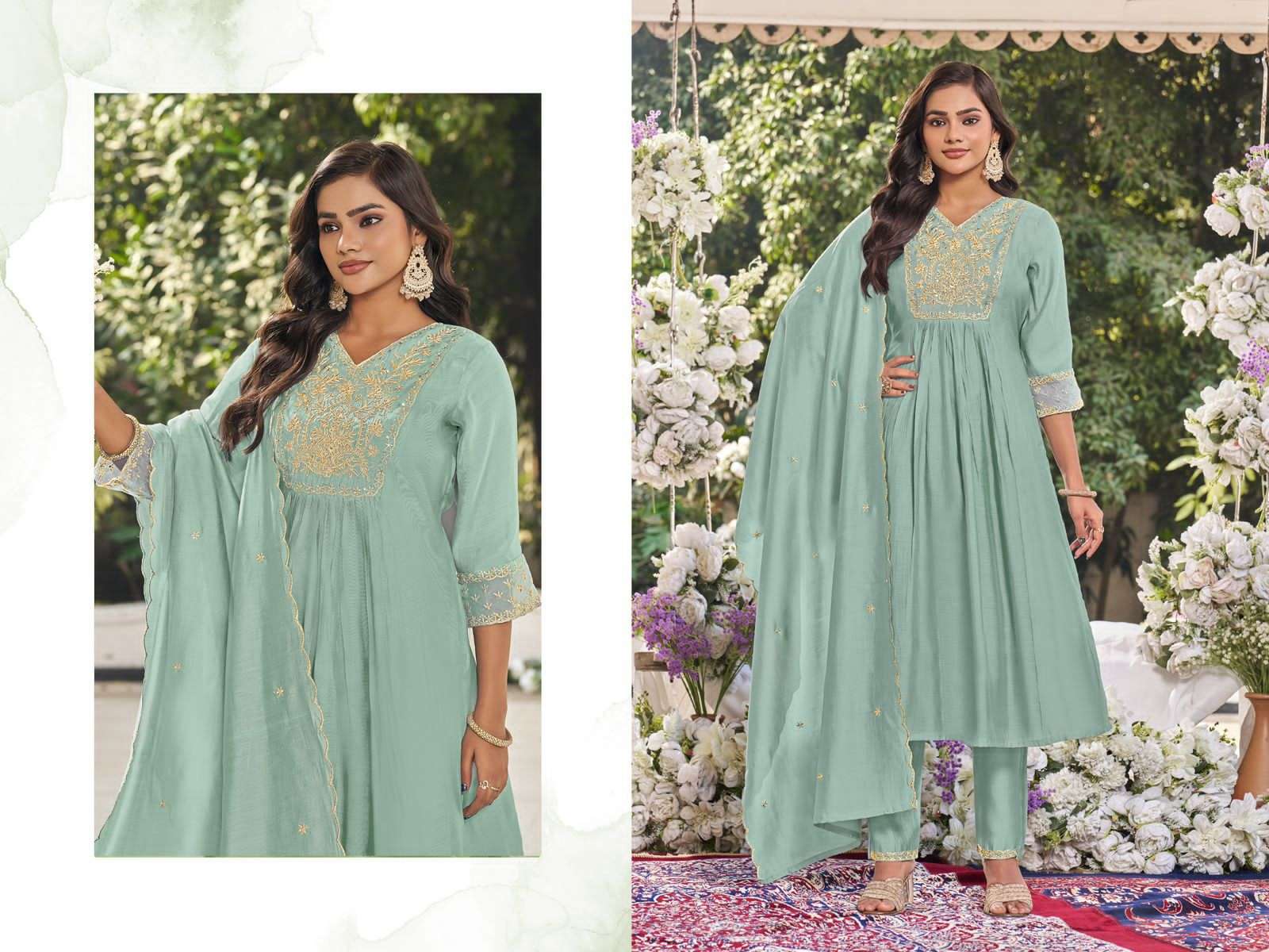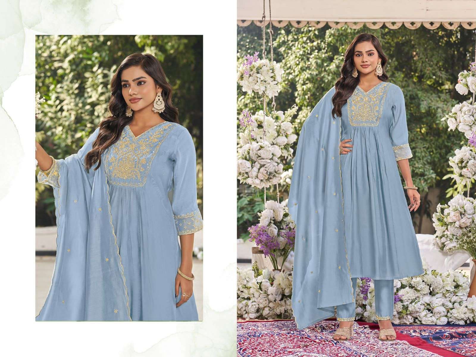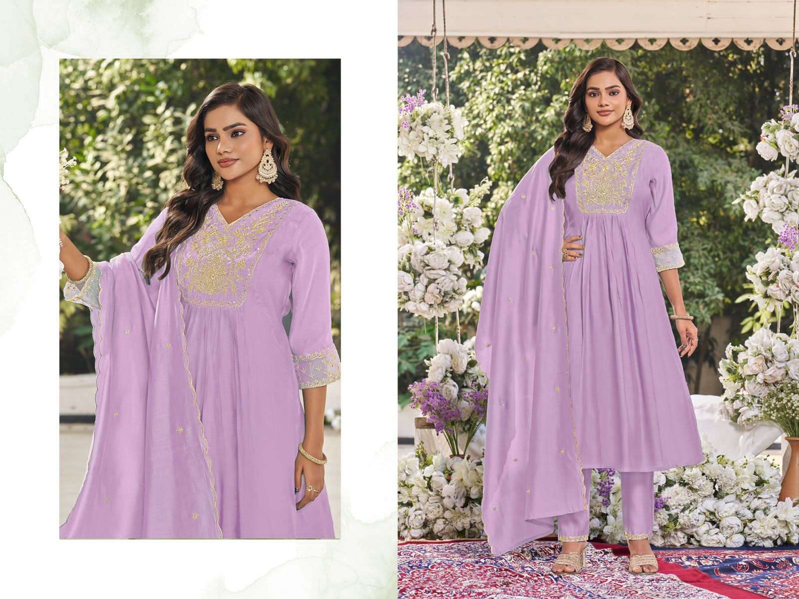 *Fabrics Details:-* *Top:- Hevy Viscos Mul Chandri With Work* *Pant:- Hevy Roman Silk With Work* *DUPPATTA:- Hevy Roman STOL Duppta With Hevy Work* *Inner:-Cotton*(Top/*Pant)* *Size- M-38, L-40, XL-42, XXL-44, 3xl-46*