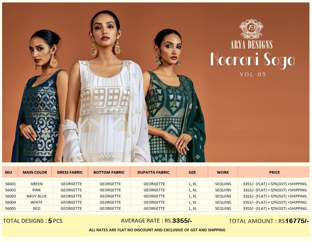 Buy Online Noorani Saga Vol 5 By Arya Designs Ready To Wear Collection Manufacturer Surat 5 Pcs of Full Catalogue at Wholesale Price. Looking for Noorani Saga Vol 5 By Arya Designs Ready To Wear Collection Manufacturer Surat Full Catalouge at Best Price? Buy Now Noorani Saga Vol 5 By Arya Designs Ready To Wear Collection Manufacturer Surat at Wholesale Rate of Rs 16775 with Total 5 Pcs from authroized dealer and supplier of Brand. Cost of Each piece is just only Rs 3355 which is very low and affordable price to resale the product in your retail store ,This is Surat based Wholesale Supplier & Dealer of Brand. Click on Brand name to Know more about Brand's products.Call or Whatsapp on 9898838984 for booking or enquiry