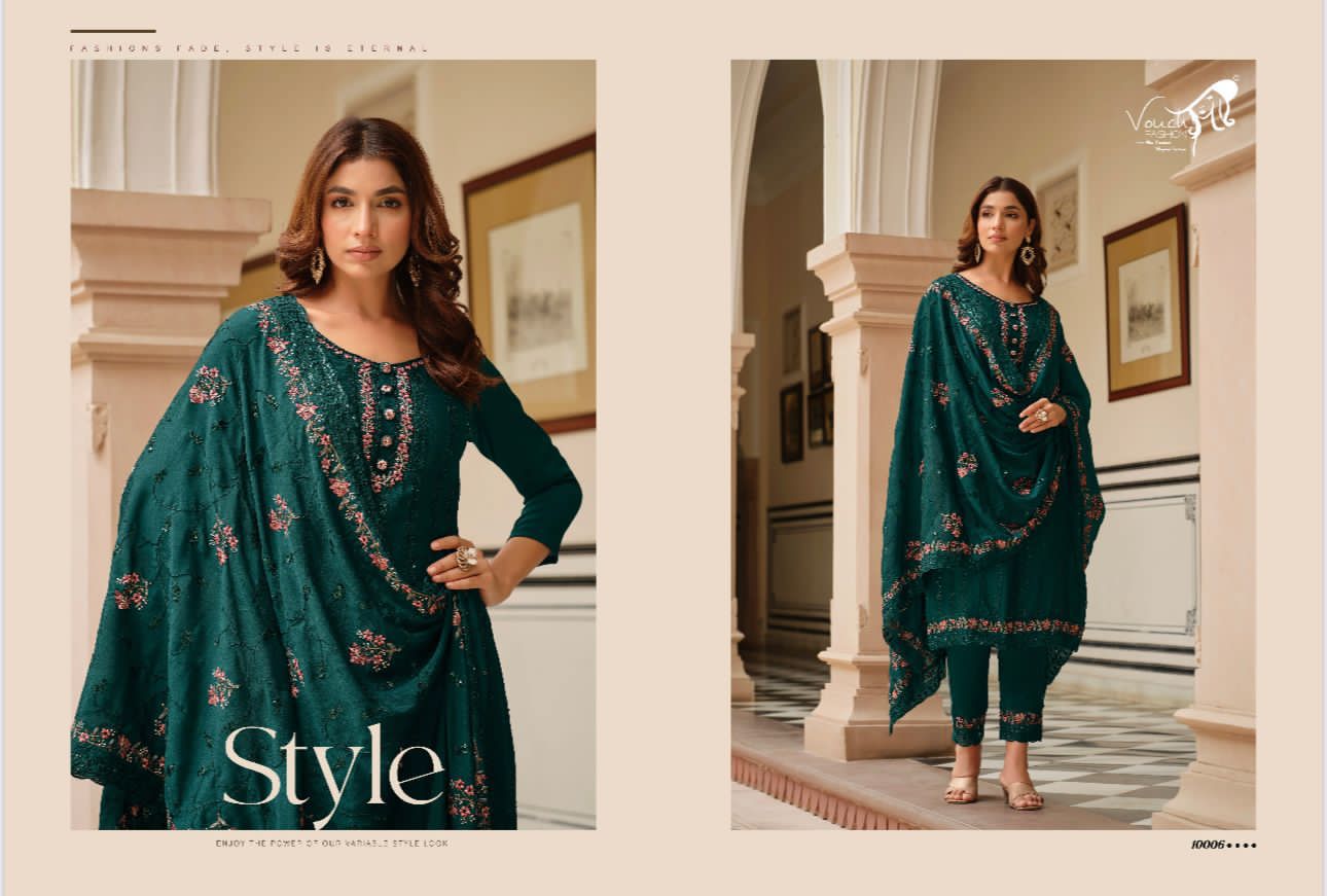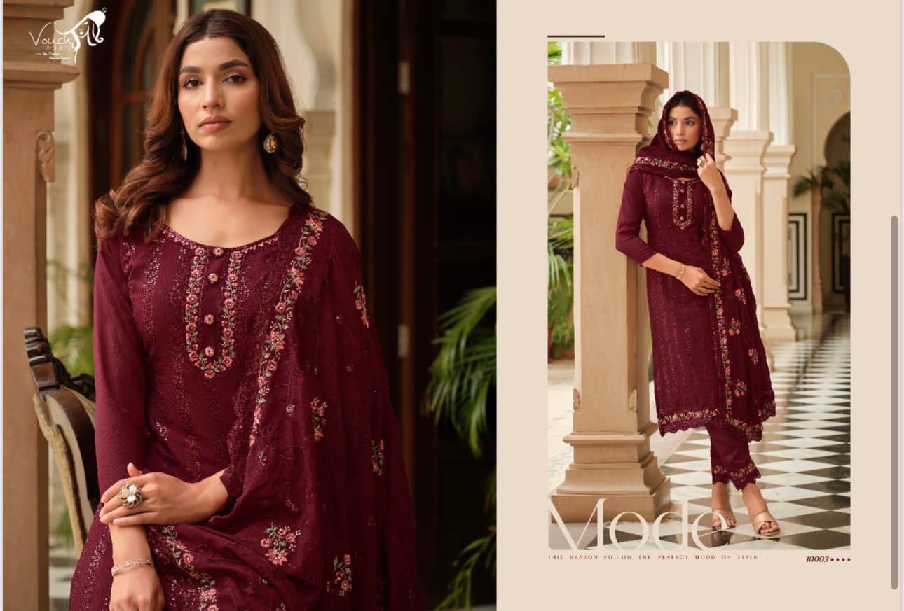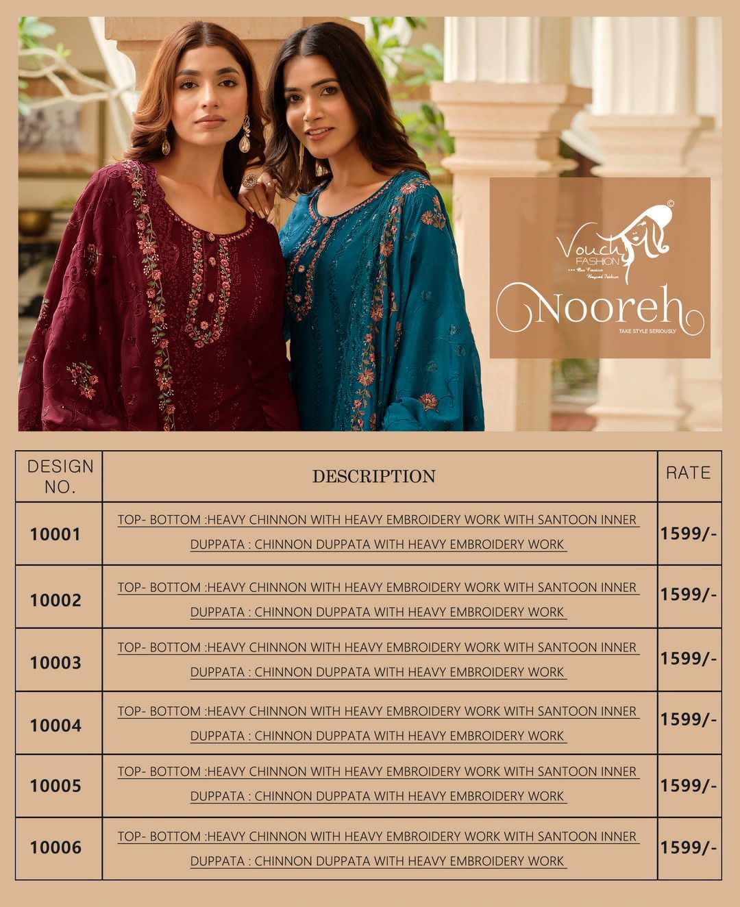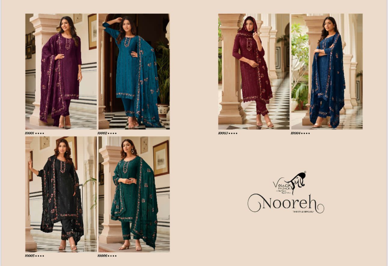 Buy Online Nooreh Vouch Fashion Chinnon Suits 6 Pcs of Full Catalogue at Wholesale Price. Looking for Nooreh Vouch Fashion Chinnon Suits Full Catalouge at Best Price? Buy Now Nooreh Vouch Fashion Chinnon Suits at Wholesale Rate of Rs 9594 with Total 6 Pcs from authroized dealer and supplier of Brand. Cost of Each piece is just only Rs 1599 which is very low and affordable price to resale the product in your retail store ,This is Surat based Wholesale Supplier & Dealer of Brand. Click on Brand name to Know more about Brand's products.Call or Whatsapp on 9898838984 for booking or enquiry