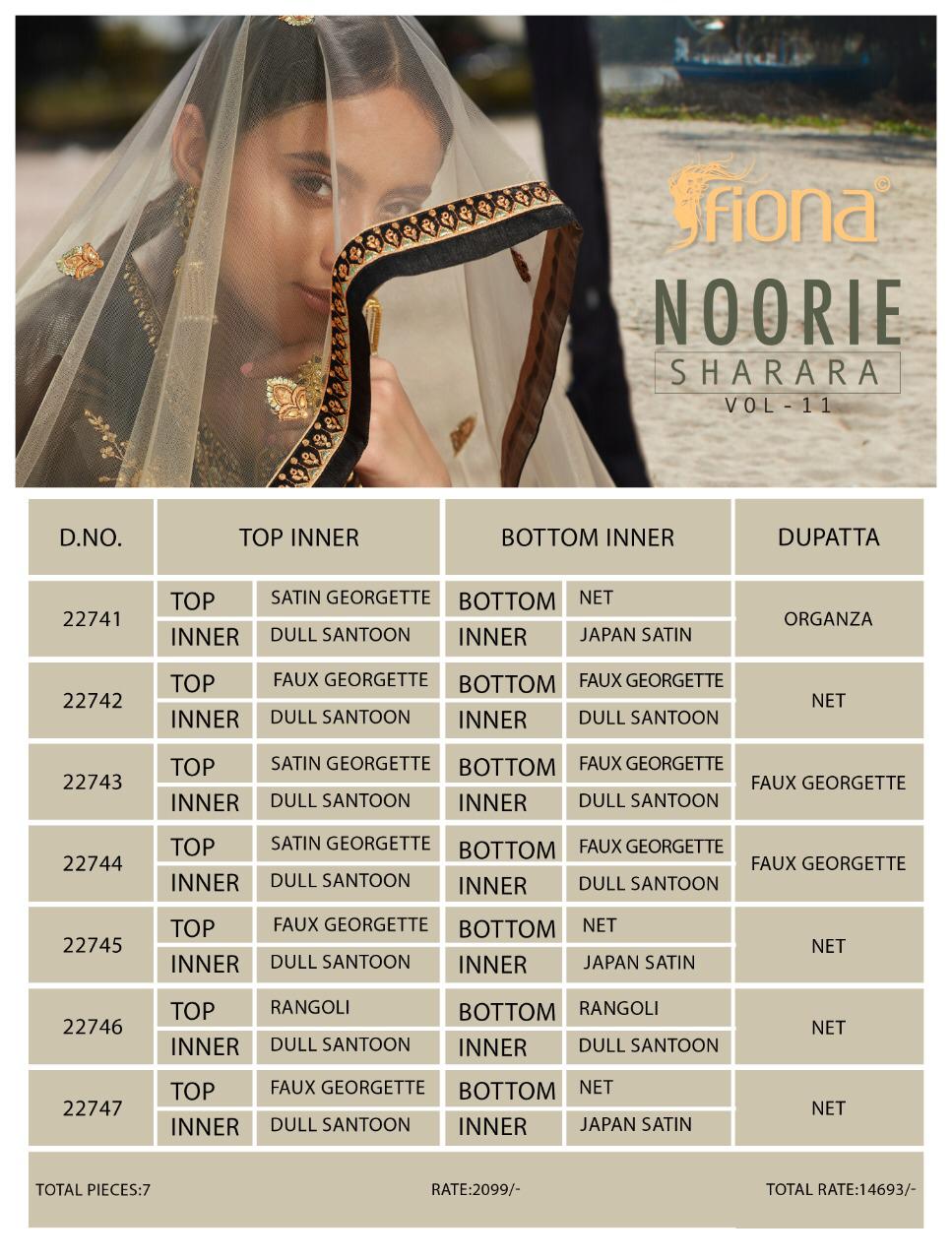 Brand - Fiona . Catlog name - NOORIE SHARARAR VOL -11. Rate- 2099 per Pcs . GST extra . Set & loose & singel . Series - 22741 to 22747. Single extra 100 |