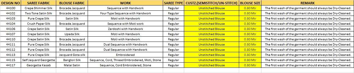 *PRICE:-* *44100-2405/-* *44102-2605/-* *44103-2475/-* *44104-2445/-* *44106-2515/-* *44107-2395/-* *44110-2455/-* *44111-2445/-* *44112-2475/-* *44113-2415/-* *44115-2095/-* *44117-2085/-* +*5% GST EXTRA*