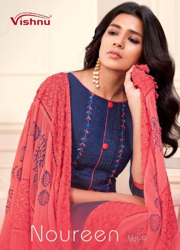 Buy Online Noureen Vol 9 By Vishnu Impex Wholesaler Supplier From Surat 6 Pcs of Full Catalogue at Wholesale Price. Looking for Noureen Vol 9 By Vishnu Impex Wholesaler Supplier From Surat Full Catalouge at Best Price? Buy Now Noureen Vol 9 By Vishnu Impex Wholesaler Supplier From Surat at Wholesale Rate of Rs 4500 with Total 6 Pcs from authroized dealer and supplier of VISHNU IMPEX Brand. Cost of Each piece is just only Rs 750 which is very low and affordable price to resale the product in your retail store ,This is Surat based Wholesale Supplier & Dealer of VISHNU IMPEX Brand. Click on Brand name to Know more about VISHNU IMPEX Brand's products.Call or Whatsapp on 9898838984 for booking or enquiry
