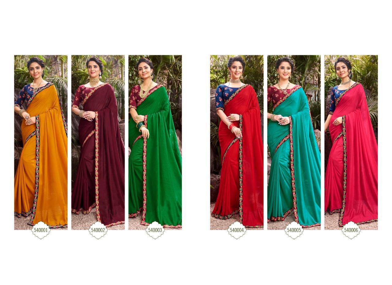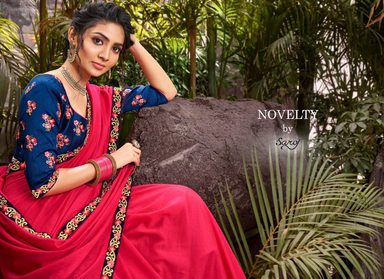 *Novelty by Saroj * Rate -1095 per pcs . Delivery 3-4 days Fabric: Vichitra Silk with Velvet Patti embroidery work. Blouse: Designer Blouse, Banglori Silk. 6 Designs in set . Set to set. GST 5 Percent Extra |