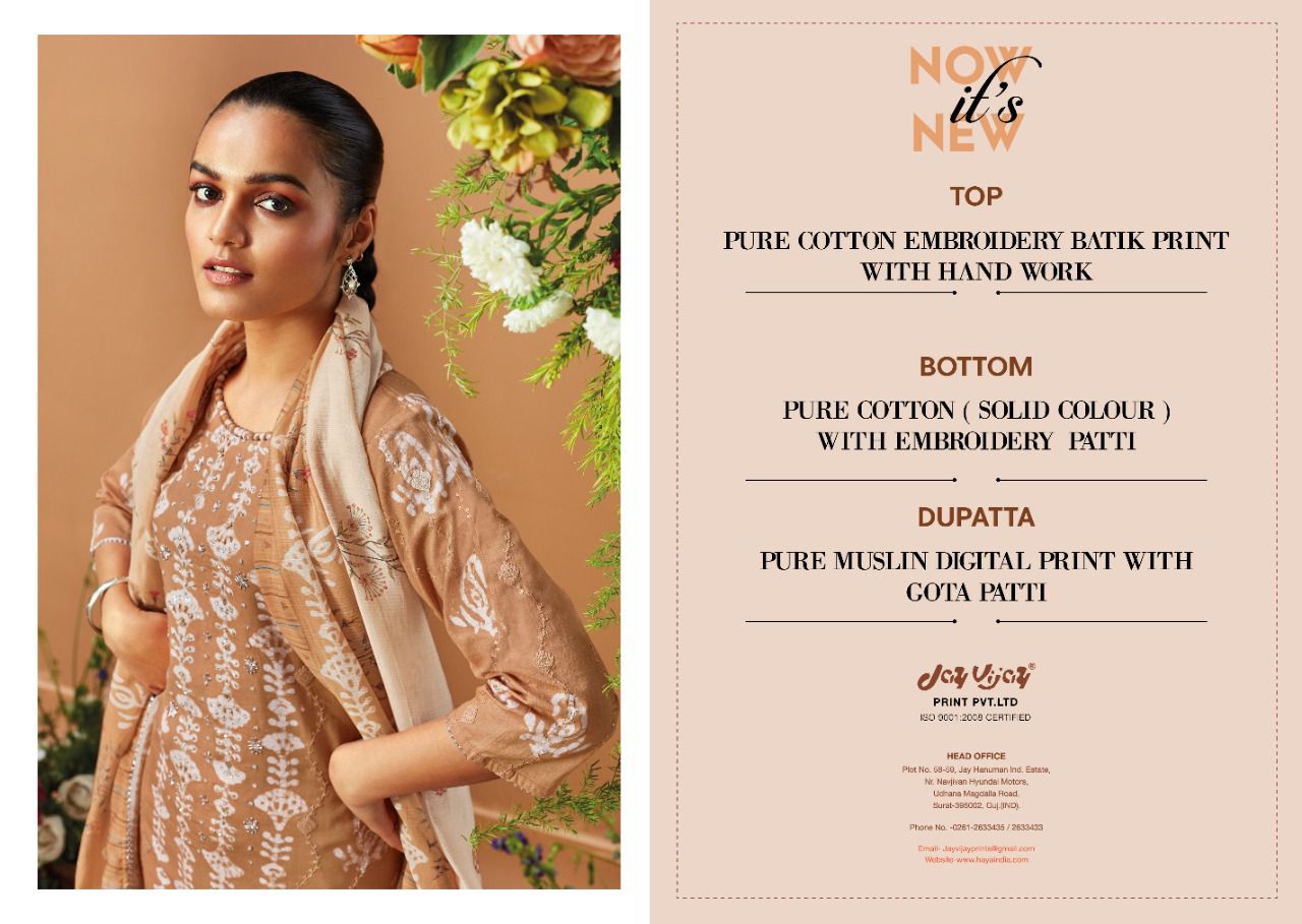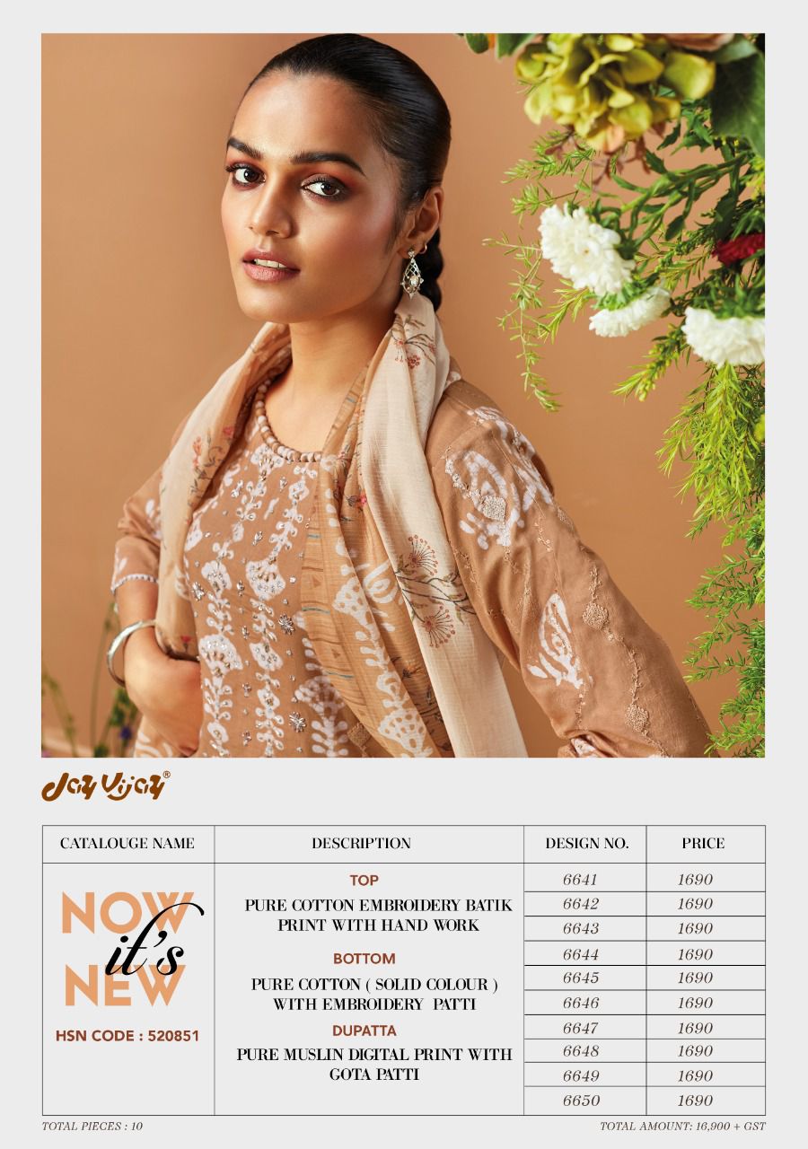 Buy Online Now Its New By Jay Vijay Designer Cotton Suit Wholesale Supplier Traders In Surat 10 Pcs of Full Catalogue at Wholesale Price. Looking for Now Its New By Jay Vijay Designer Cotton Suit Wholesale Supplier Traders In Surat Full Catalouge at Best Price? Buy Now Now Its New By Jay Vijay Designer Cotton Suit Wholesale Supplier Traders In Surat at Wholesale Rate of Rs 16900 with Total 10 Pcs from authroized dealer and supplier of JAY VIJAY Brand. Cost of Each piece is just only Rs 1690 which is very low and affordable price to resale the product in your retail store ,This is Surat based Wholesale Supplier & Dealer of JAY VIJAY Brand. Click on Brand name to Know more about JAY VIJAY Brand's products.Call or Whatsapp on 9898838984 for booking or enquiry
