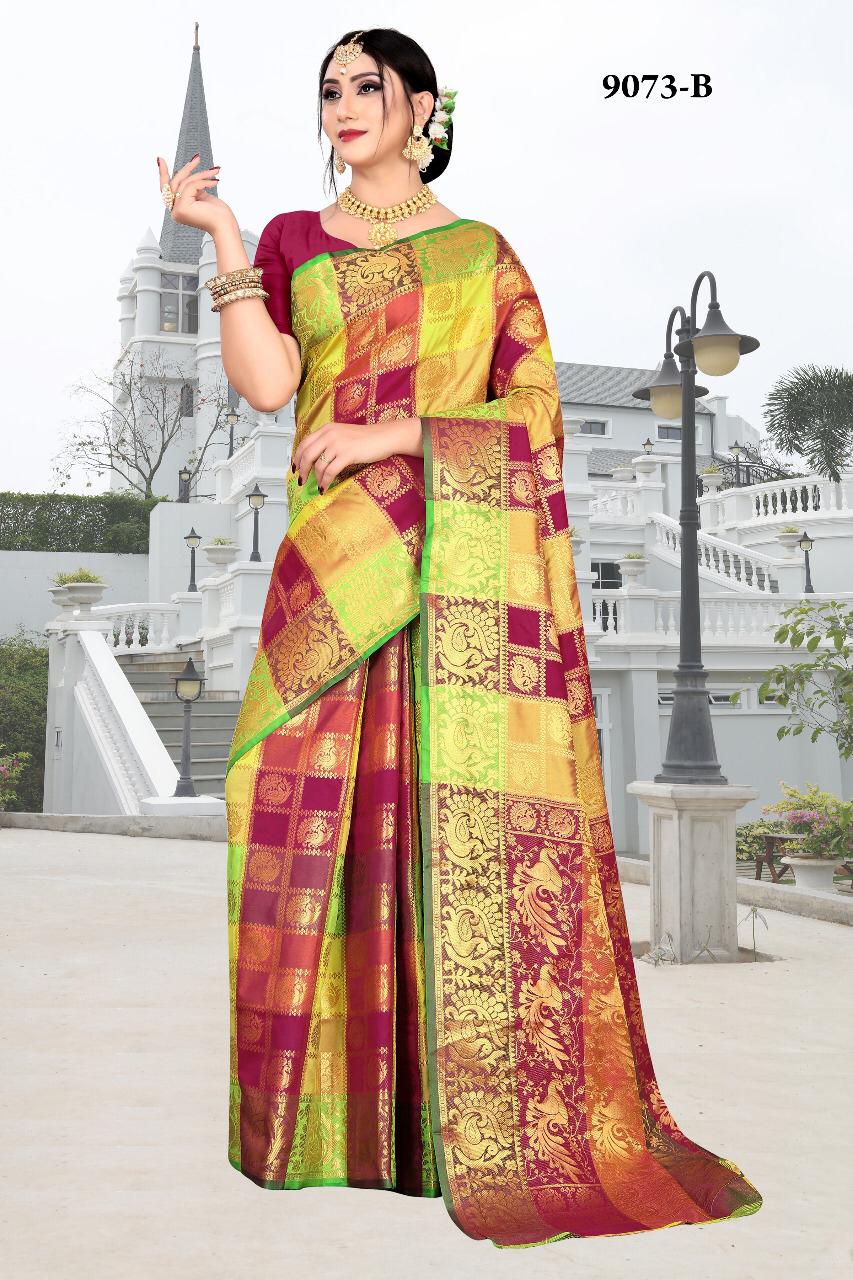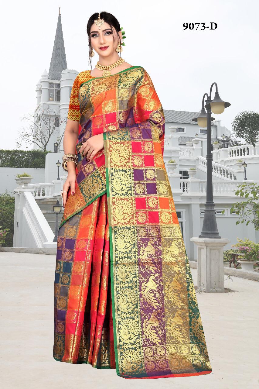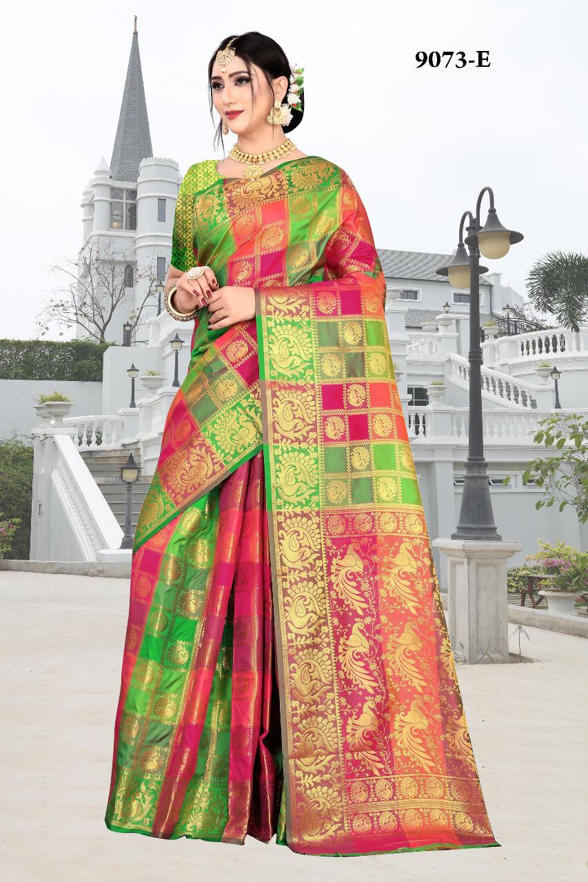 Brand - NP . Dear Sir, Please Find New Catlog Fabric Detail: ART SILK SAREE WITH hEAVY PALLU AND BROCKED BLOUSE Price: 795 per Pcs . GST 5 Percent Extra. Catlog name - 9073 A to 9073 F. Total 6 Pcs colour set. * set & loose & Singel * Single extra 100 Delivery from tomorrow * set & loose & Singel * |