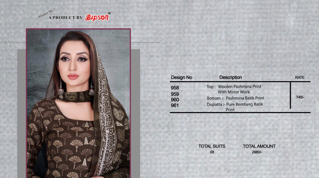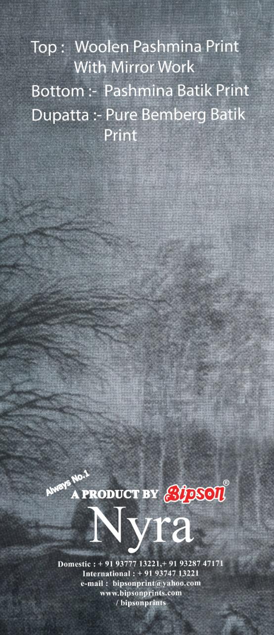 Buy Online Nyra By Bipson Pashmina Dress Materials Wholesale Supplier Surat 8 Pcs of Full Catalogue at Wholesale Price. Looking for Nyra By Bipson Pashmina Dress Materials Wholesale Supplier Surat Full Catalouge at Best Price? Buy Now Nyra By Bipson Pashmina Dress Materials Wholesale Supplier Surat at Wholesale Rate of Rs 5960 with Total 8 Pcs from authroized dealer and supplier of Brand. Cost of Each piece is just only Rs 745 which is very low and affordable price to resale the product in your retail store ,This is Surat based Wholesale Supplier & Dealer of Brand. Click on Brand name to Know more about Brand's products.Call or Whatsapp on 9898838984 for booking or enquiry