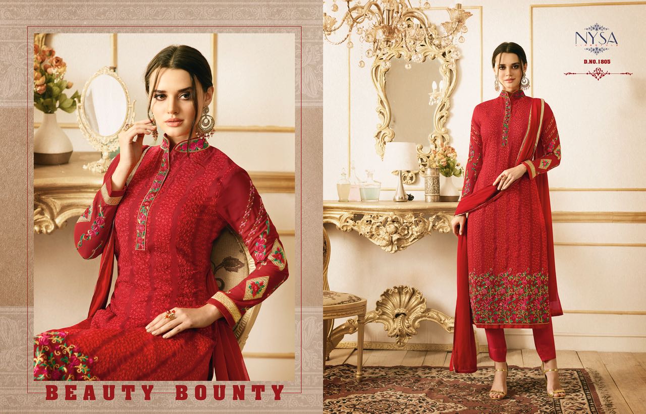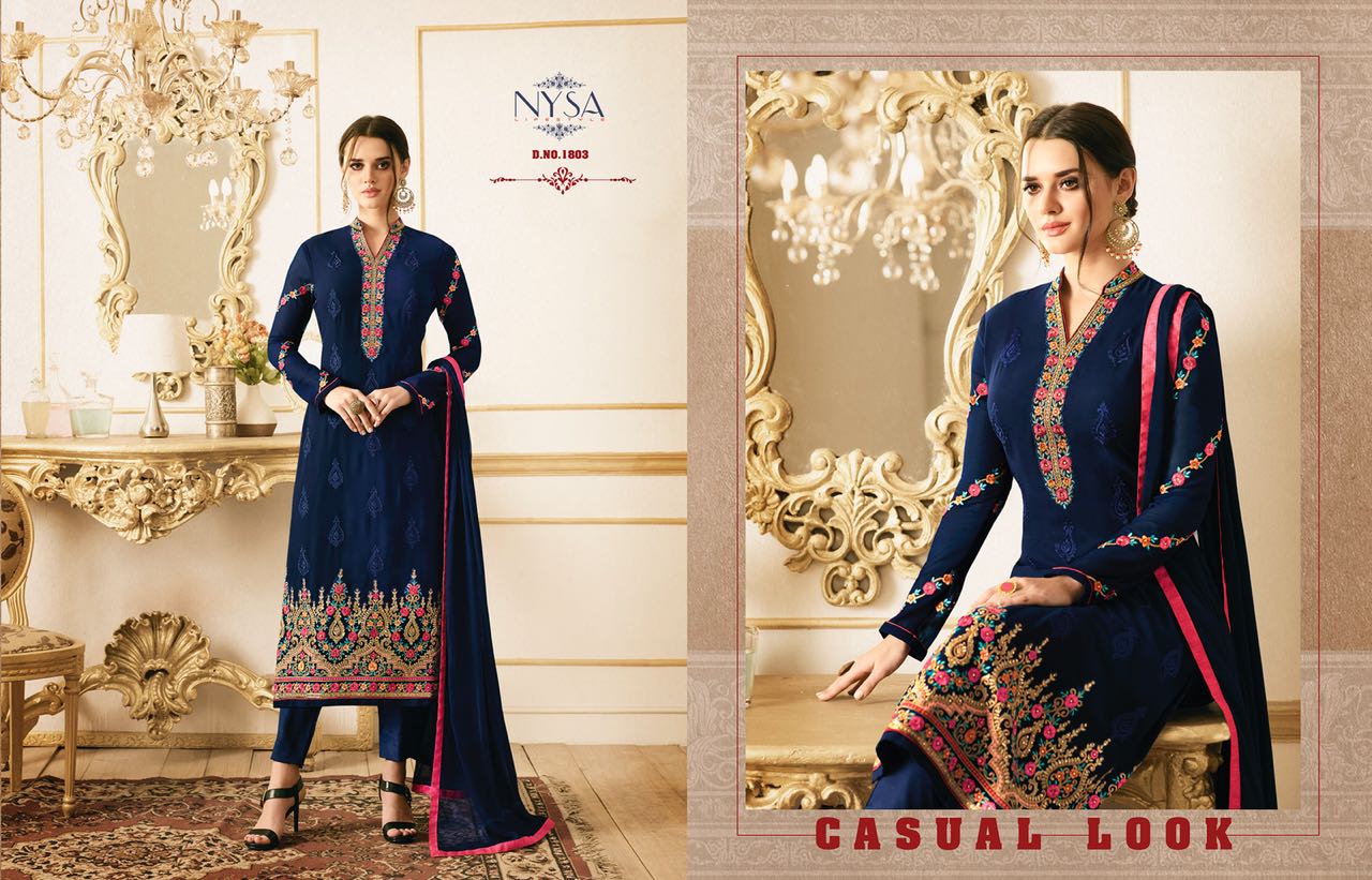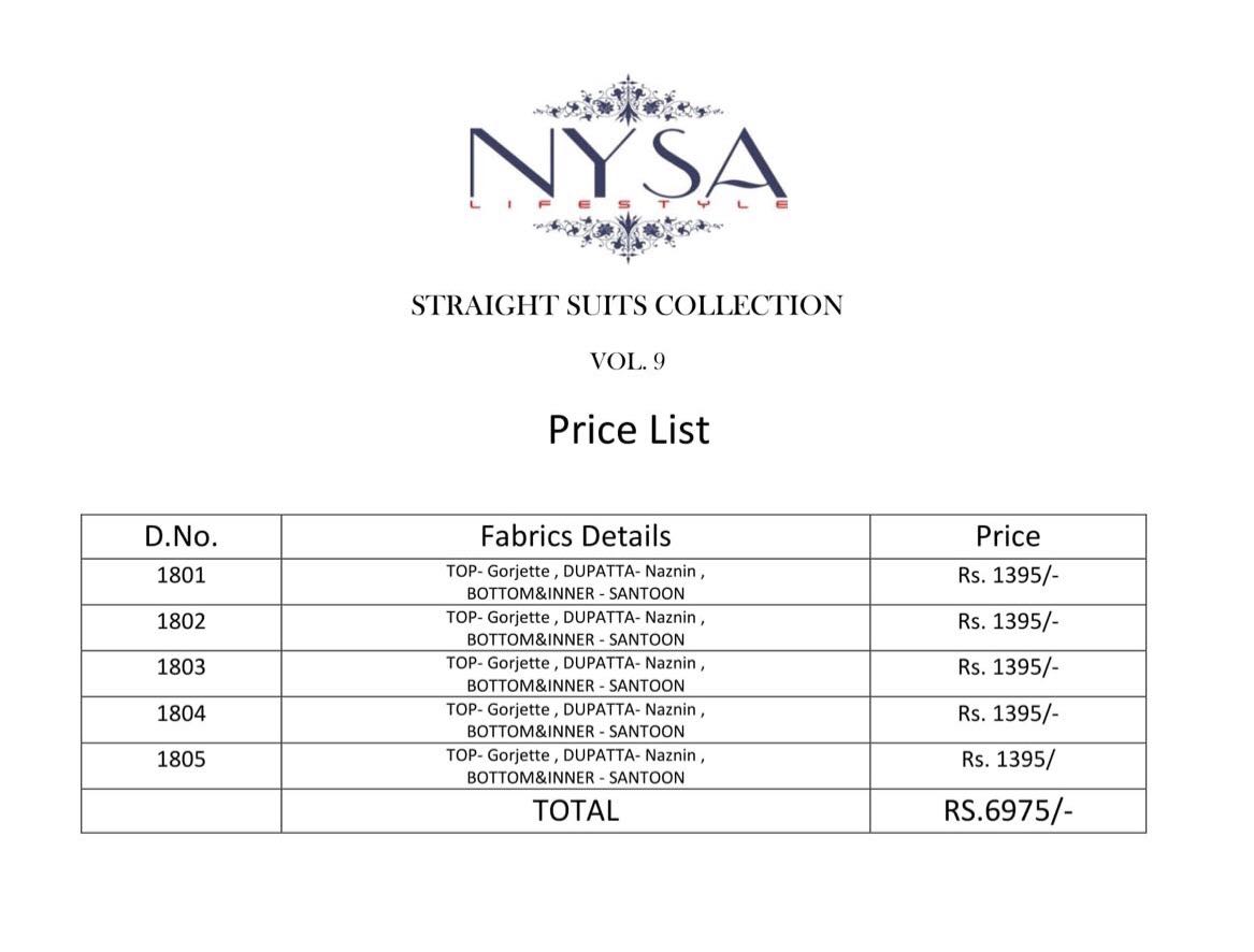 Buy Online Nysa Straight Suits Collection Vol 9 1801 Series Fancy Suits 5 Pcs of Full Catalogue at Wholesale Price. Looking for Nysa Straight Suits Collection Vol 9 1801 Series Fancy Suits Full Catalouge at Best Price? Buy Now Nysa Straight Suits Collection Vol 9 1801 Series Fancy Suits at Wholesale Rate of Rs 6975 with Total 5 Pcs from authroized dealer and supplier of NYSA LIFESTYLE Brand. Cost of Each piece is just only Rs 1395 which is very low and affordable price to resale the product in your retail store ,This is Surat based Wholesale Supplier & Dealer of NYSA LIFESTYLE Brand. Click on Brand name to Know more about NYSA LIFESTYLE Brand's products.Call or Whatsapp on 9898838984 for booking or enquiry