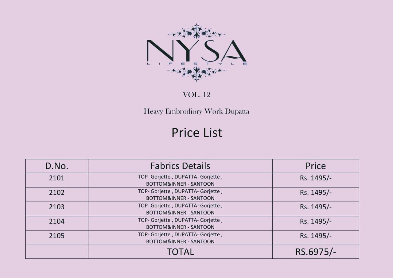 Buy Online Nysa Vol 12 By Nysa Lifestyle Georgette Embedded Designer Party Wear Suits Wholesale Supplier And Dealer Gujarat 5 Pcs of Full Catalogue at Wholesale Price. Looking for Nysa Vol 12 By Nysa Lifestyle Georgette Embedded Designer Party Wear Suits Wholesale Supplier And Dealer Gujarat Full Catalouge at Best Price? Buy Now Nysa Vol 12 By Nysa Lifestyle Georgette Embedded Designer Party Wear Suits Wholesale Supplier And Dealer Gujarat at Wholesale Rate of Rs 7475 with Total 5 Pcs from authroized dealer and supplier of NYSA LIFESTYLE Brand. Cost of Each piece is just only Rs 1495 which is very low and affordable price to resale the product in your retail store ,This is Surat based Wholesale Supplier & Dealer of NYSA LIFESTYLE Brand. Click on Brand name to Know more about NYSA LIFESTYLE Brand's products.Call or Whatsapp on 9898838984 for booking or enquiry