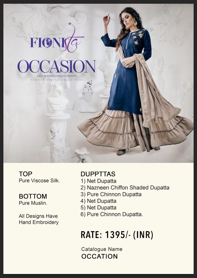 Buy Online Occasion By Fionista Series 1151 To 1156 Ready To Wear Sharara Suits Wholesale Supplier And Dealer Surat 6 Pcs of Full Catalogue at Wholesale Price. Looking for Occasion By Fionista Series 1151 To 1156 Ready To Wear Sharara Suits Wholesale Supplier And Dealer Surat Full Catalouge at Best Price? Buy Now Occasion By Fionista Series 1151 To 1156 Ready To Wear Sharara Suits Wholesale Supplier And Dealer Surat at Wholesale Rate of Rs 8370 with Total 6 Pcs from authroized dealer and supplier of Brand. Cost of Each piece is just only Rs 1395 which is very low and affordable price to resale the product in your retail store ,This is Surat based Wholesale Supplier & Dealer of Brand. Click on Brand name to Know more about Brand's products.Call or Whatsapp on 9898838984 for booking or enquiry