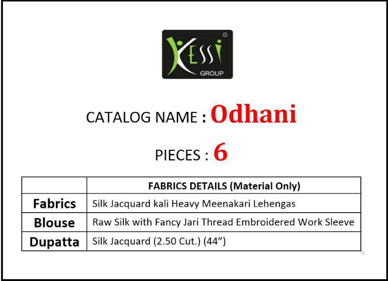 Buy Online Odhani By Kessi Series 5831 To 4836 Designer Lehngas Wholesale Supplier And Dealer Gujarat 6 Pcs of Full Catalogue at Wholesale Price. Looking for Odhani By Kessi Series 5831 To 4836 Designer Lehngas Wholesale Supplier And Dealer Gujarat Full Catalouge at Best Price? Buy Now Odhani By Kessi Series 5831 To 4836 Designer Lehngas Wholesale Supplier And Dealer Gujarat at Wholesale Rate of Rs 14994 with Total 6 Pcs from authroized dealer and supplier of KESSI Brand. Cost of Each piece is just only Rs 2499 which is very low and affordable price to resale the product in your retail store ,This is Surat based Wholesale Supplier & Dealer of KESSI Brand. Click on Brand name to Know more about KESSI Brand's products.Call or Whatsapp on 9898838984 for booking or enquiry