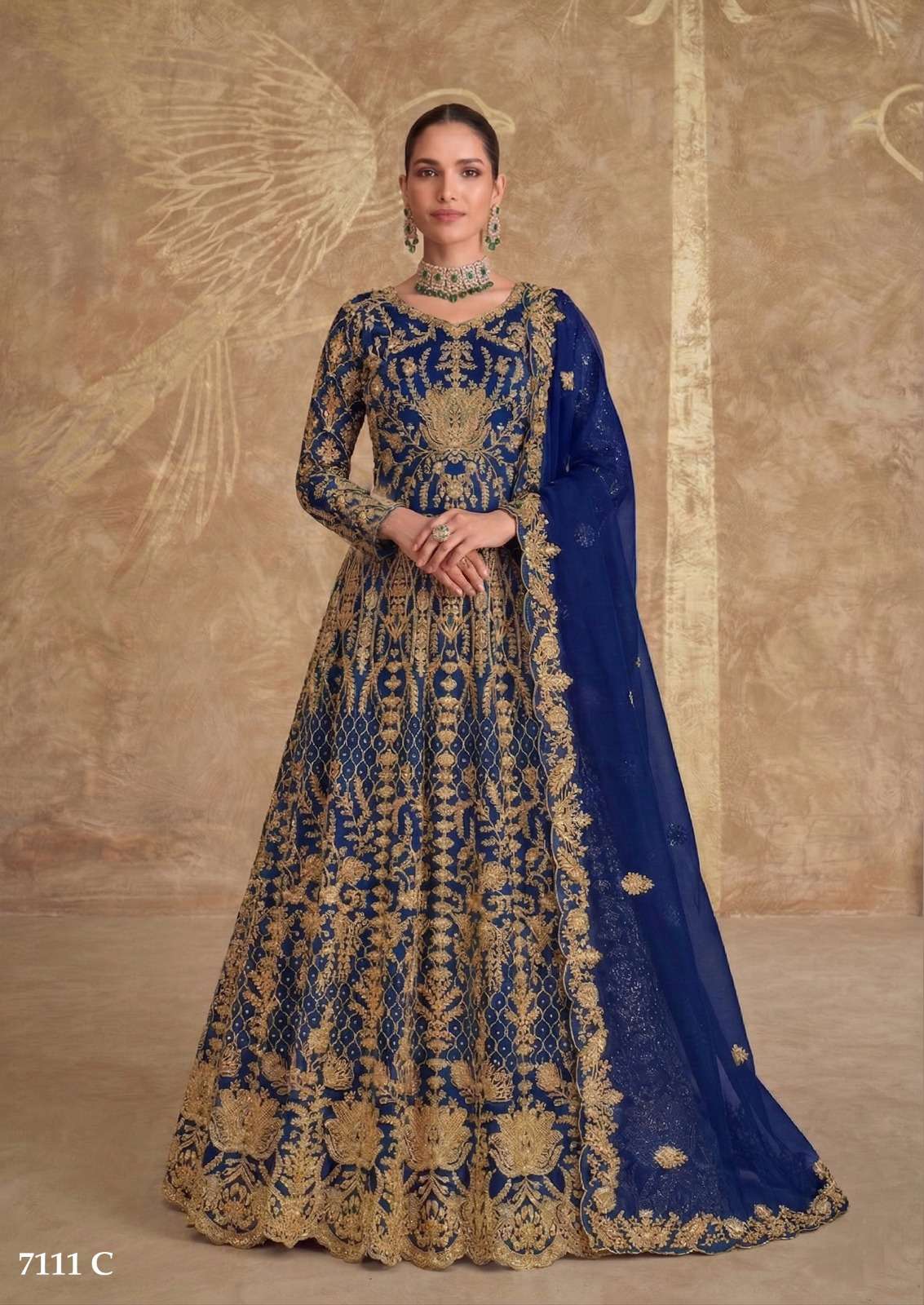 *TOP* - Pure Butterfly Net. *Work* - Front & Back Heavy Coding & Stone Work. *DUPTTA* - Pure Butterfly Net. *INNER /BOTTOM* - Crap Cotton ------------------------------- D.NO. RATE. *7111- 2999/- ₹*