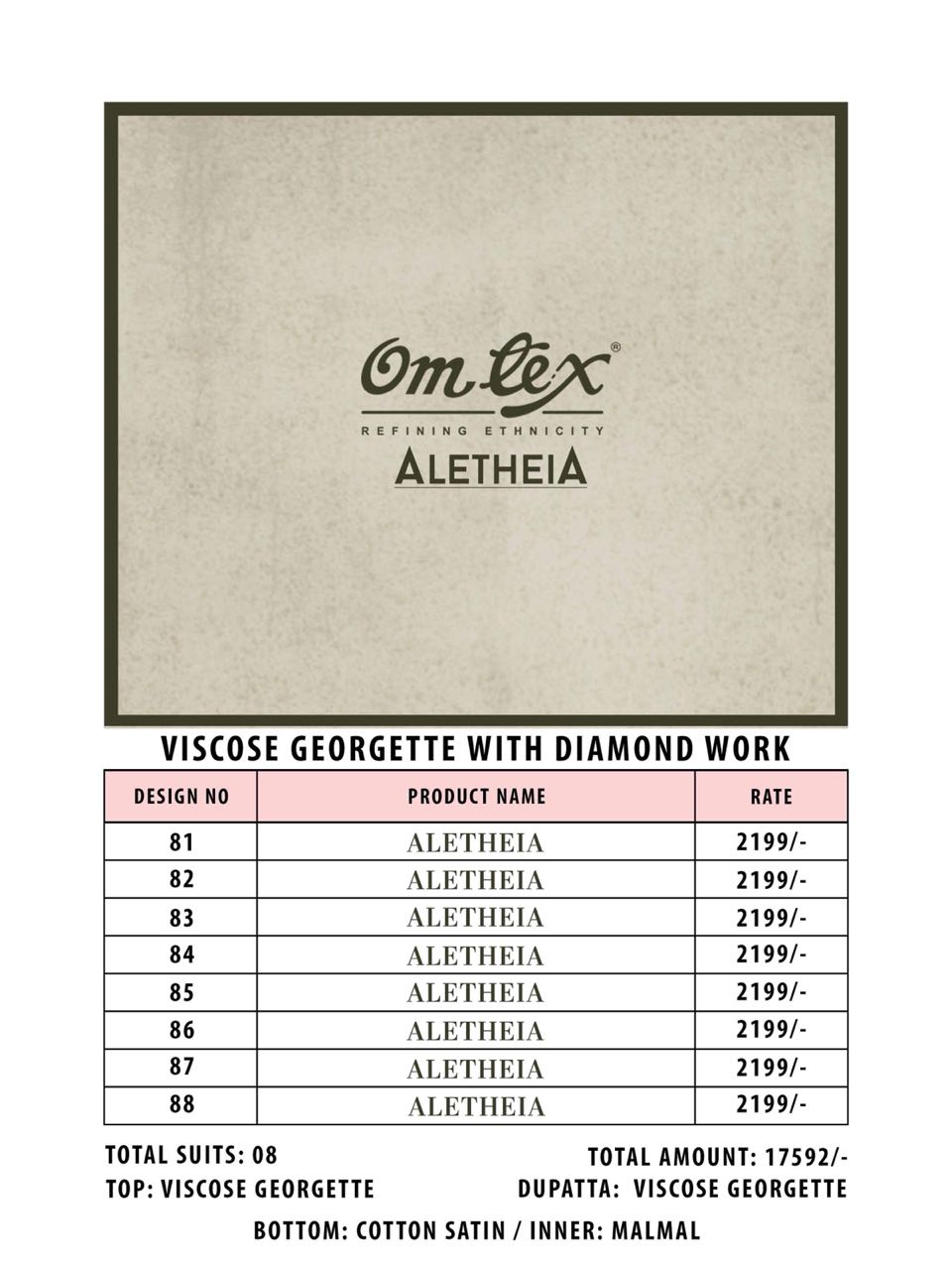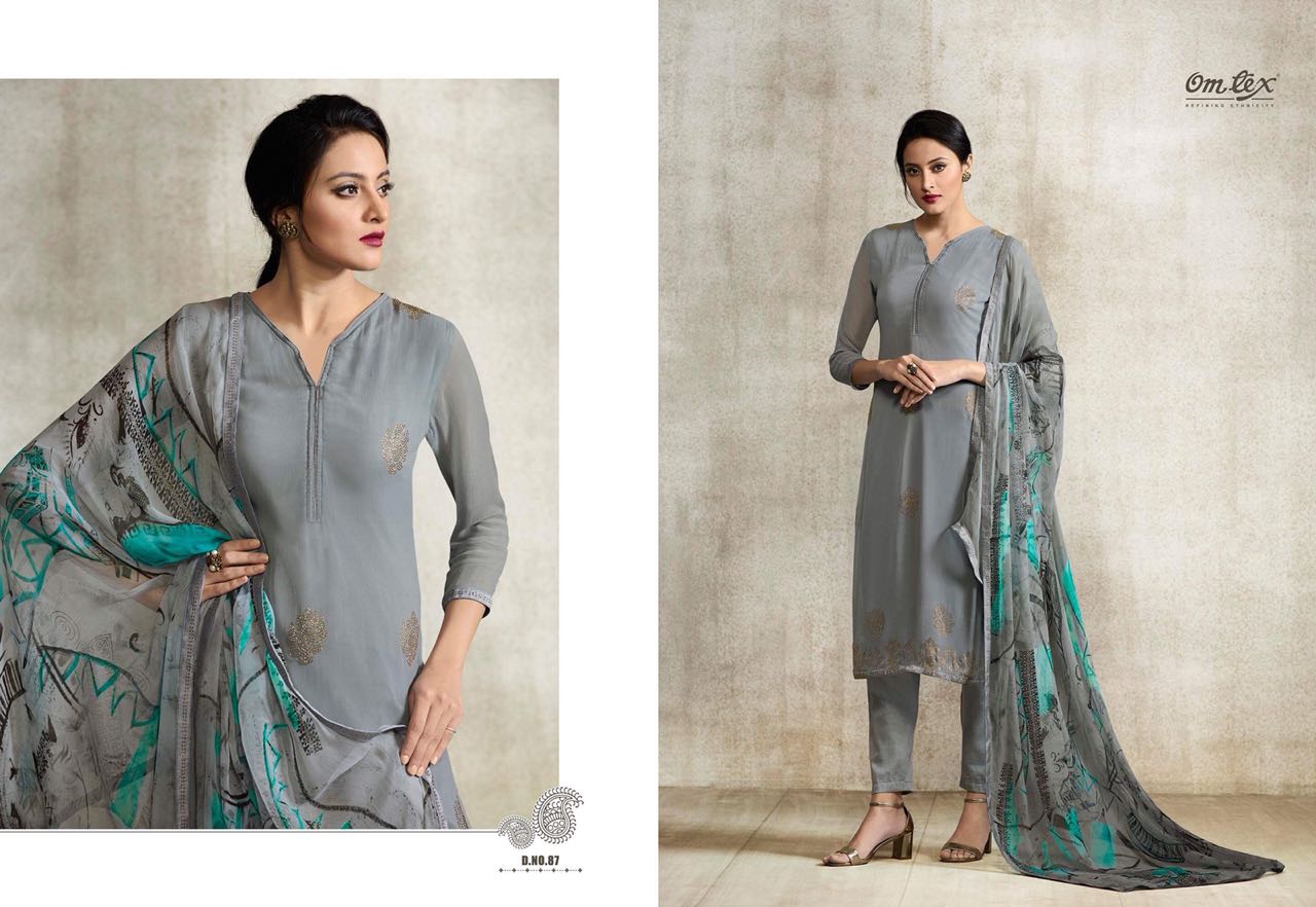 Buy Online Omtex Aletheia 81 Series Fancy Viscose Georgette Salwar Kameez Wholesale Dealer Surat 8 Pcs of Full Catalogue at Wholesale Price. Looking for Omtex Aletheia 81 Series Fancy Viscose Georgette Salwar Kameez Wholesale Dealer Surat Full Catalouge at Best Price? Buy Now Omtex Aletheia 81 Series Fancy Viscose Georgette Salwar Kameez Wholesale Dealer Surat at Wholesale Rate of Rs 17592 with Total 8 Pcs from authroized dealer and supplier of OM TEX Brand. Cost of Each piece is just only Rs 2199 which is very low and affordable price to resale the product in your retail store ,This is Surat based Wholesale Supplier & Dealer of OM TEX Brand. Click on Brand name to Know more about OM TEX Brand's products.Call or Whatsapp on 9898838984 for booking or enquiry