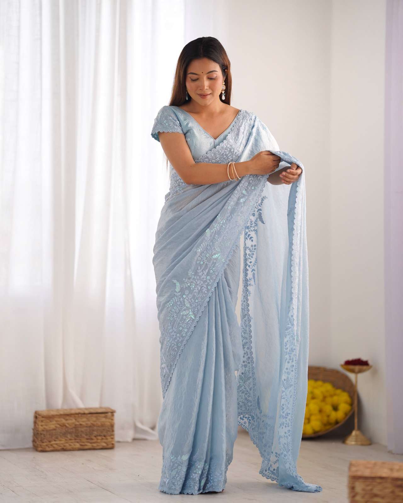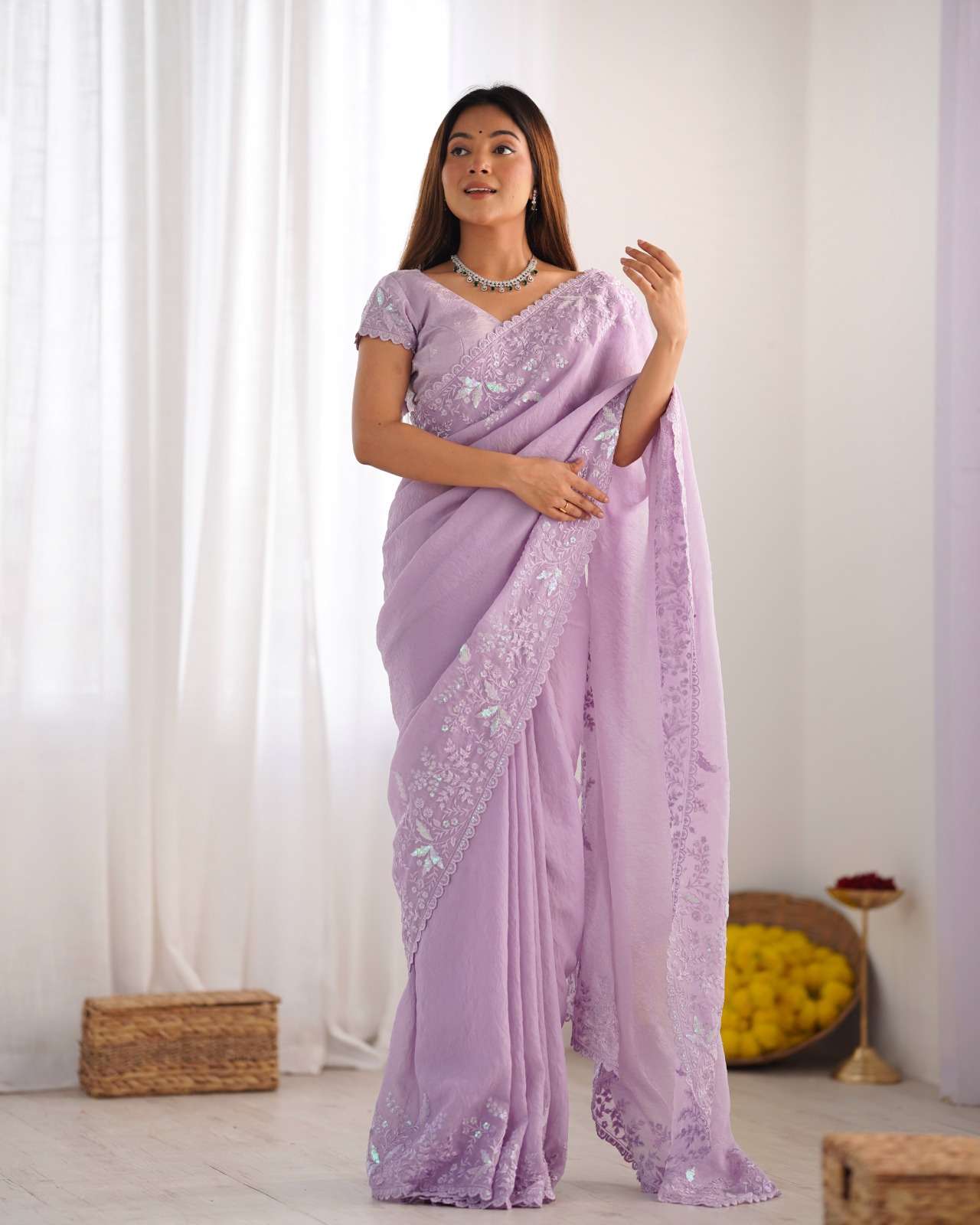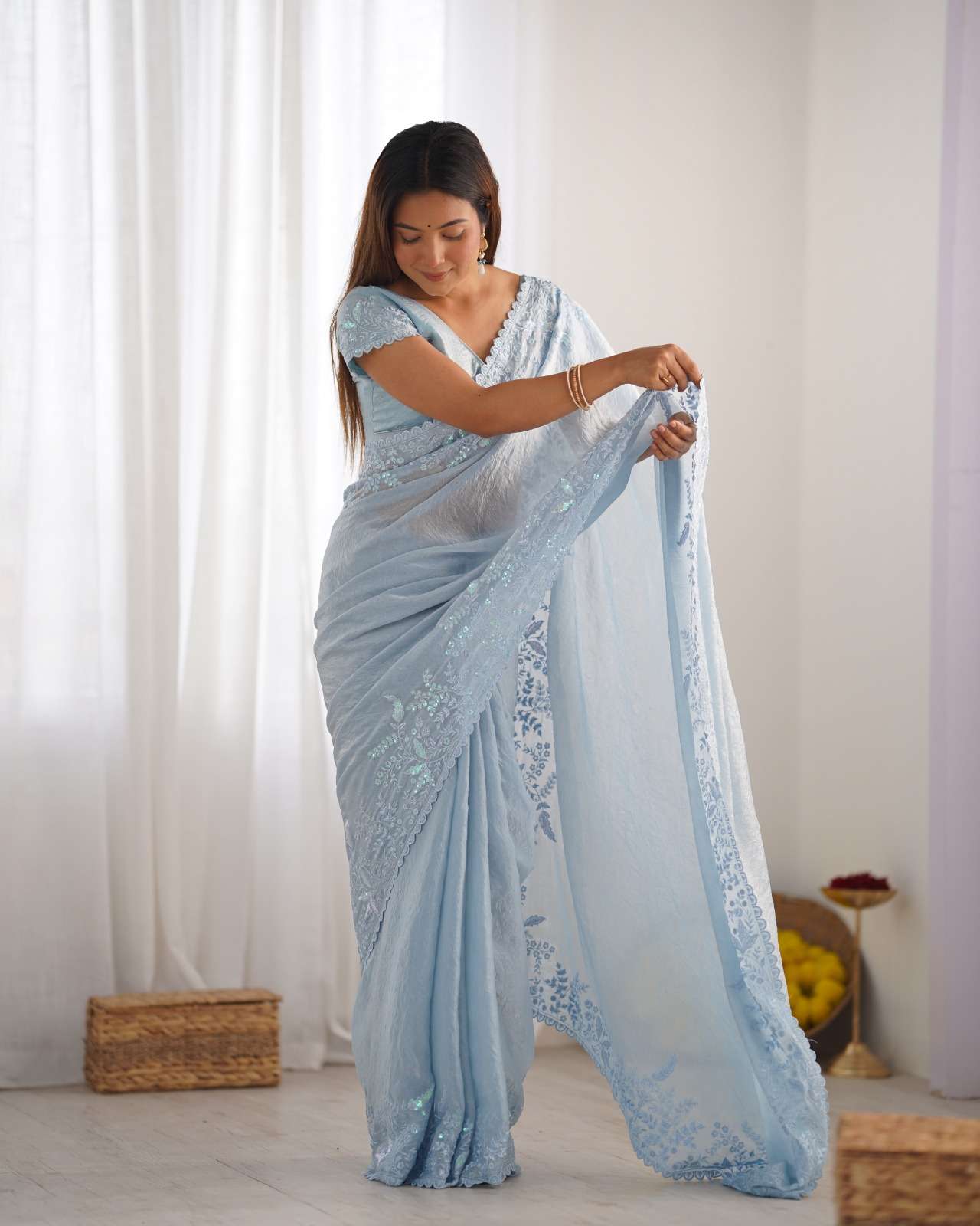 Catalog Name : *Onam* No of Pcs : 2 Fabric : Crushed Fandy tissue Silk Work : Superb Soft Refined Crushed Fandy tissue Silk Saree With Lucknowi Thread Sequencing Work in saree with viscos thread and sequence paired with beautiful embroidery sequencing work blouse (unstich) *In our saree all embroidery work done by viscos thread only*