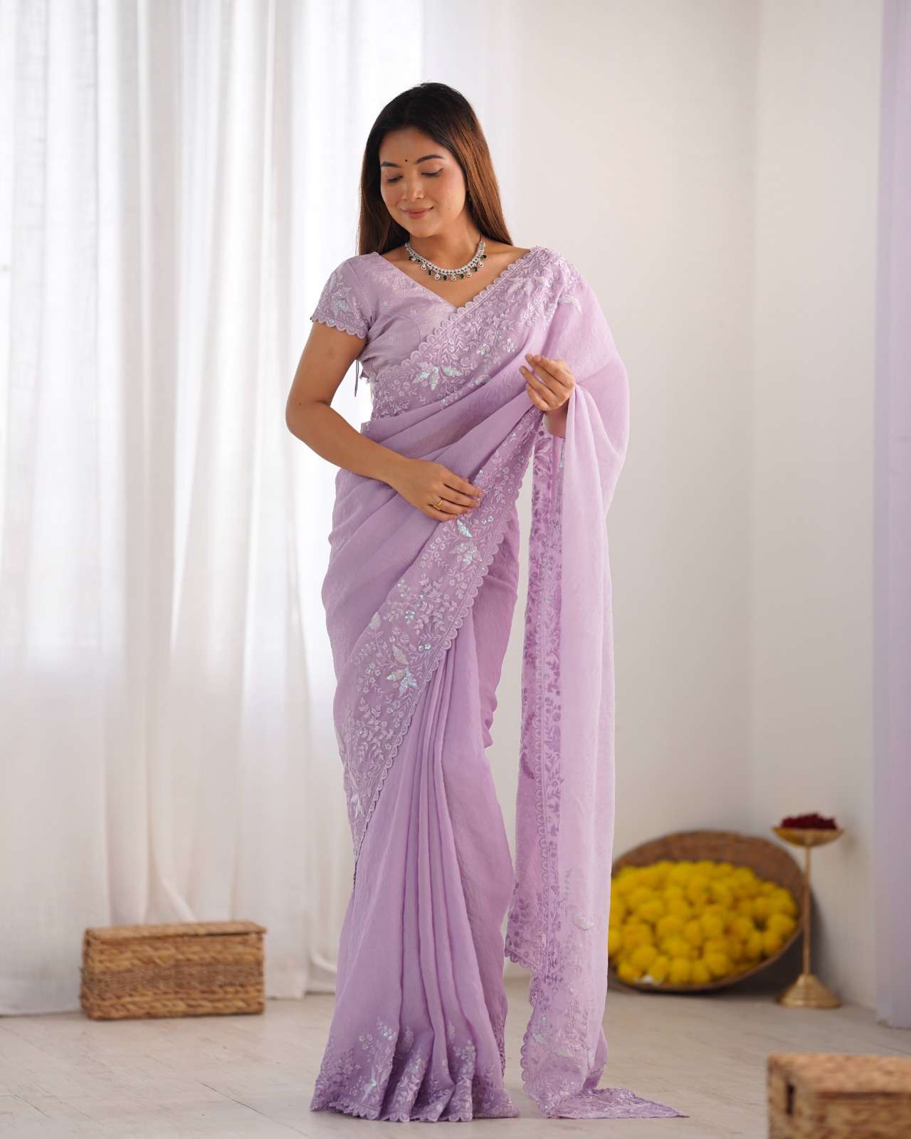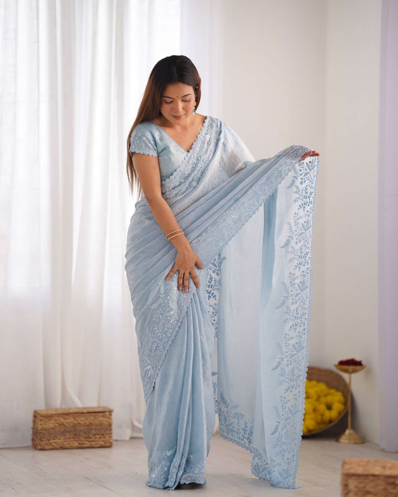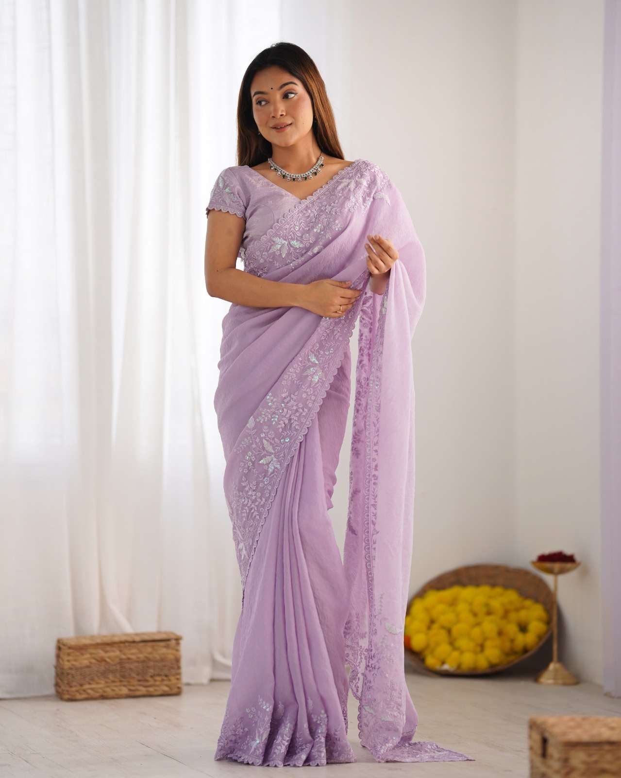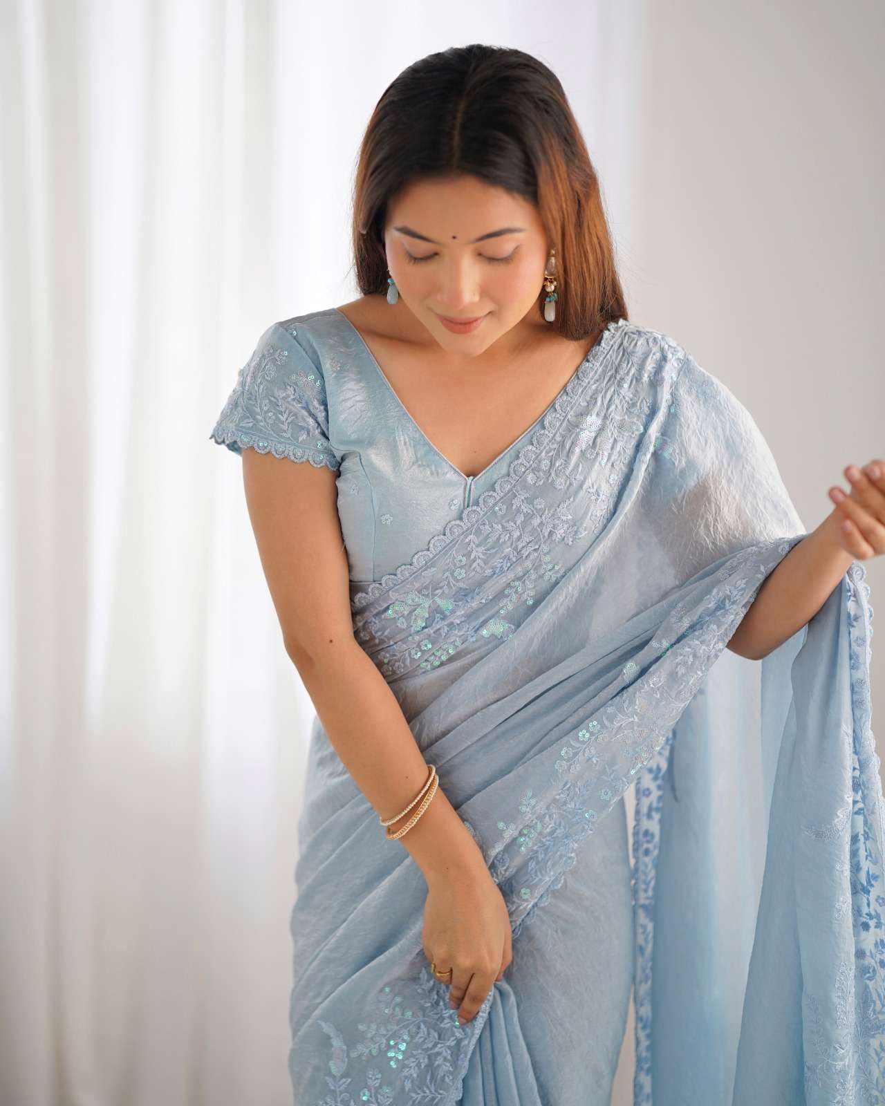 Catalog Name : *Onam* No of Pcs : 2 Fabric : Crushed Fandy tissue Silk Work : Superb Soft Refined Crushed Fandy tissue Silk Saree With Lucknowi Thread Sequencing Work in saree with viscos thread and sequence paired with beautiful embroidery sequencing work blouse (unstich) *In our saree all embroidery work done by viscos thread only*