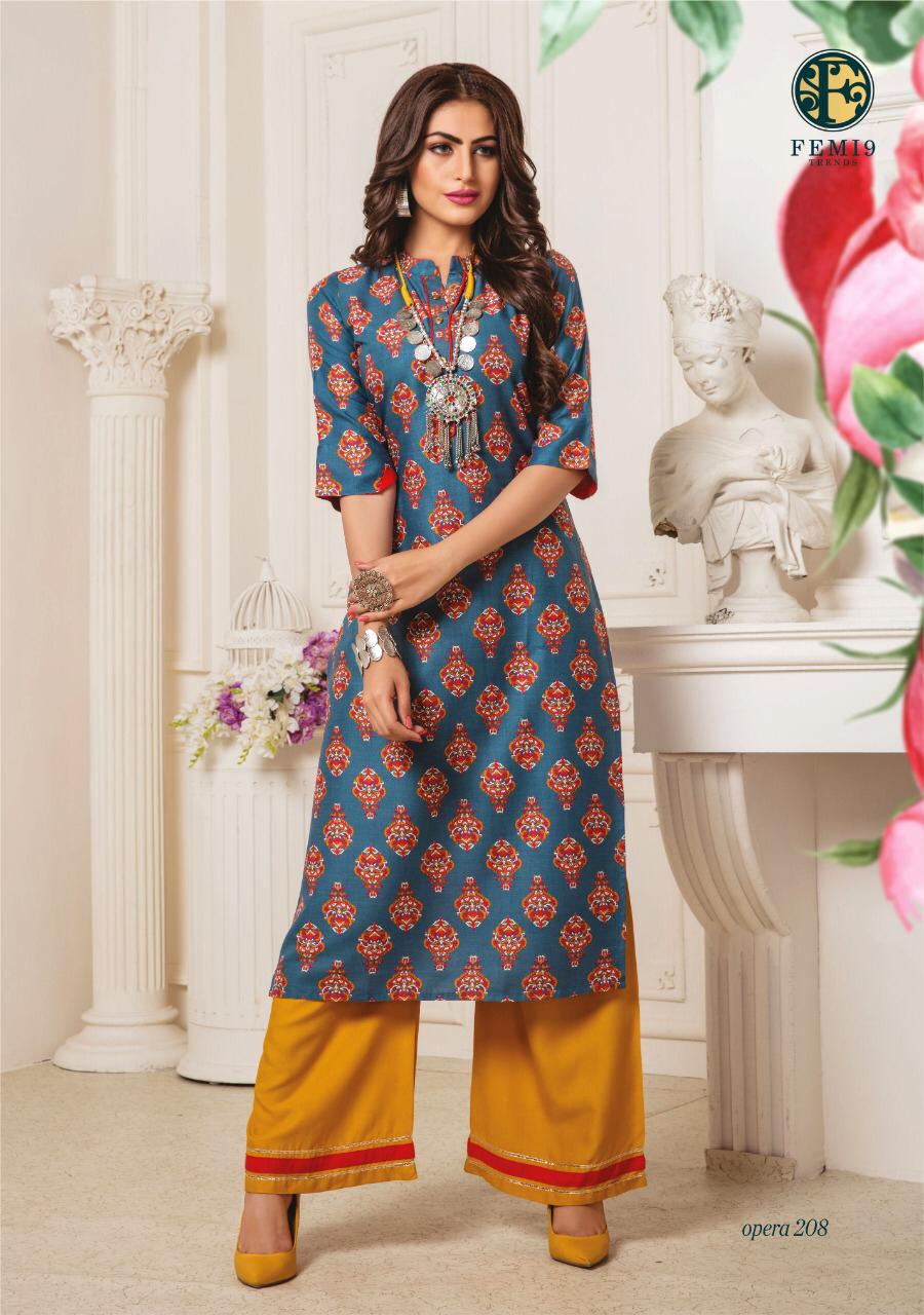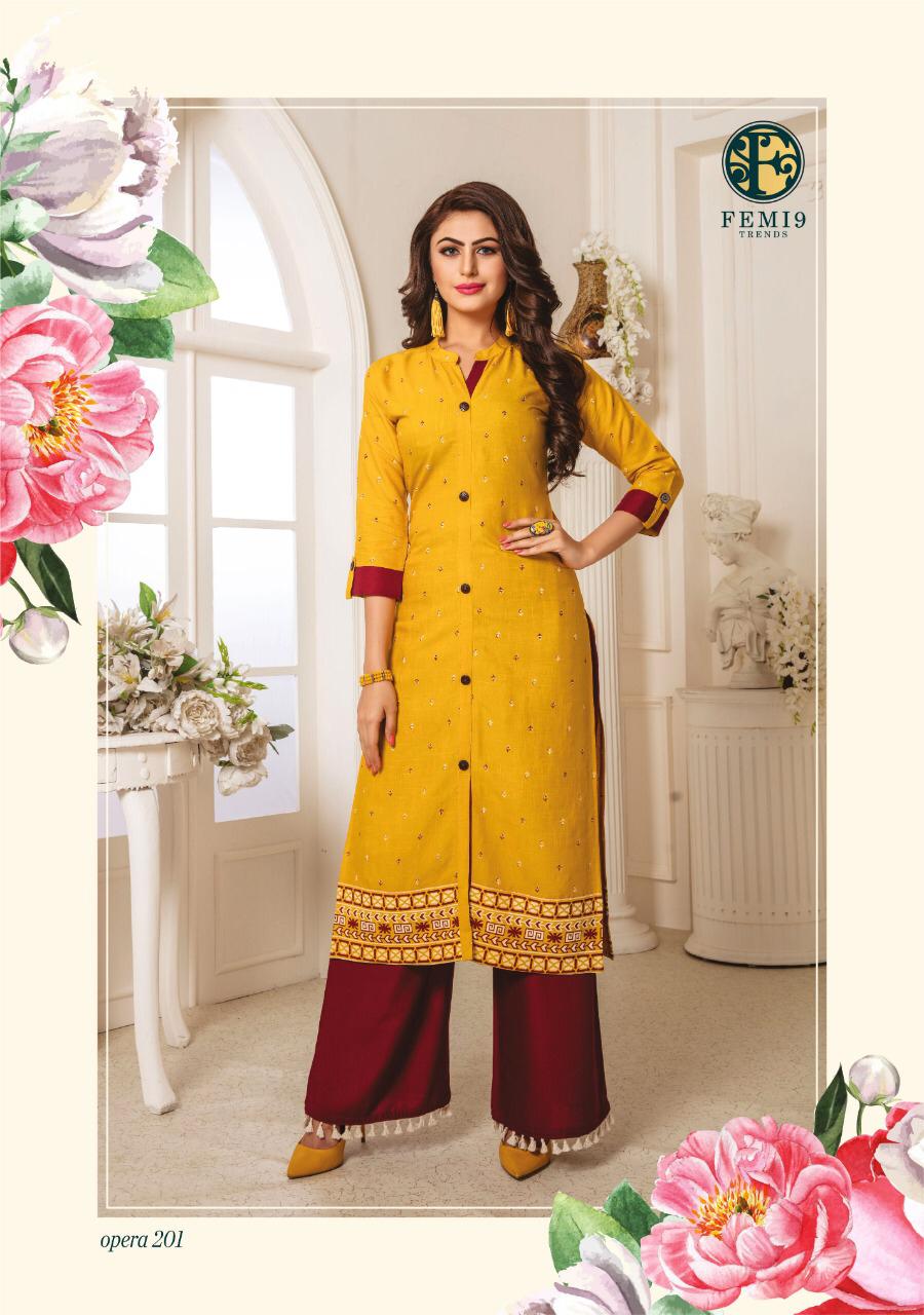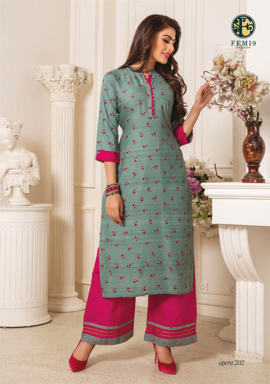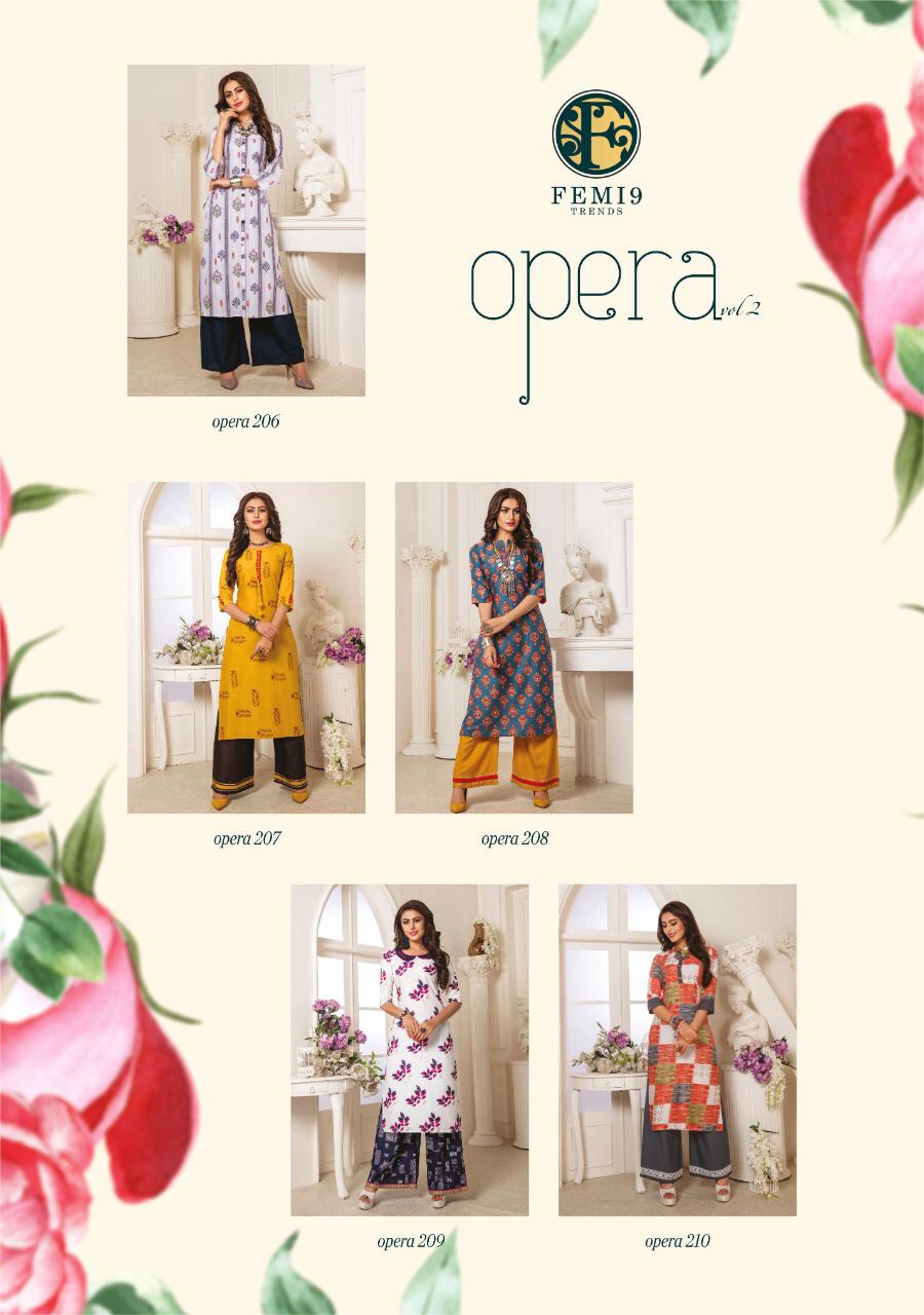 Buy Online Opera Vol 2 By Femi9 Trends 201 Series Fancy Reyon Kurti With Plazzo Collection Wholesaler Surat 10 Pcs of Full Catalogue at Wholesale Price. Looking for Opera Vol 2 By Femi9 Trends 201 Series Fancy Reyon Kurti With Plazzo Collection Wholesaler Surat Full Catalouge at Best Price? Buy Now Opera Vol 2 By Femi9 Trends 201 Series Fancy Reyon Kurti With Plazzo Collection Wholesaler Surat at Wholesale Rate of Rs 5950 with Total 10 Pcs from authroized dealer and supplier of Brand. Cost of Each piece is just only Rs 595 which is very low and affordable price to resale the product in your retail store ,This is Surat based Wholesale Supplier & Dealer of Brand. Click on Brand name to Know more about Brand's products.Call or Whatsapp on 9898838984 for booking or enquiry
