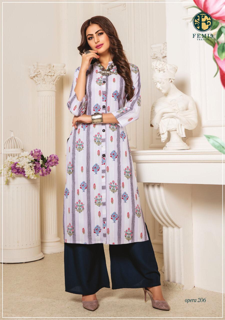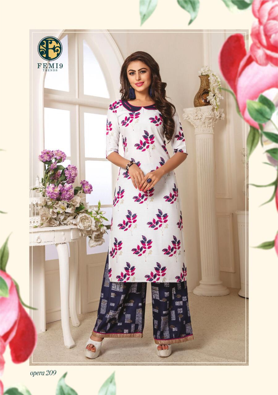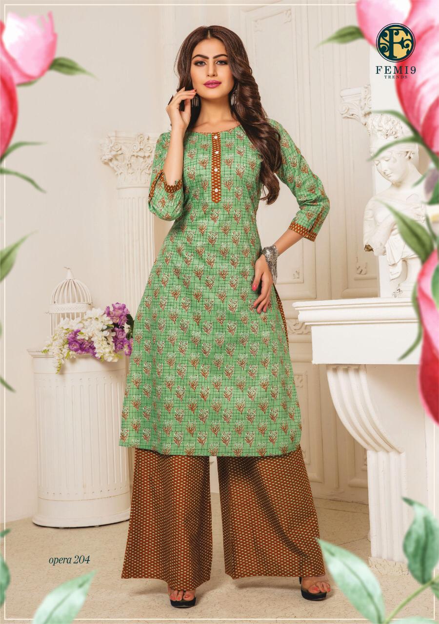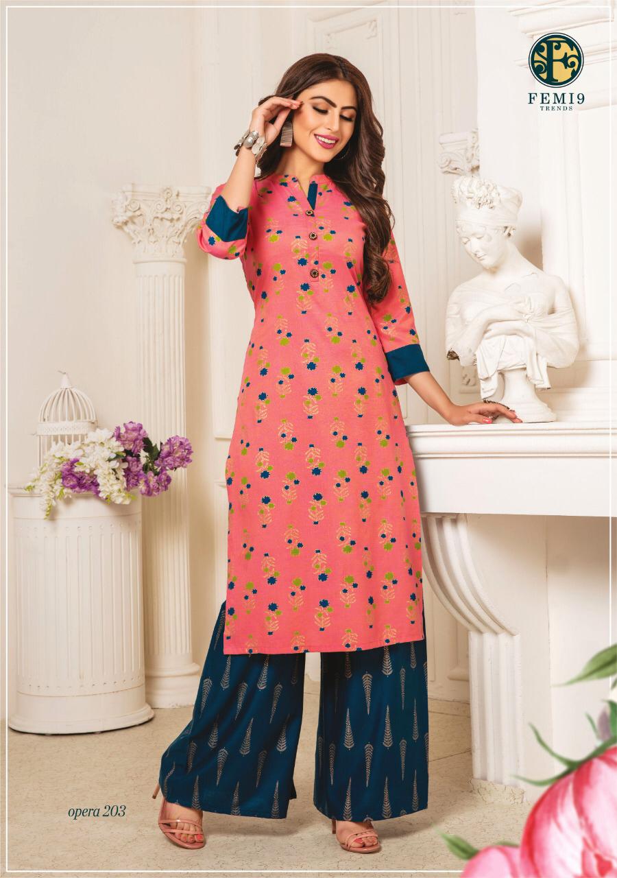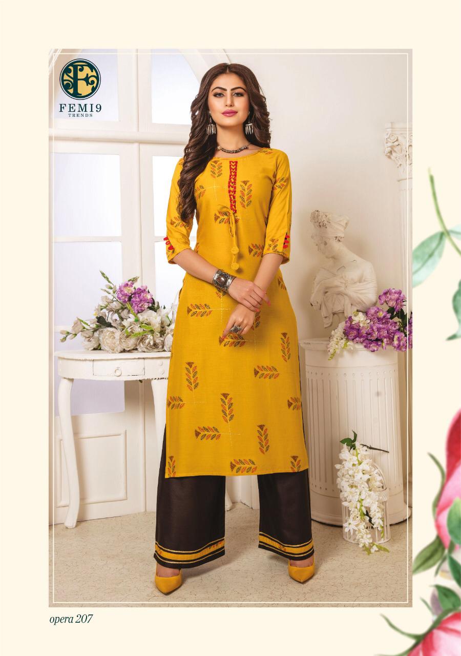 Buy Online Opera Vol 2 By Femi9 Trends 201 Series Fancy Reyon Kurti With Plazzo Collection Wholesaler Surat 10 Pcs of Full Catalogue at Wholesale Price. Looking for Opera Vol 2 By Femi9 Trends 201 Series Fancy Reyon Kurti With Plazzo Collection Wholesaler Surat Full Catalouge at Best Price? Buy Now Opera Vol 2 By Femi9 Trends 201 Series Fancy Reyon Kurti With Plazzo Collection Wholesaler Surat at Wholesale Rate of Rs 5950 with Total 10 Pcs from authroized dealer and supplier of Brand. Cost of Each piece is just only Rs 595 which is very low and affordable price to resale the product in your retail store ,This is Surat based Wholesale Supplier & Dealer of Brand. Click on Brand name to Know more about Brand's products.Call or Whatsapp on 9898838984 for booking or enquiry