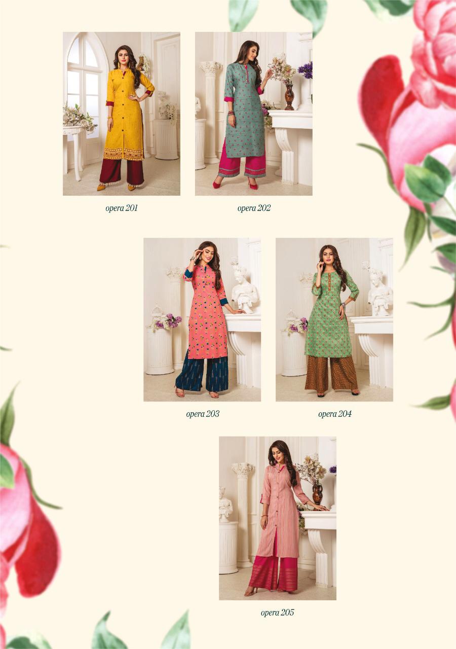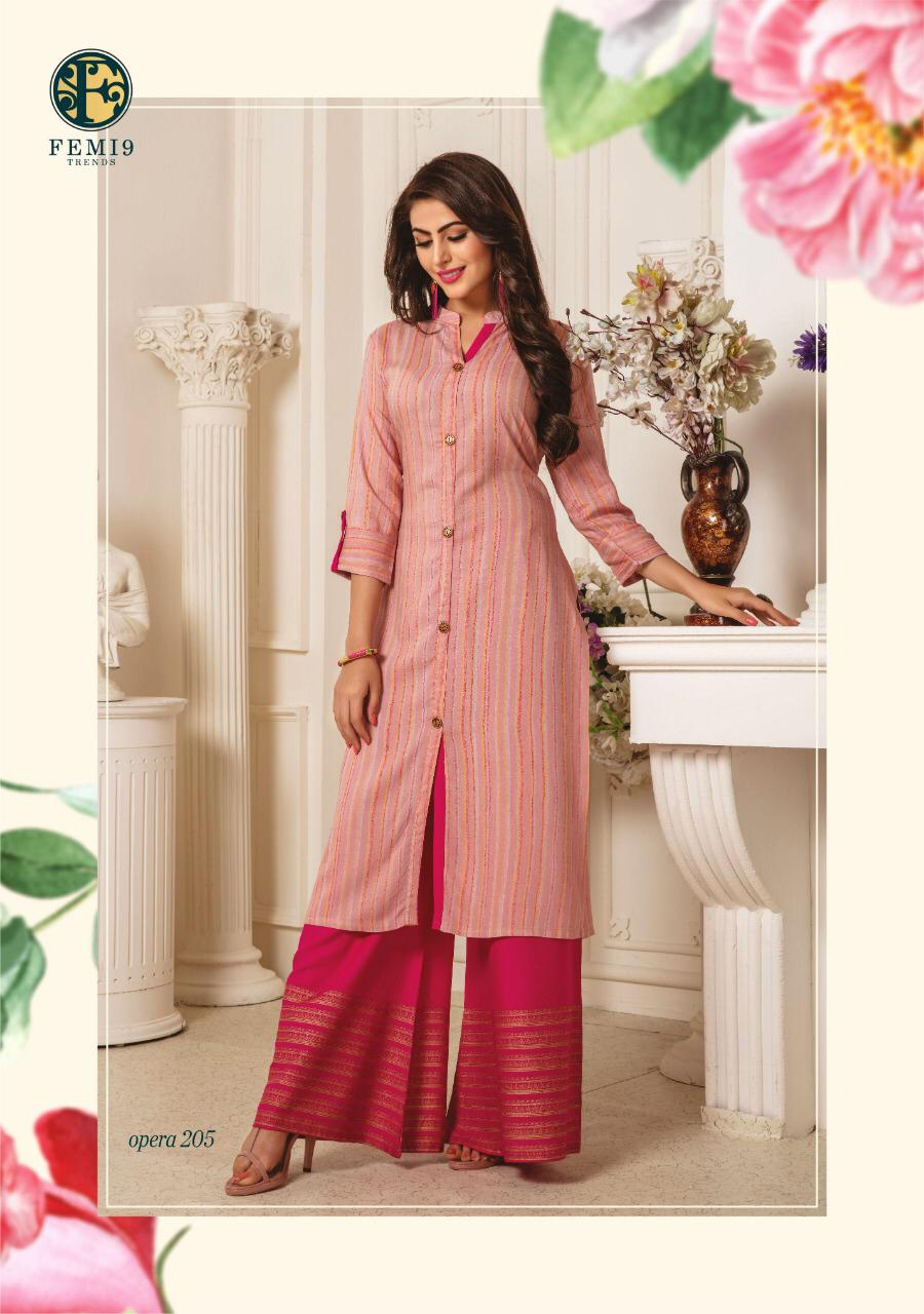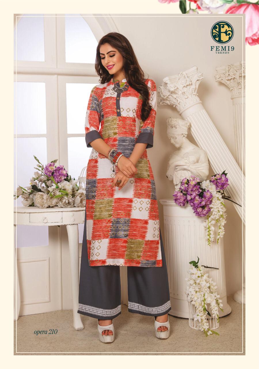 Opera Vol 2 By Femi9 Trends 201 Series Fancy Reyon Kurti With Plazzo Collection Wholesaler Surat