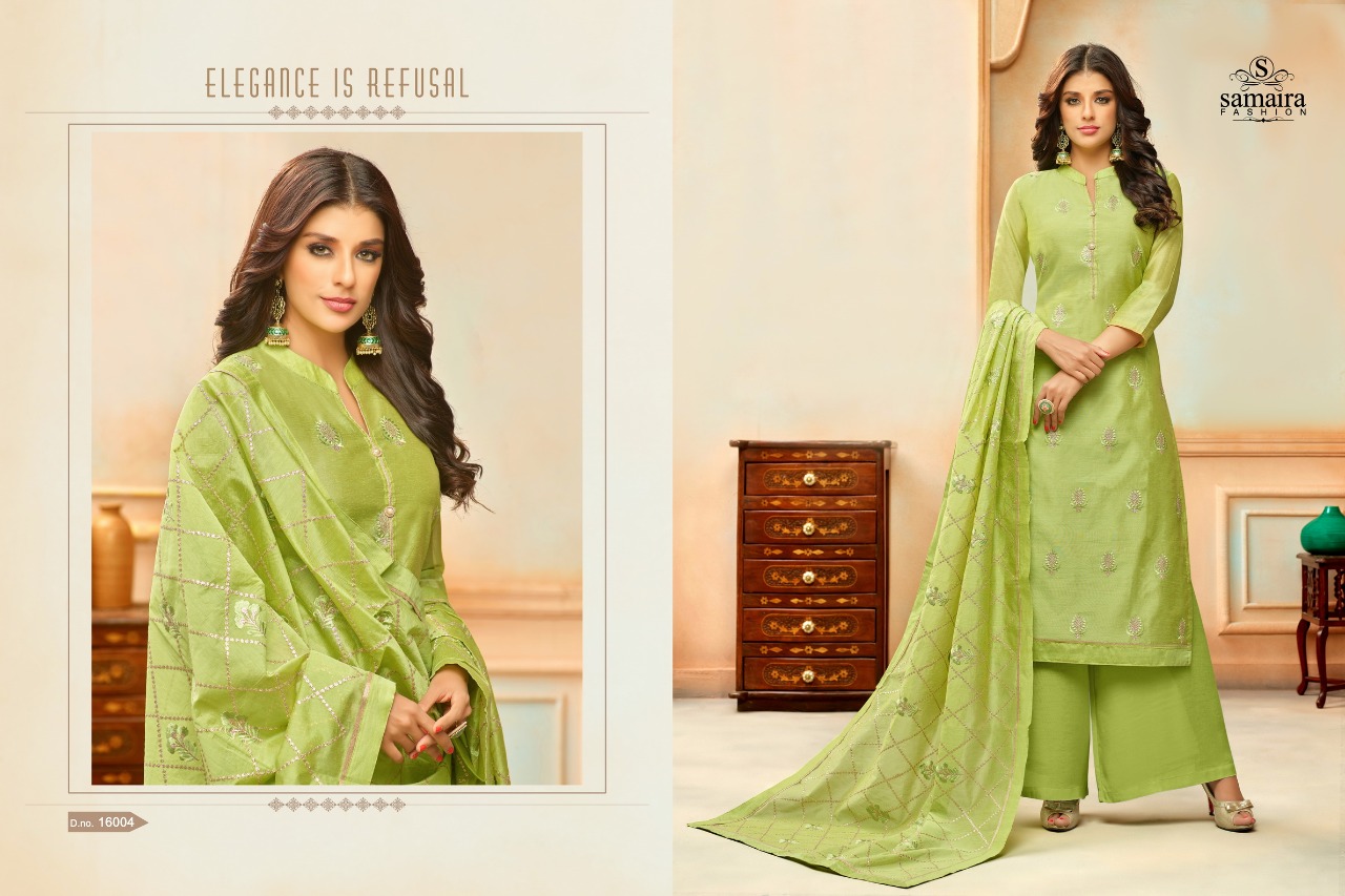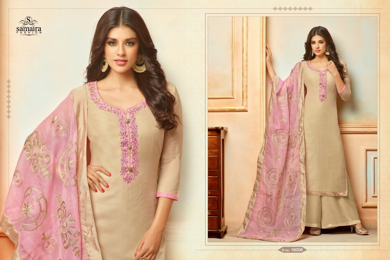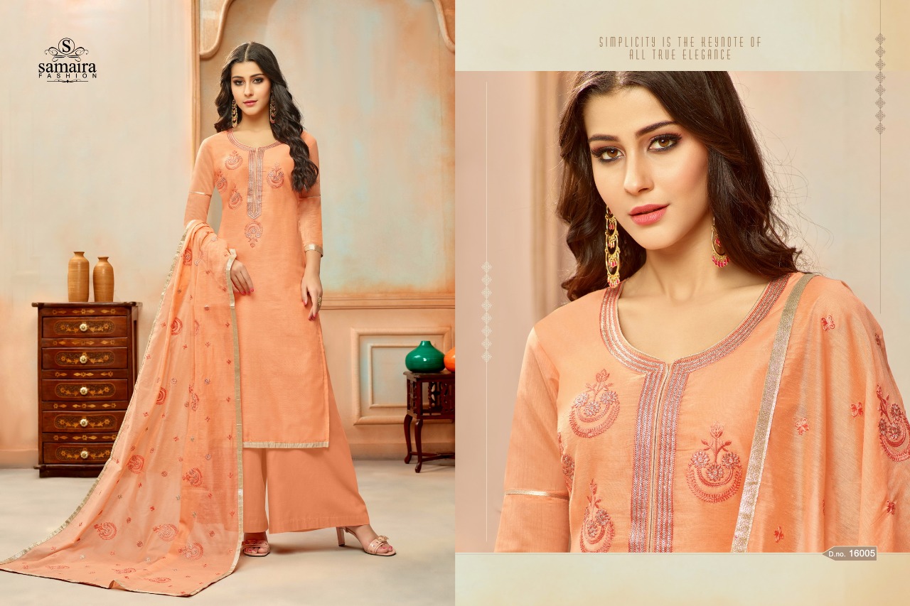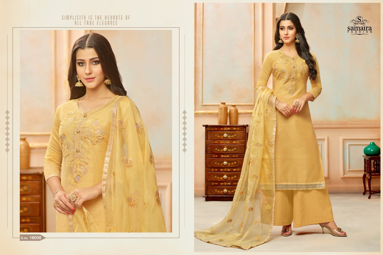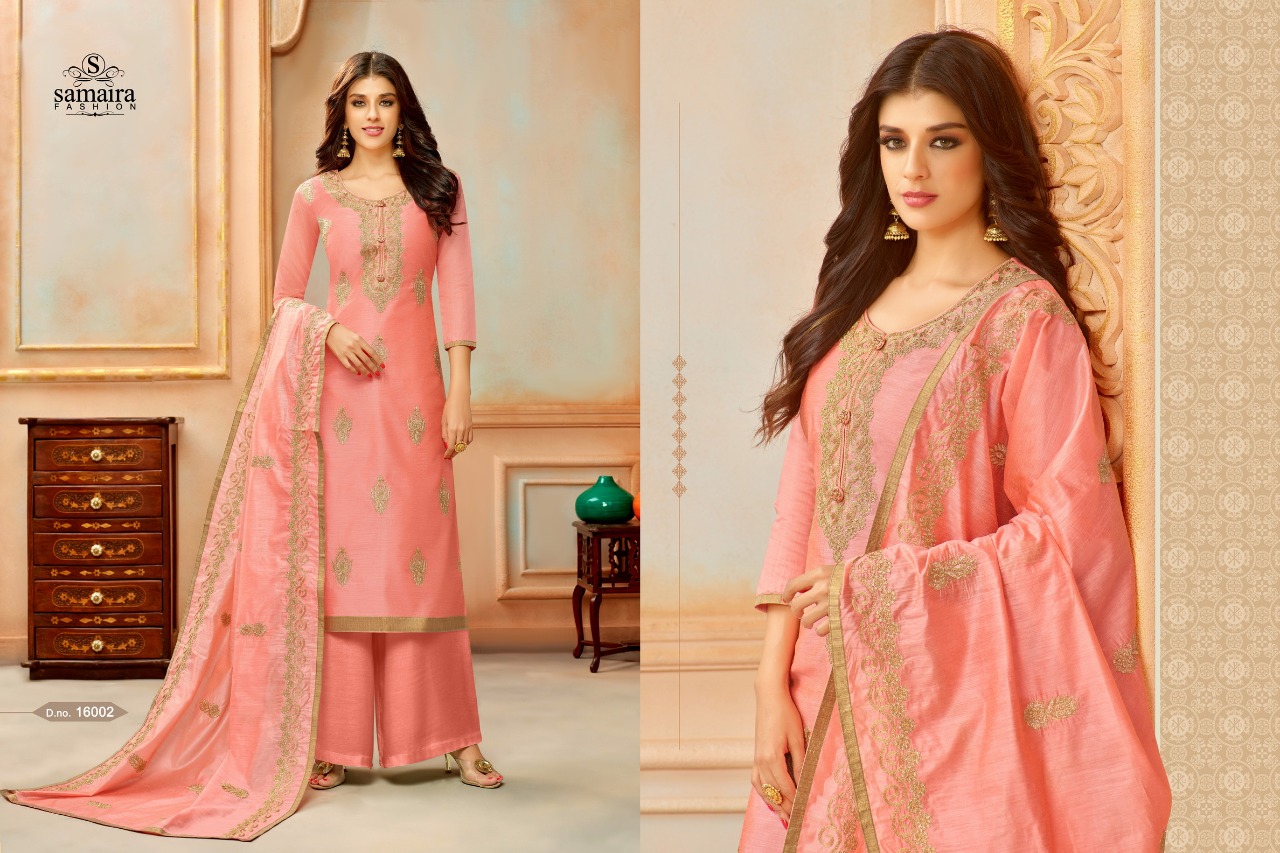 Buy Online Orianna By Samaira Fashion Silk Suit Series16002 To 16010 Wholesale Dealer And Supplier Surat. 9 Pcs of Full Catalogue at Wholesale Price. Looking for Orianna By Samaira Fashion Silk Suit Series16002 To 16010 Wholesale Dealer And Supplier Surat. Full Catalouge at Best Price? Buy Now Orianna By Samaira Fashion Silk Suit Series16002 To 16010 Wholesale Dealer And Supplier Surat. at Wholesale Rate of Rs 6750 with Total 9 Pcs from authroized dealer and supplier of Samaira Fashion Brand. Cost of Each piece is just only Rs 750 which is very low and affordable price to resale the product in your retail store ,This is Surat based Wholesale Supplier & Dealer of Samaira Fashion Brand. Click on Brand name to Know more about Samaira Fashion Brand's products.Call or Whatsapp on 9898838984 for booking or enquiry