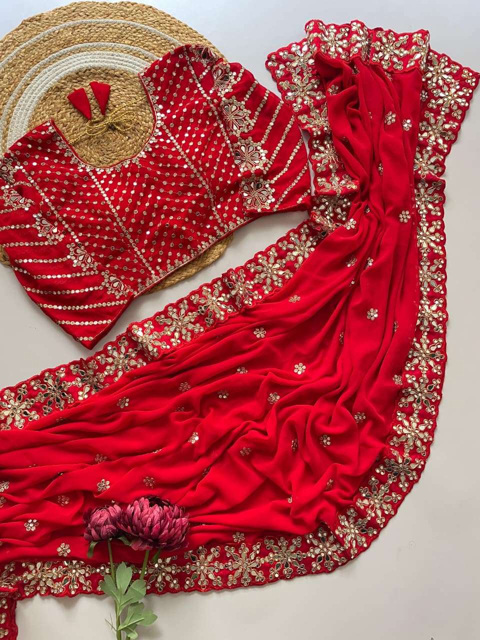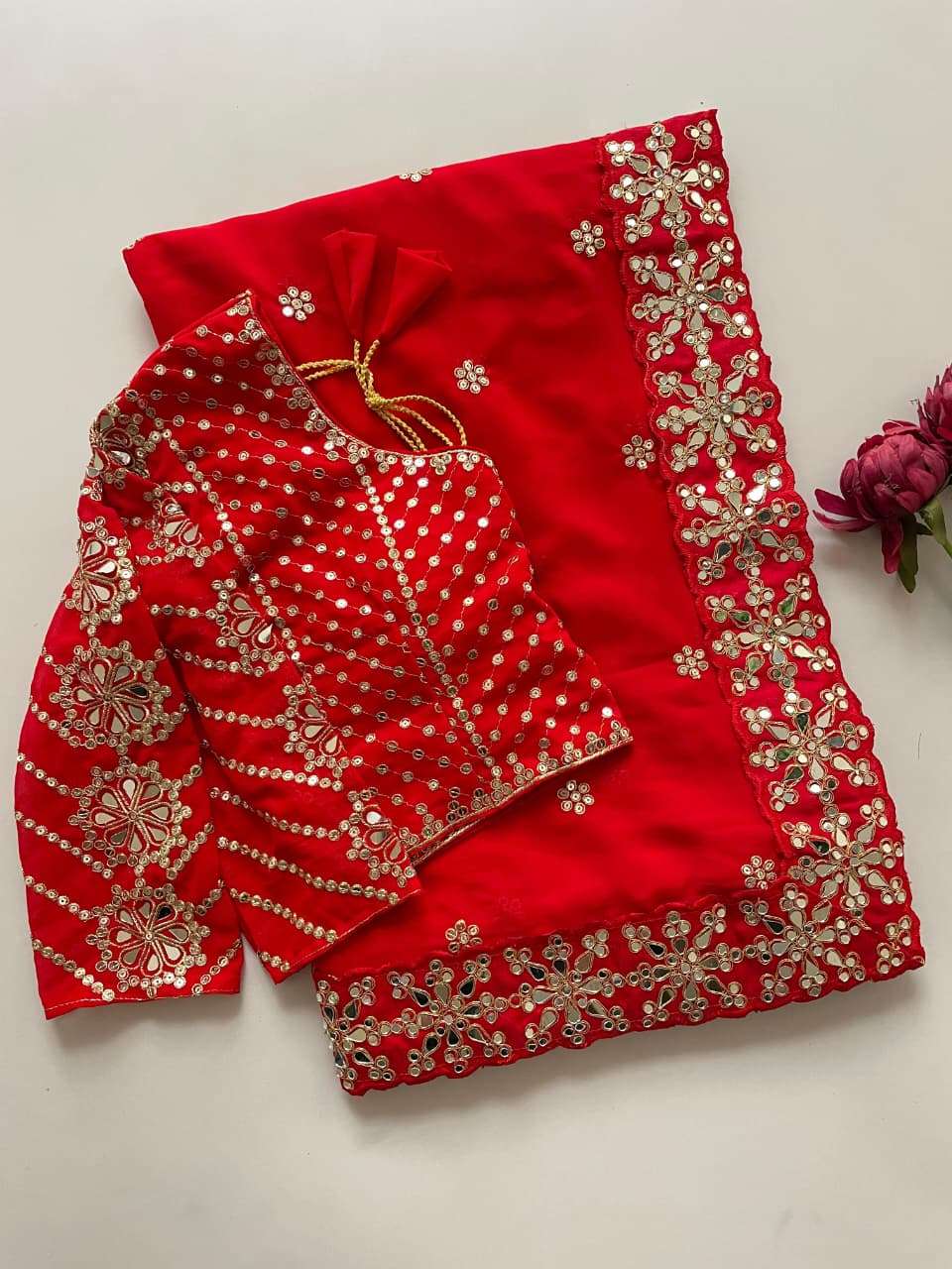 *STICHED BLOUSE* BLOUSE OF GEORGETTE WITH HEAVY EMBROIDERY MULTY SEQUINS WORK FRONT & BACK BOTH SLEEVES WITH EMBROIDERY WORK WITH ORIGINAL HANDWORK MIRROR