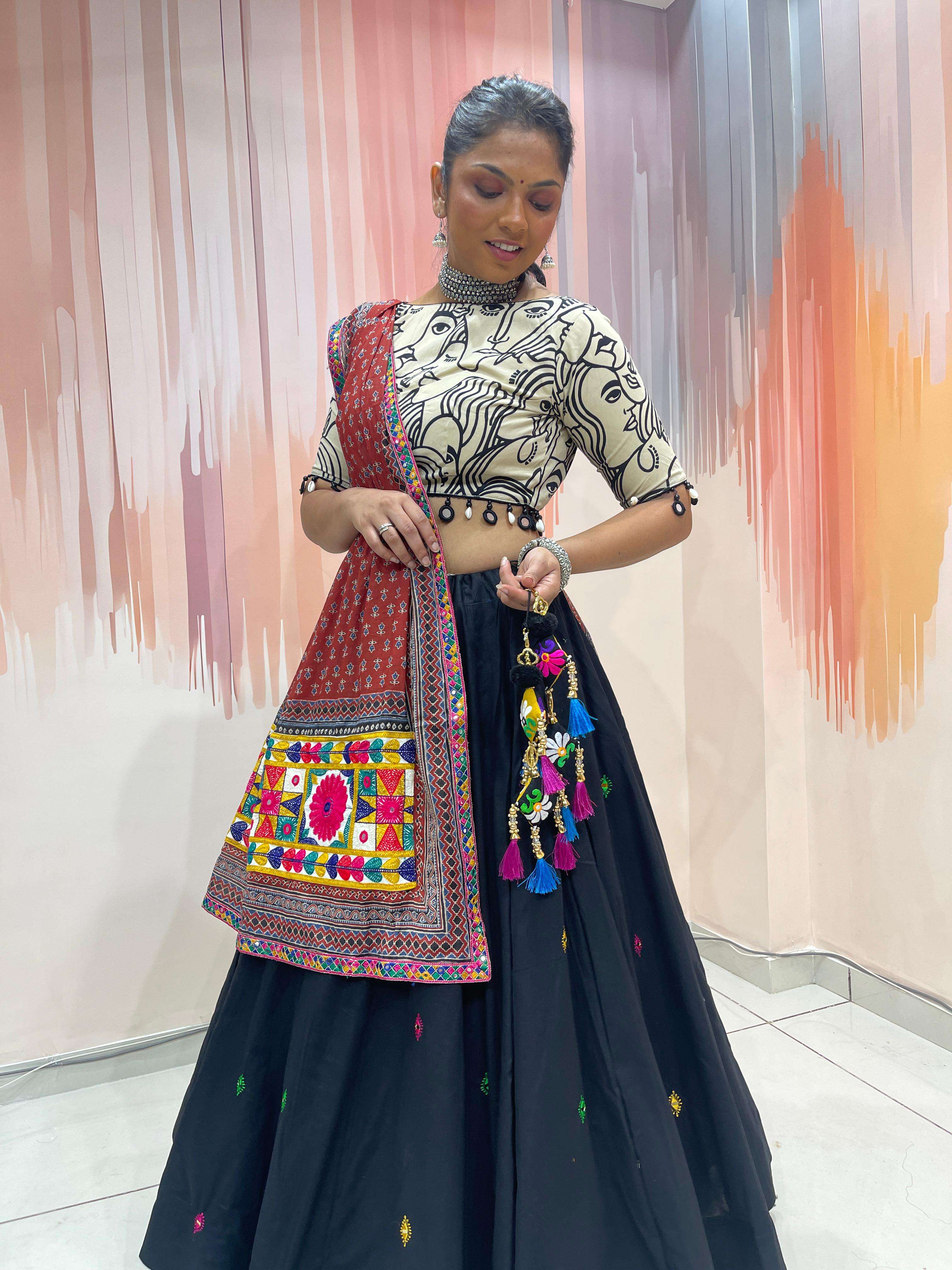 *Skirt/bottom*: *Pure Mal Cotton Sober & Elegant Small multiple floral Embroidered Classic chaniya with approx 6.0 Mtrs flair with good aster heavy quality side zip on waist & best quality latkan gives perfect look to lehenga* *Length 40/41”* *Upto 42” waist*