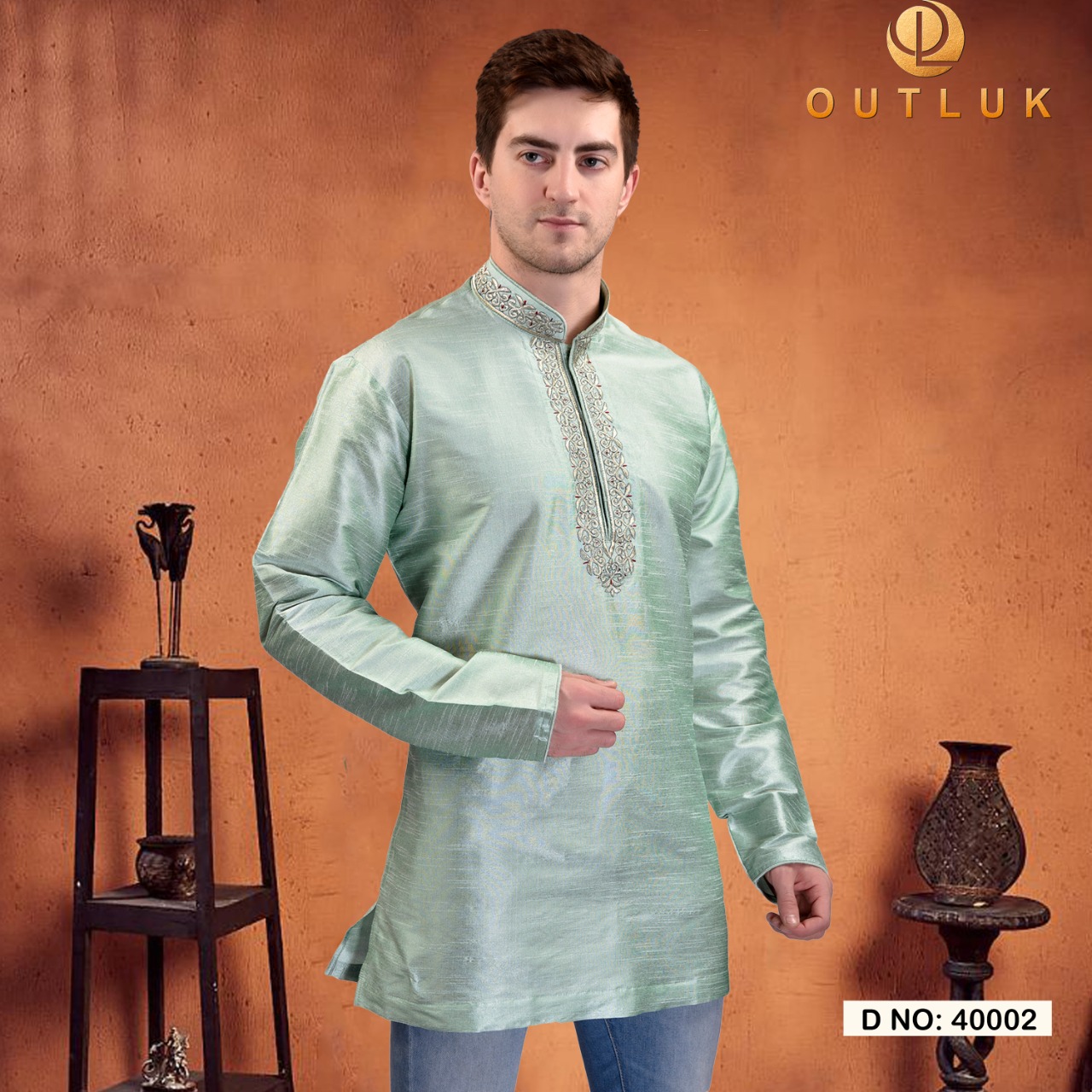 *Lucknowi Men Short Kurta New Catalog* ? *Outlook* has launched new Traditional Silk Kurta with Lucknowi Hand Work Catalog Name: *Outlook Vol 40* ? Fabric Details ? ?Kurta Fabric :- Dhupion Silk with Resham Thread Work ?Total Design:- 8 pcs ?Size:- 36, 38, 40, 42, 44, 46 ?Booking started from now... ?Order yours soon.... Rate -Rs.995/- per pcs GST 5 PERCENT EXTRA SHIP EXTRA 100+single |