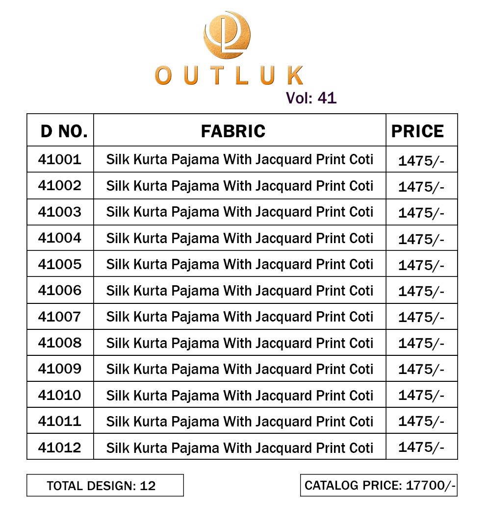 Buy Online Outlook Vol 41 Kurta Pajama With Jacket Single And Set Stockiest And Supplier From Surat 12 Pcs of Full Catalogue at Wholesale Price. Looking for Outlook Vol 41 Kurta Pajama With Jacket Single And Set Stockiest And Supplier From Surat Full Catalouge at Best Price? Buy Now Outlook Vol 41 Kurta Pajama With Jacket Single And Set Stockiest And Supplier From Surat at Wholesale Rate of Rs 17700 with Total 12 Pcs from authroized dealer and supplier of Brand. Cost of Each piece is just only Rs 1475 which is very low and affordable price to resale the product in your retail store ,This is Surat based Wholesale Supplier & Dealer of Brand. Click on Brand name to Know more about Brand's products.Call or Whatsapp on 9898838984 for booking or enquiry