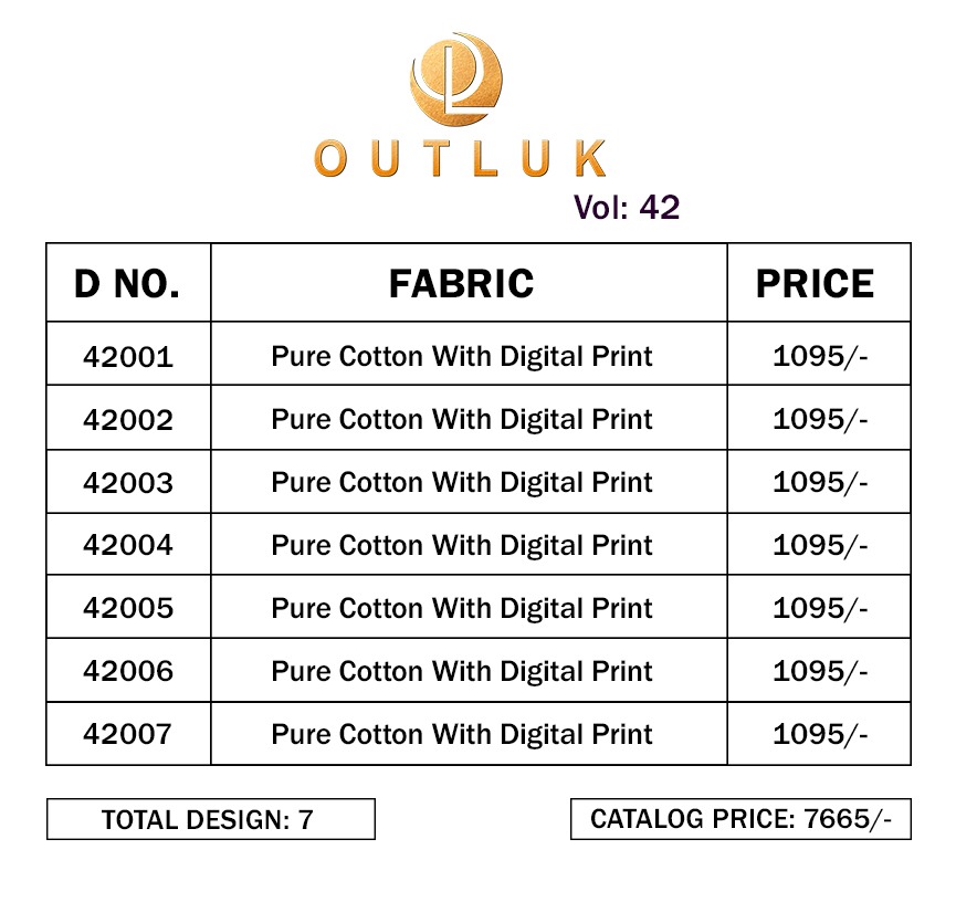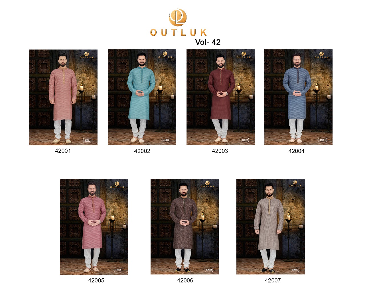 Buy Online Outlook Vol 42 By Outlook Kurta Pajama Collection Single And Set Wholesaler Supplier From Surat 7 Pcs of Full Catalogue at Wholesale Price. Looking for Outlook Vol 42 By Outlook Kurta Pajama Collection Single And Set Wholesaler Supplier From Surat Full Catalouge at Best Price? Buy Now Outlook Vol 42 By Outlook Kurta Pajama Collection Single And Set Wholesaler Supplier From Surat at Wholesale Rate of Rs 7665 with Total 7 Pcs from authroized dealer and supplier of Brand. Cost of Each piece is just only Rs 1095 which is very low and affordable price to resale the product in your retail store ,This is Surat based Wholesale Supplier & Dealer of Brand. Click on Brand name to Know more about Brand's products.Call or Whatsapp on 9898838984 for booking or enquiry