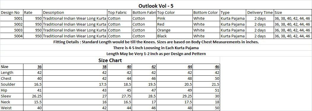 Buy Online Outlook Vol 5 Kurta Pajama Single Available Manufacturer Traders Surat 4 Pcs of Full Catalogue at Wholesale Price. Looking for Outlook Vol 5 Kurta Pajama Single Available Manufacturer Traders Surat Full Catalouge at Best Price? Buy Now Outlook Vol 5 Kurta Pajama Single Available Manufacturer Traders Surat at Wholesale Rate of Rs 4200 with Total 4 Pcs from authroized dealer and supplier of Brand. Cost of Each piece is just only Rs 1050 which is very low and affordable price to resale the product in your retail store ,This is Surat based Wholesale Supplier & Dealer of Brand. Click on Brand name to Know more about Brand's products.Call or Whatsapp on 9898838984 for booking or enquiry