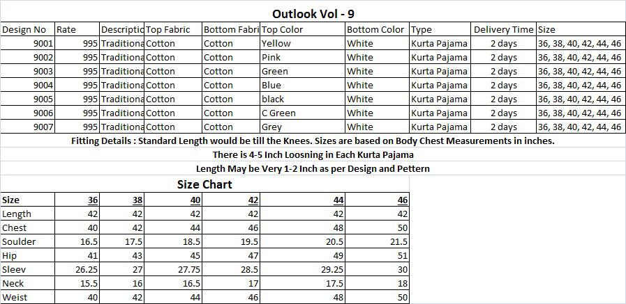 Buy Online Outlook Vol 9 Kurta Pajama Single Available Manufacturer And Dealer From All Over India 7 Pcs of Full Catalogue at Wholesale Price. Looking for Outlook Vol 9 Kurta Pajama Single Available Manufacturer And Dealer From All Over India Full Catalouge at Best Price? Buy Now Outlook Vol 9 Kurta Pajama Single Available Manufacturer And Dealer From All Over India at Wholesale Rate of Rs 7665 with Total 7 Pcs from authroized dealer and supplier of Brand. Cost of Each piece is just only Rs 1095 which is very low and affordable price to resale the product in your retail store ,This is Surat based Wholesale Supplier & Dealer of Brand. Click on Brand name to Know more about Brand's products.Call or Whatsapp on 9898838984 for booking or enquiry