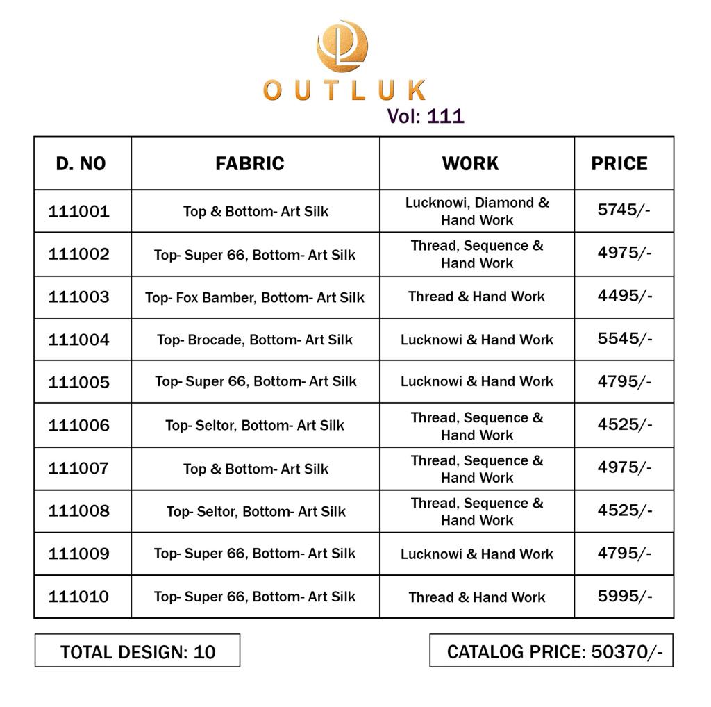 Buy Online Outluk Premium Series Vol 111 By Outluk Indo Western And Sherwani Collection 10 Pcs of Full Catalogue at Wholesale Price. Looking for Outluk Premium Series Vol 111 By Outluk Indo Western And Sherwani Collection Full Catalouge at Best Price? Buy Now Outluk Premium Series Vol 111 By Outluk Indo Western And Sherwani Collection at Wholesale Rate of Rs 0 with Total 10 Pcs from authroized dealer and supplier of Brand. Cost of Each piece is just only Rs 0 which is very low and affordable price to resale the product in your retail store ,This is Surat based Wholesale Supplier & Dealer of Brand. Click on Brand name to Know more about Brand's products.Call or Whatsapp on 9898838984 for booking or enquiry