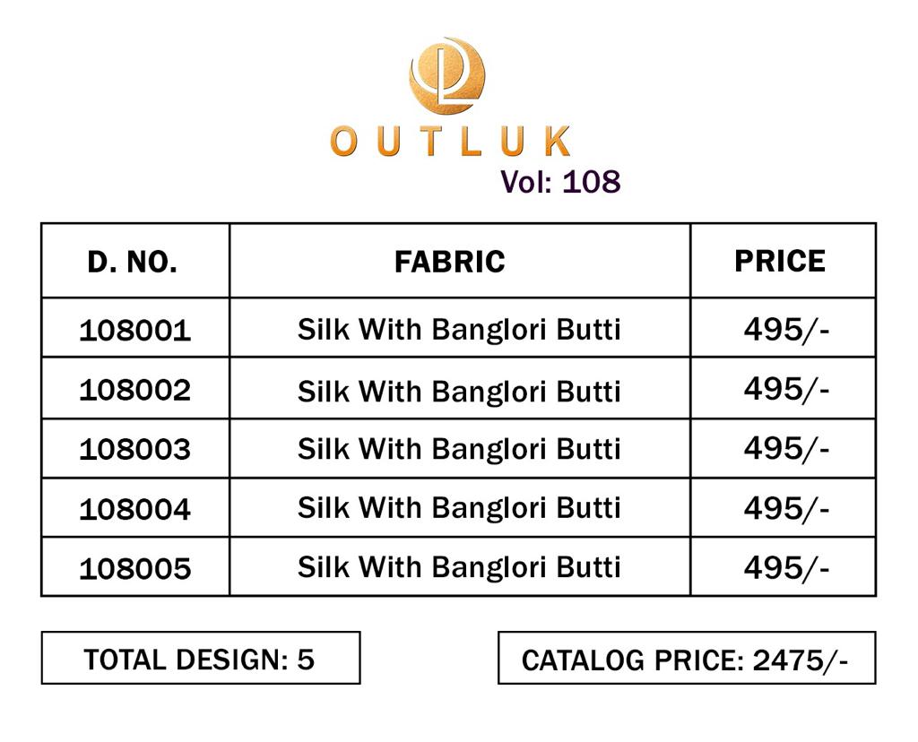 Buy Online Outluk Vol 108 By Outluk Means Wear Collection 5 Pcs of Full Catalogue at Wholesale Price. Looking for Outluk Vol 108 By Outluk Means Wear Collection Full Catalouge at Best Price? Buy Now Outluk Vol 108 By Outluk Means Wear Collection at Wholesale Rate of Rs 2475 with Total 5 Pcs from authroized dealer and supplier of Brand. Cost of Each piece is just only Rs 495 which is very low and affordable price to resale the product in your retail store ,This is Surat based Wholesale Supplier & Dealer of Brand. Click on Brand name to Know more about Brand's products.Call or Whatsapp on 9898838984 for booking or enquiry