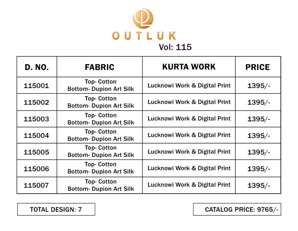 Buy Online Outluk Vol 115 By Outluk Premium Lucknowi Work Means Kurta Pajama Collection Manufacturer Surat 7 Pcs of Full Catalogue at Wholesale Price. Looking for Outluk Vol 115 By Outluk Premium Lucknowi Work Means Kurta Pajama Collection Manufacturer Surat Full Catalouge at Best Price? Buy Now Outluk Vol 115 By Outluk Premium Lucknowi Work Means Kurta Pajama Collection Manufacturer Surat at Wholesale Rate of Rs 9765 with Total 7 Pcs from authroized dealer and supplier of Brand. Cost of Each piece is just only Rs 1395 which is very low and affordable price to resale the product in your retail store ,This is Surat based Wholesale Supplier & Dealer of Brand. Click on Brand name to Know more about Brand's products.Call or Whatsapp on 9898838984 for booking or enquiry