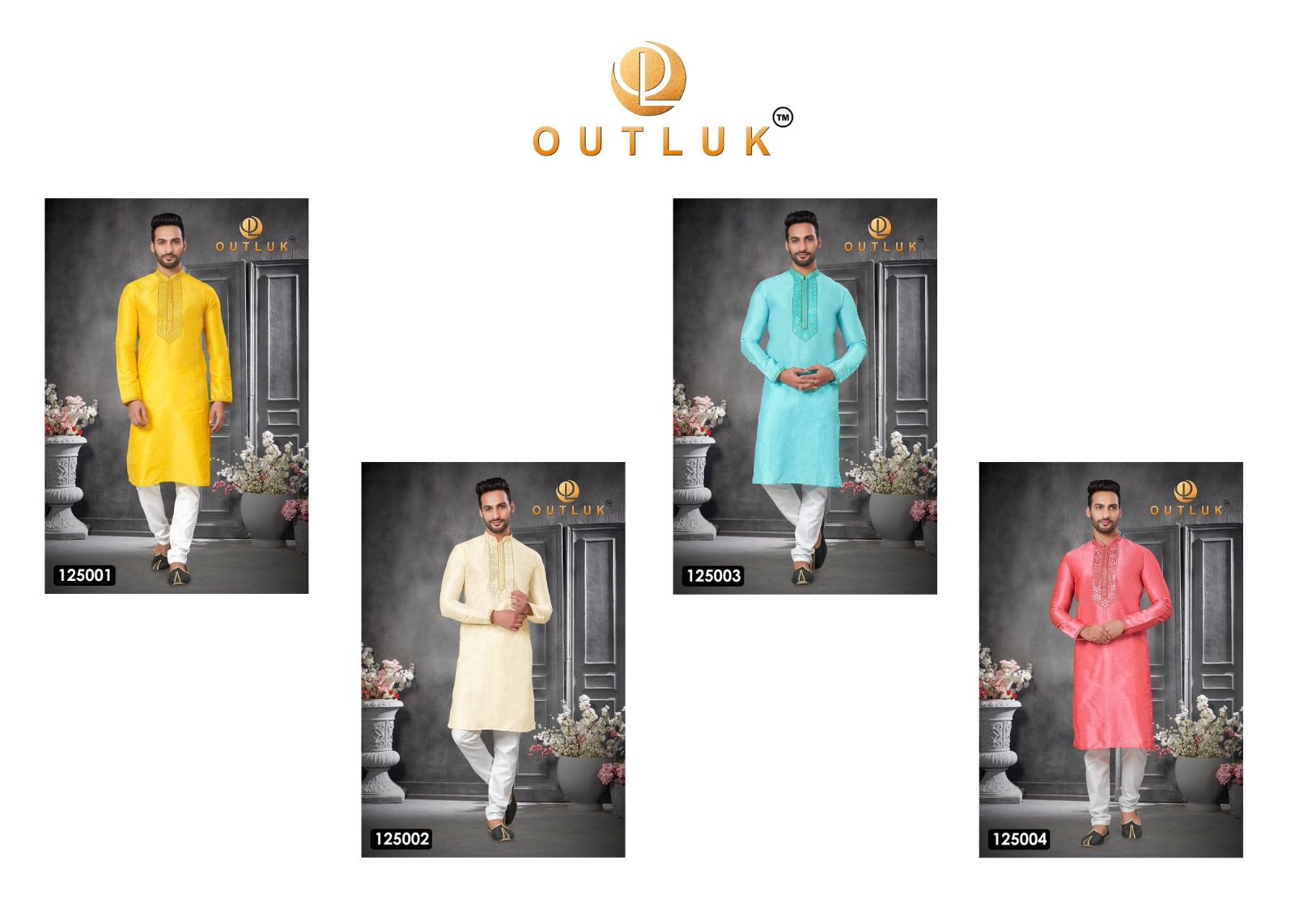 Buy Online Outluk Vol 125 Designer Kurta Pajama 4 Pcs of Full Catalogue at Wholesale Price. Looking for Outluk Vol 125 Designer Kurta Pajama Full Catalouge at Best Price? Buy Now Outluk Vol 125 Designer Kurta Pajama at Wholesale Rate of Rs 3780 with Total 4 Pcs from authroized dealer and supplier of Brand. Cost of Each piece is just only Rs 945 which is very low and affordable price to resale the product in your retail store ,This is Surat based Wholesale Supplier & Dealer of Brand. Click on Brand name to Know more about Brand's products.Call or Whatsapp on 9898838984 for booking or enquiry