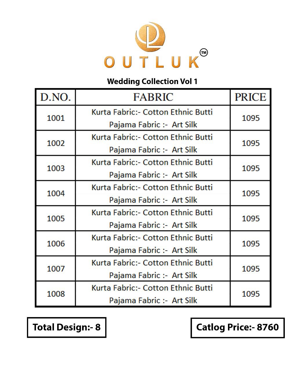 Buy Online Outluk Wedding Collection Vol 1 Pintex Work Kurta Pajama 8 Pcs of Full Catalogue at Wholesale Price. Looking for Outluk Wedding Collection Vol 1 Pintex Work Kurta Pajama Full Catalouge at Best Price? Buy Now Outluk Wedding Collection Vol 1 Pintex Work Kurta Pajama at Wholesale Rate of Rs 8760 with Total 8 Pcs from authroized dealer and supplier of Brand. Cost of Each piece is just only Rs 1095 which is very low and affordable price to resale the product in your retail store ,This is Surat based Wholesale Supplier & Dealer of Brand. Click on Brand name to Know more about Brand's products.Call or Whatsapp on 9898838984 for booking or enquiry