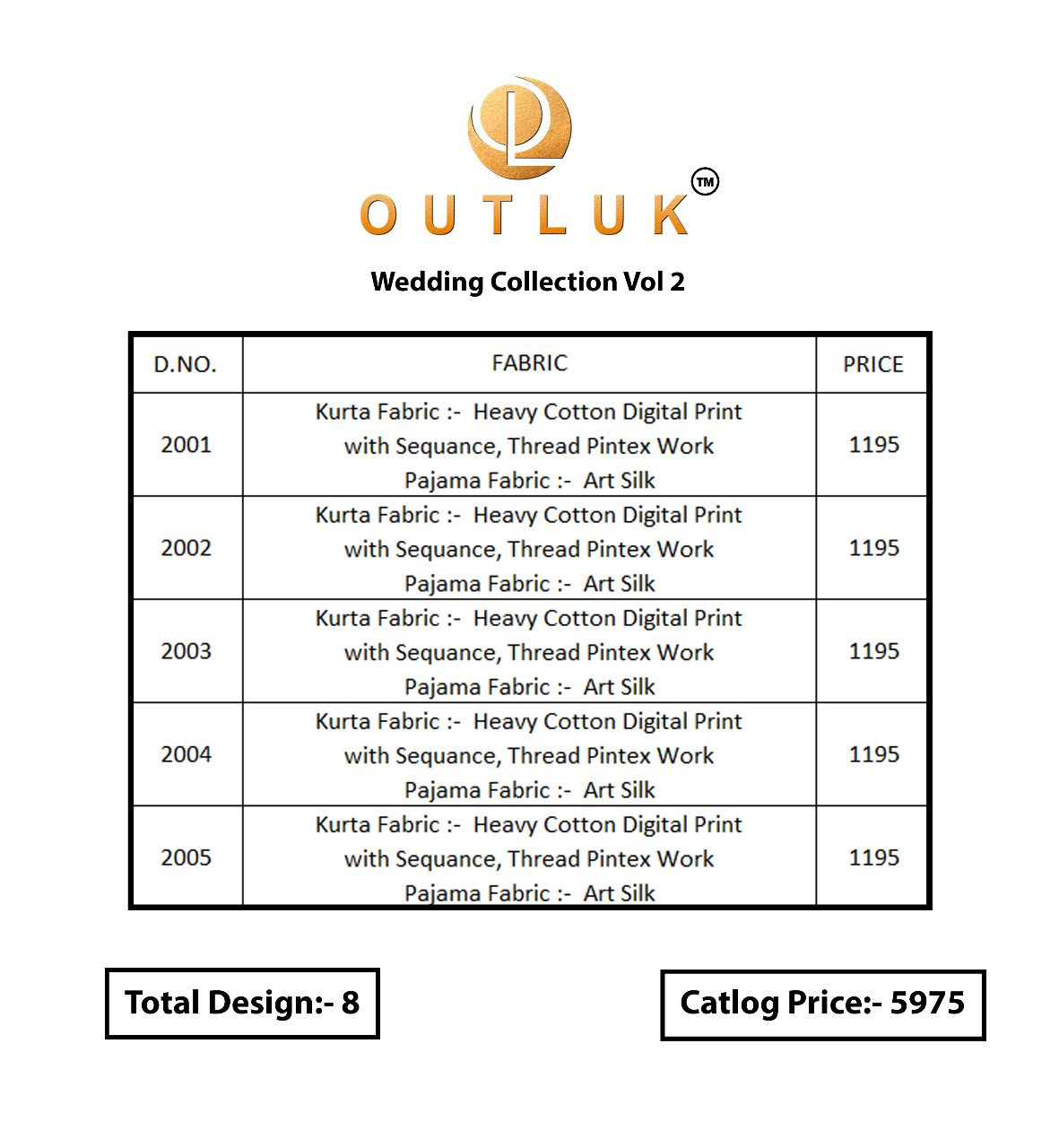 Buy Online Outluk Wedding Collection Vol 2 Pintex Work Kurta Pajama For Men Collection 5 Pcs of Full Catalogue at Wholesale Price. Looking for Outluk Wedding Collection Vol 2 Pintex Work Kurta Pajama For Men Collection Full Catalouge at Best Price? Buy Now Outluk Wedding Collection Vol 2 Pintex Work Kurta Pajama For Men Collection at Wholesale Rate of Rs 5975 with Total 5 Pcs from authroized dealer and supplier of Brand. Cost of Each piece is just only Rs 1195 which is very low and affordable price to resale the product in your retail store ,This is Surat based Wholesale Supplier & Dealer of Brand. Click on Brand name to Know more about Brand's products.Call or Whatsapp on 9898838984 for booking or enquiry