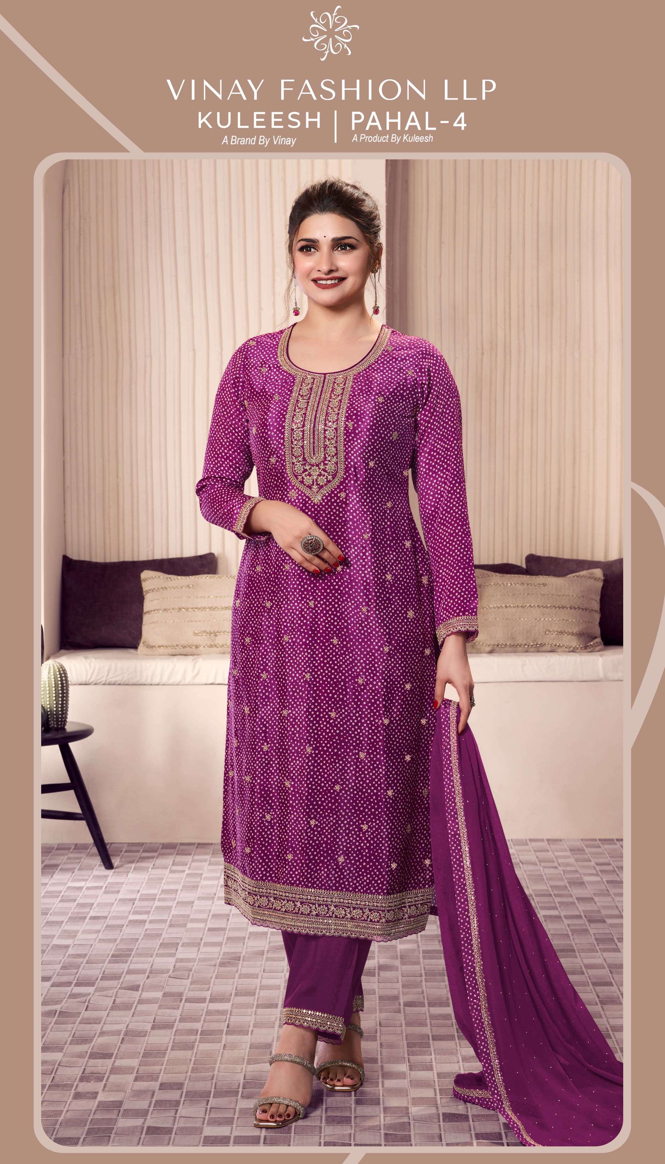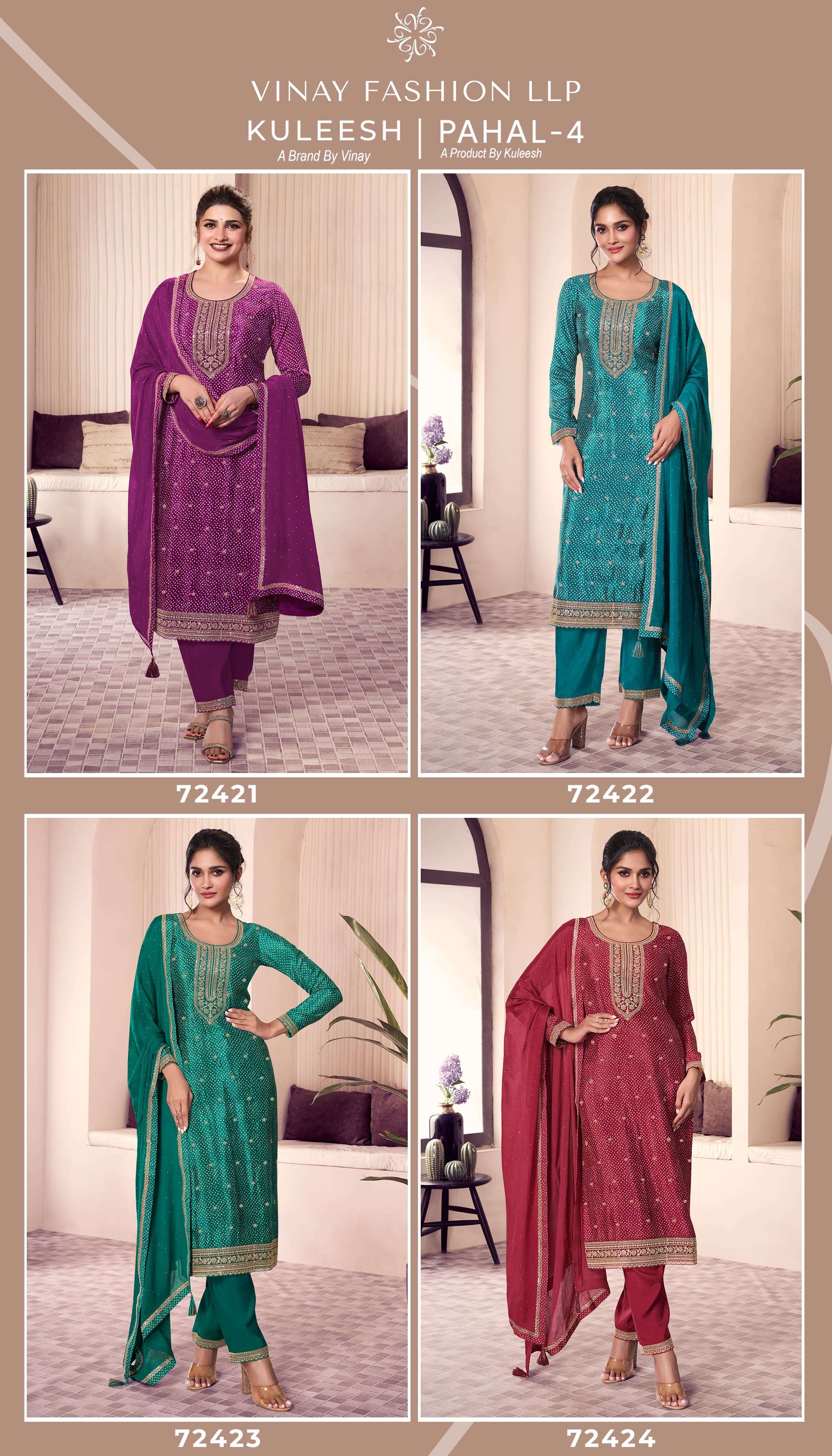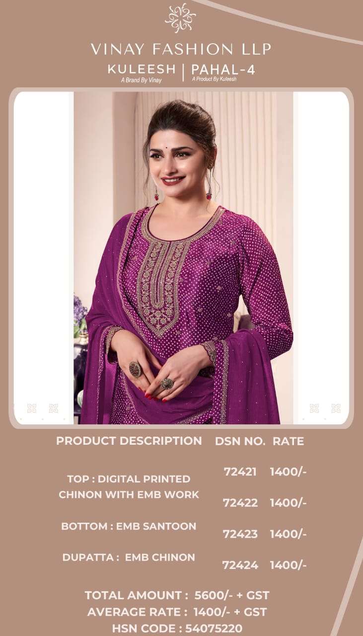 Buy Online Pahal 4 by vinay fashion Printed Chinon suit collection manufacturer surat 4 Pcs of Full Catalogue at Wholesale Price. Looking for Pahal 4 by vinay fashion Printed Chinon suit collection manufacturer surat Full Catalouge at Best Price? Buy Now Pahal 4 by vinay fashion Printed Chinon suit collection manufacturer surat at Wholesale Rate of Rs 5600 with Total 4 Pcs from authroized dealer and supplier of Vinay Fashion Brand. Cost of Each piece is just only Rs 1400 which is very low and affordable price to resale the product in your retail store ,This is Surat based Wholesale Supplier & Dealer of Vinay Fashion Brand. Click on Brand name to Know more about Vinay Fashion Brand's products.Call or Whatsapp on 9898838984 for booking or enquiry