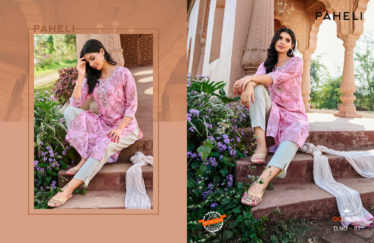 *Brand :* 100 miles *Catalog Name :* Paheli Top Pant With Dupatta *Price :* ?755 *Piece :* 4 *Total Price :* 3020 ( GST Extra ) *Size :* M,L,XL,XXL *Fabric :* cotton *Availibility :* On Booking Set to set |