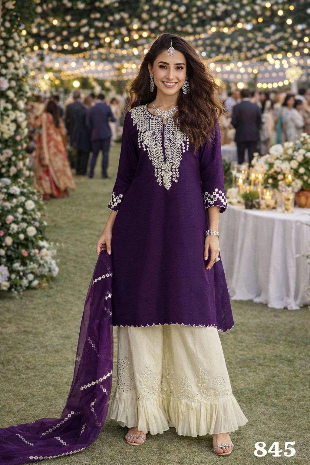 FABRIC - PREMIUM REAL SILK ( TREDY FESTIVE LOOK EMBROIDERED MIRROR WORK TOP WITH PLAZZO PANT AND EMBROIDERED ORGANZA DUPATTA )
