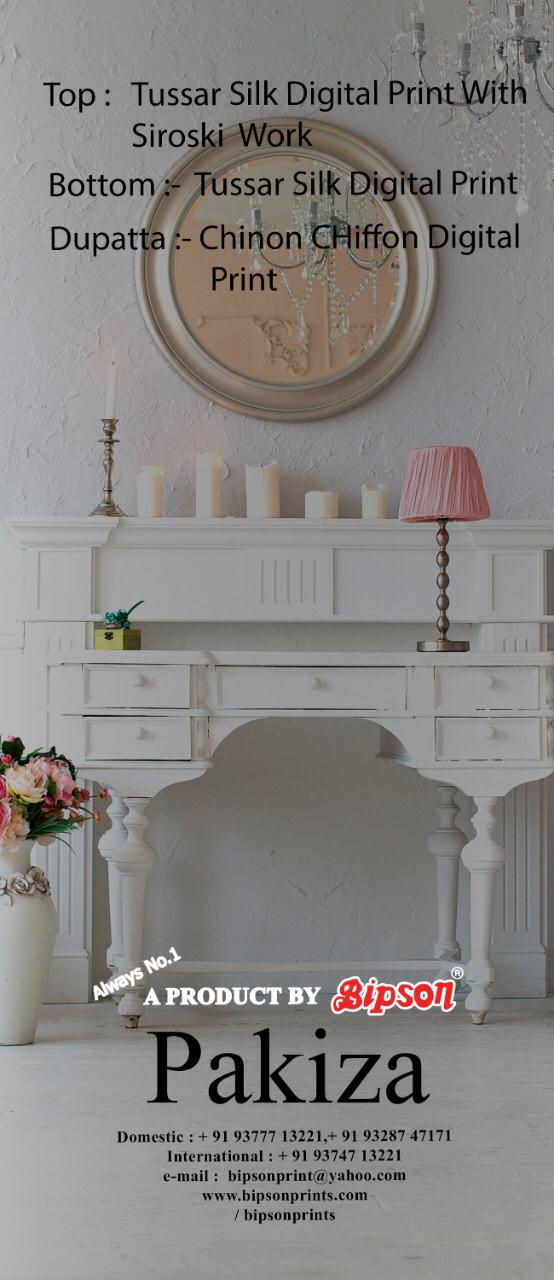 Buy Online Pakiza By Bipson Silk Digital Printed Dress Materials Wholesale Supplier Surat 4 Pcs of Full Catalogue at Wholesale Price. Looking for Pakiza By Bipson Silk Digital Printed Dress Materials Wholesale Supplier Surat Full Catalouge at Best Price? Buy Now Pakiza By Bipson Silk Digital Printed Dress Materials Wholesale Supplier Surat at Wholesale Rate of Rs 3340 with Total 4 Pcs from authroized dealer and supplier of Brand. Cost of Each piece is just only Rs 835 which is very low and affordable price to resale the product in your retail store ,This is Surat based Wholesale Supplier & Dealer of Brand. Click on Brand name to Know more about Brand's products.Call or Whatsapp on 9898838984 for booking or enquiry