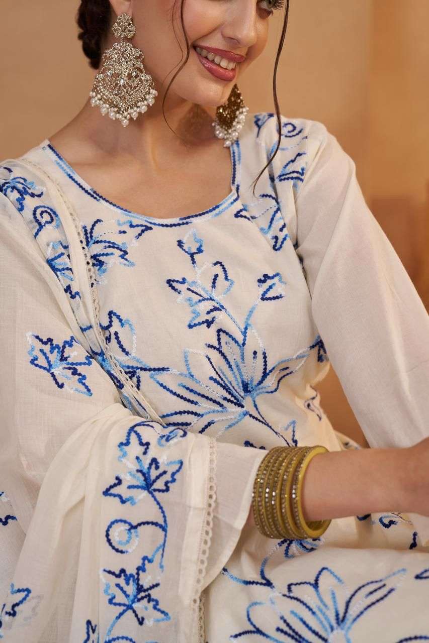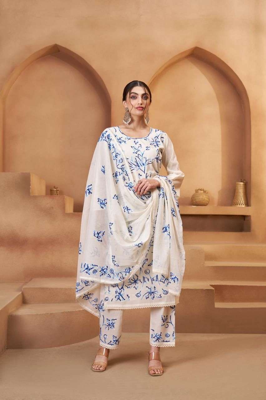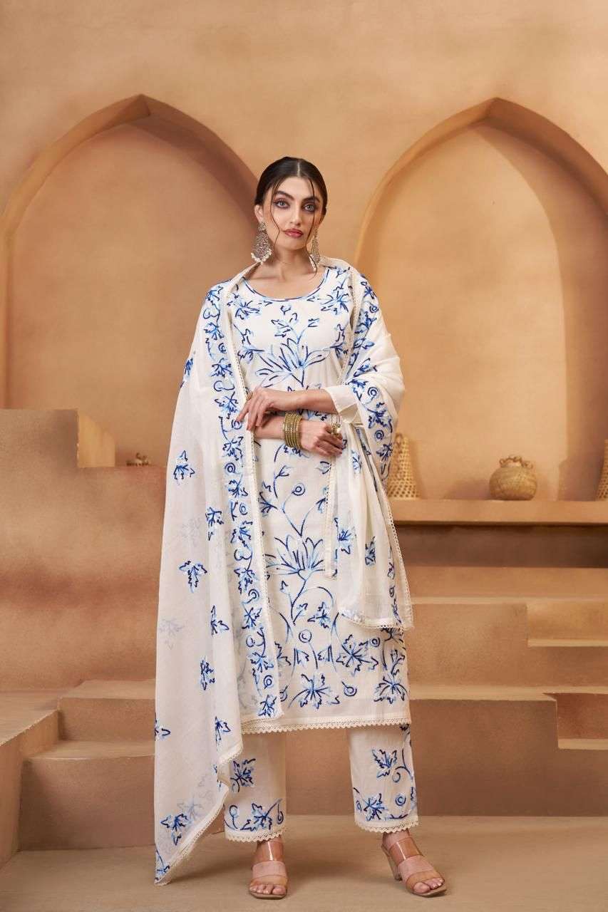 *Fabric Details - send you on details photo.* *Work : Designer Thread work, joot work with Brush Hand print* *Weight : 1 K.g.* *Suit size : Upto 46 Inch* *Suit height : 46 Inch* *Dupatta : 2.25 meter* *Bottom : 2.50 meter* *Type : Semisttiched.*