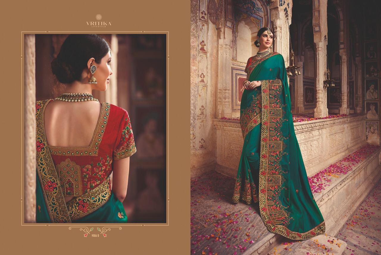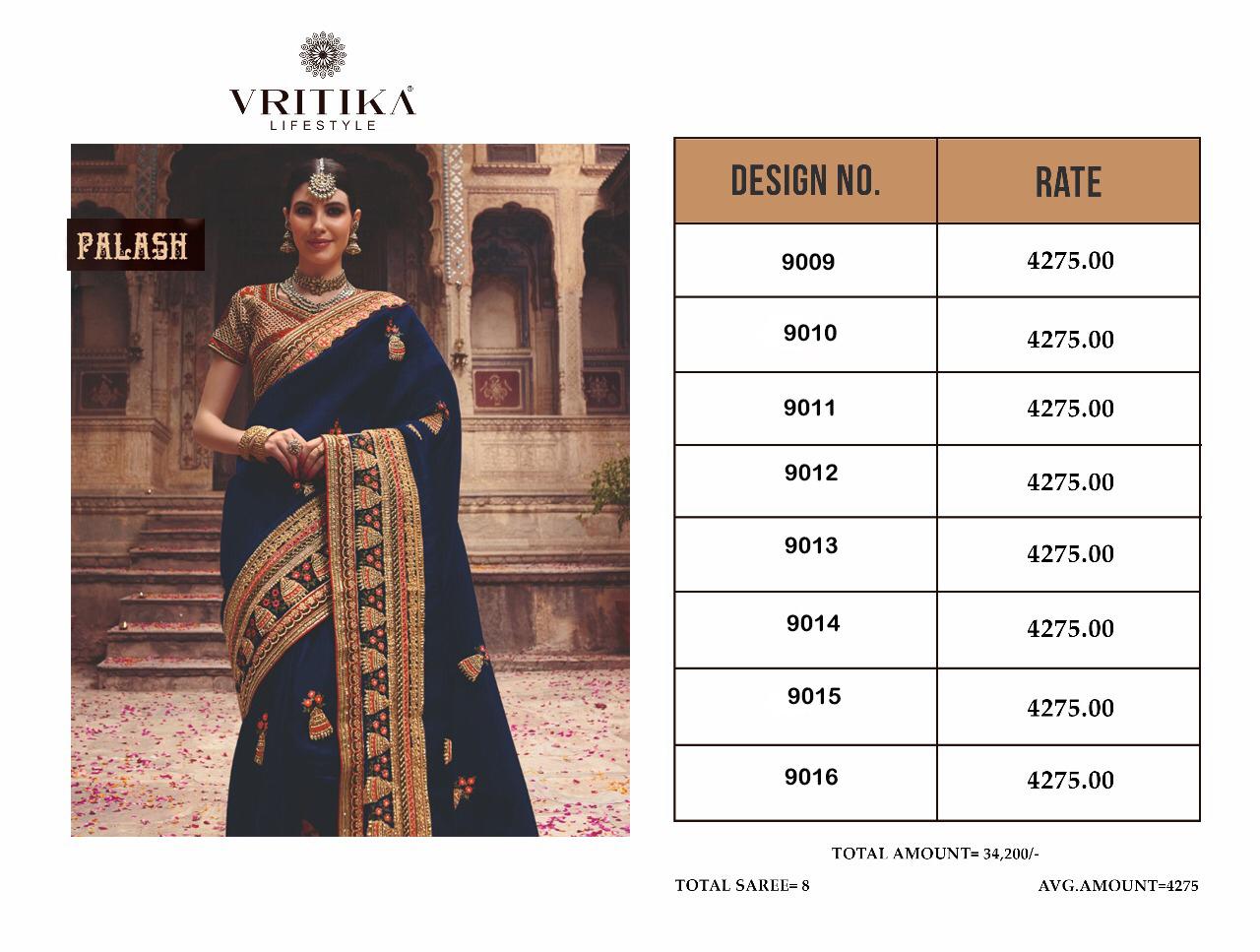 Buy Online Palash Vritika Lifestyle Series 9009 To 9016 Designer Party Wear Sarees Wholesale Supplier And Dealer Surat 8 Pcs of Full Catalogue at Wholesale Price. Looking for Palash Vritika Lifestyle Series 9009 To 9016 Designer Party Wear Sarees Wholesale Supplier And Dealer Surat Full Catalouge at Best Price? Buy Now Palash Vritika Lifestyle Series 9009 To 9016 Designer Party Wear Sarees Wholesale Supplier And Dealer Surat at Wholesale Rate of Rs 34200 with Total 8 Pcs from authroized dealer and supplier of VRITIKA LIFESTYLE Brand. Cost of Each piece is just only Rs 4275 which is very low and affordable price to resale the product in your retail store ,This is Surat based Wholesale Supplier & Dealer of VRITIKA LIFESTYLE Brand. Click on Brand name to Know more about VRITIKA LIFESTYLE Brand's products.Call or Whatsapp on 9898838984 for booking or enquiry