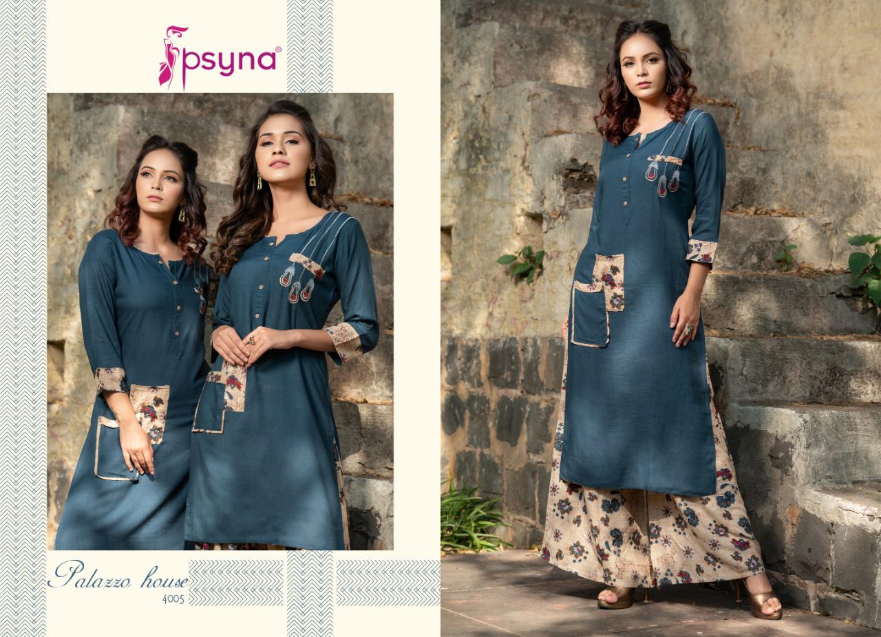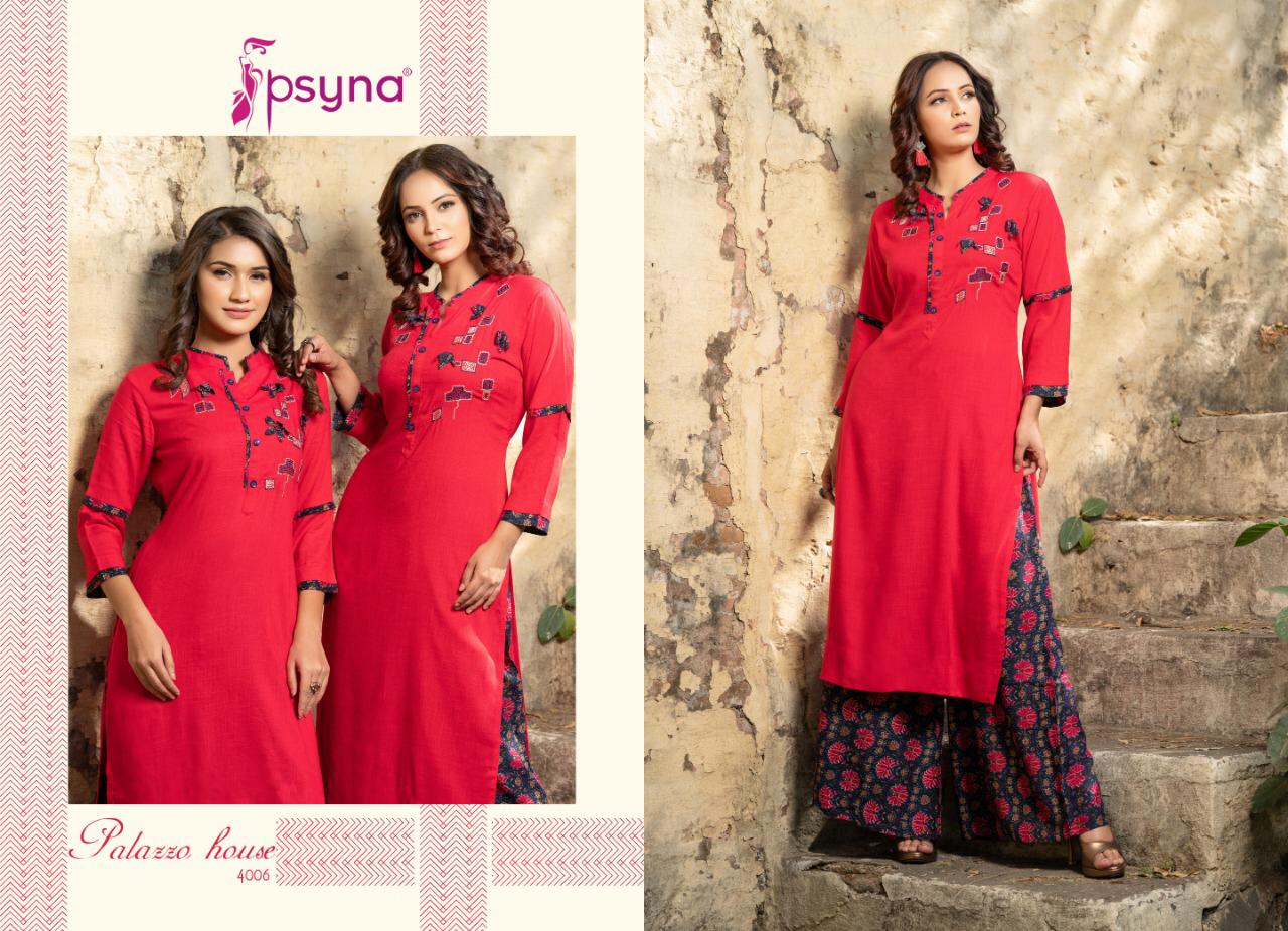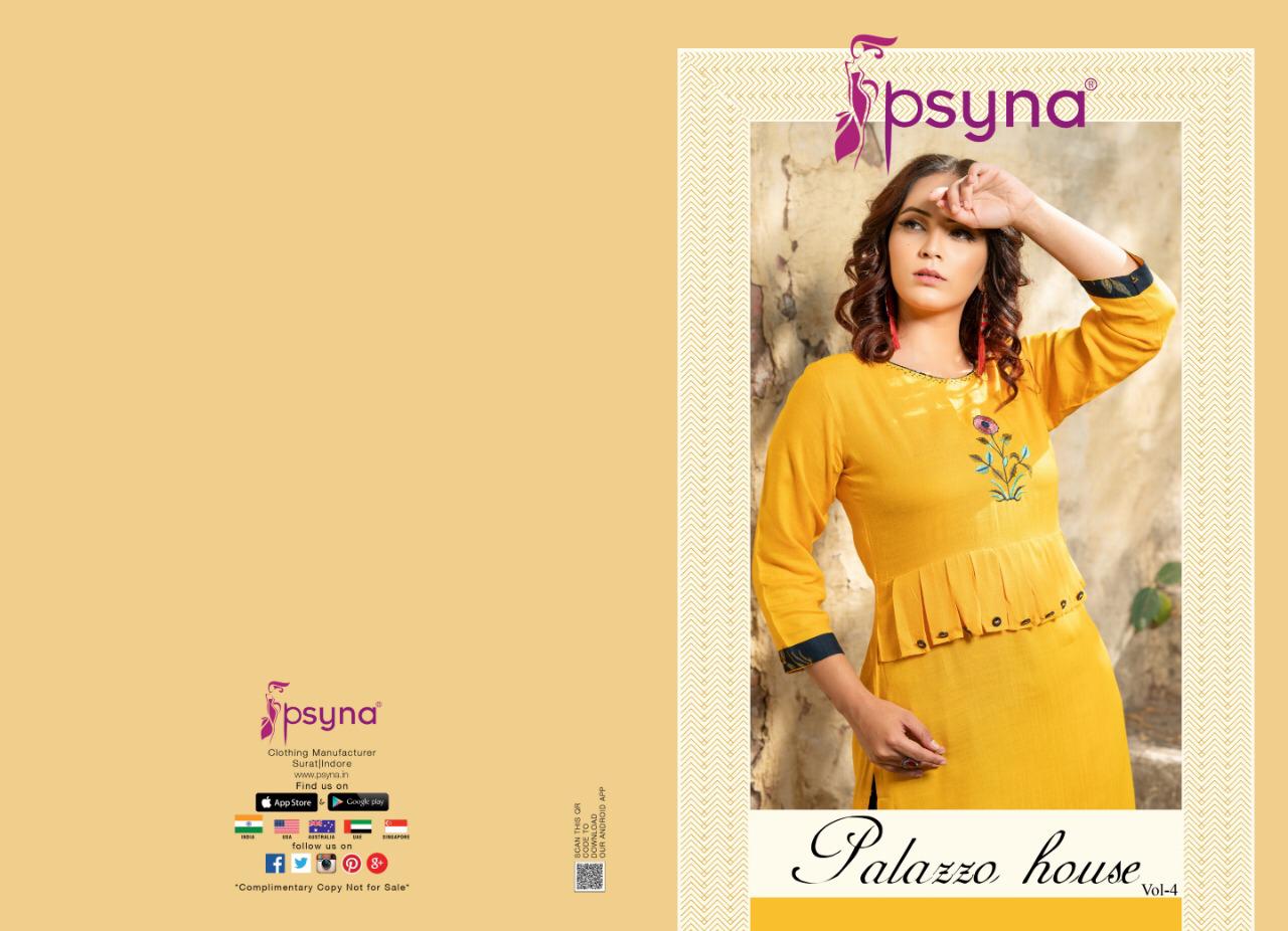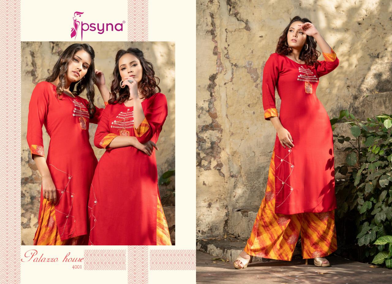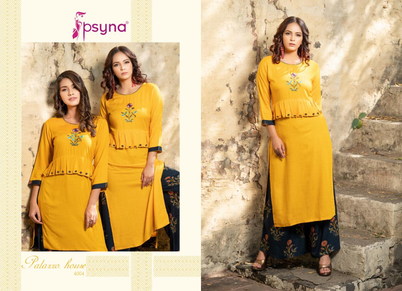 Buy Online Palazzo House Vol 4 By Psyna 4001 Series Fancy Reyon Kurti With Plazzo Collection Wholesaler Surat 10 Pcs of Full Catalogue at Wholesale Price. Looking for Palazzo House Vol 4 By Psyna 4001 Series Fancy Reyon Kurti With Plazzo Collection Wholesaler Surat Full Catalouge at Best Price? Buy Now Palazzo House Vol 4 By Psyna 4001 Series Fancy Reyon Kurti With Plazzo Collection Wholesaler Surat at Wholesale Rate of Rs 7250 with Total 10 Pcs from authroized dealer and supplier of PSYNA Brand. Cost of Each piece is just only Rs 725 which is very low and affordable price to resale the product in your retail store ,This is Surat based Wholesale Supplier & Dealer of PSYNA Brand. Click on Brand name to Know more about PSYNA Brand's products.Call or Whatsapp on 9898838984 for booking or enquiry