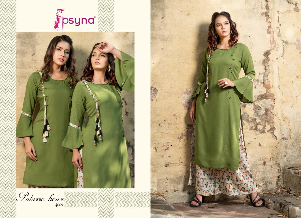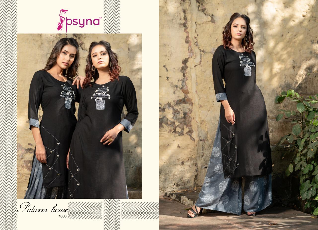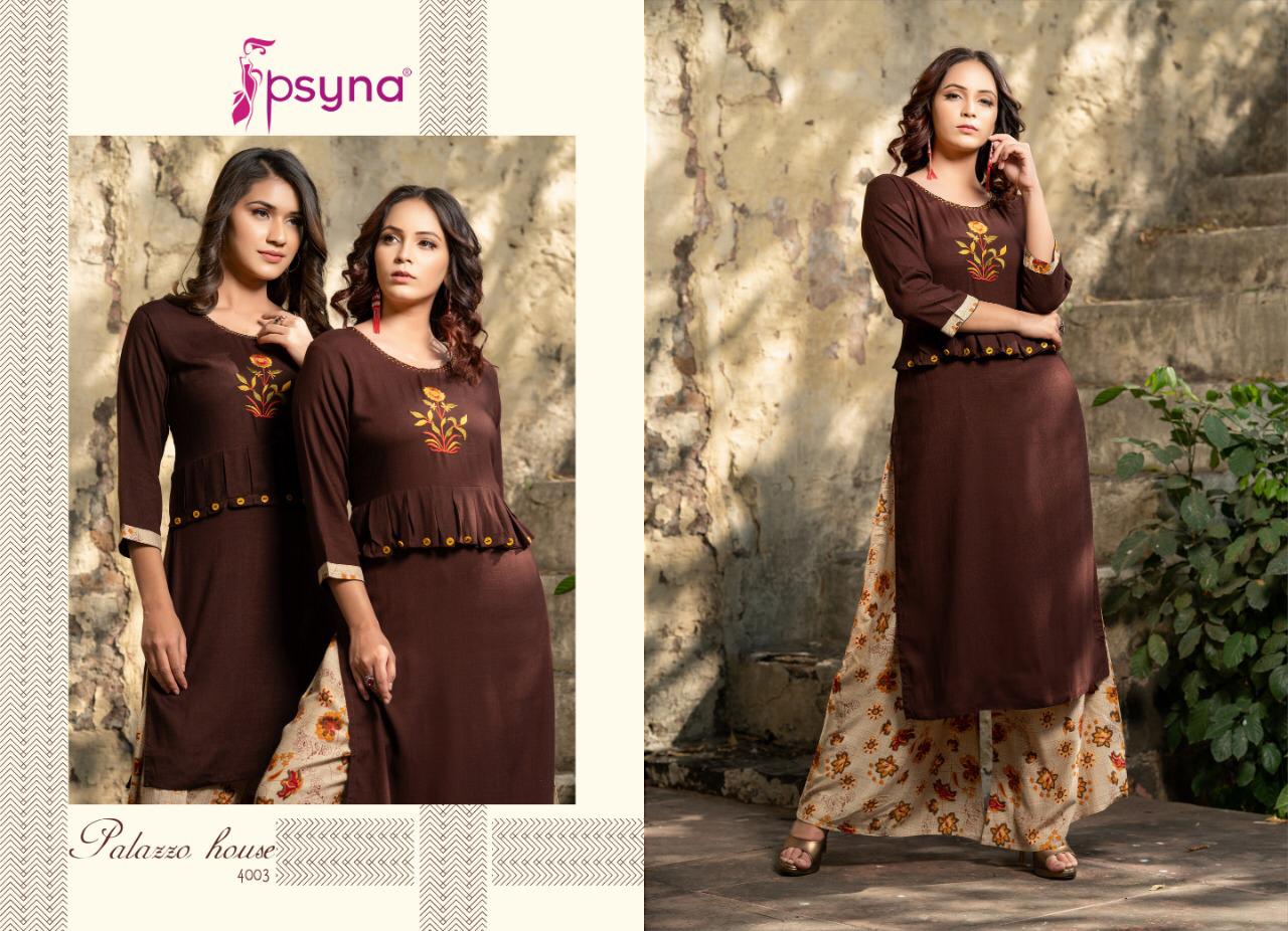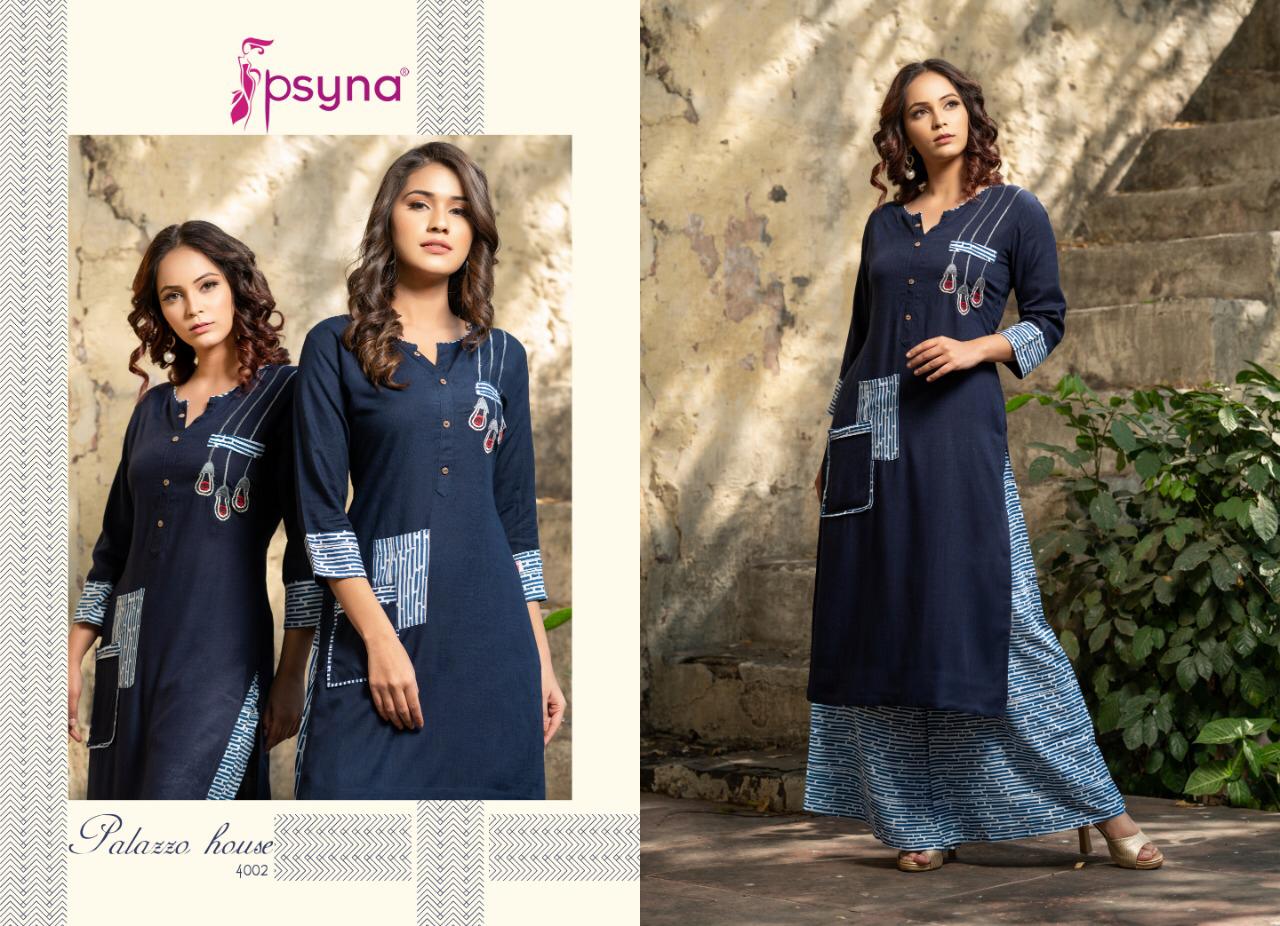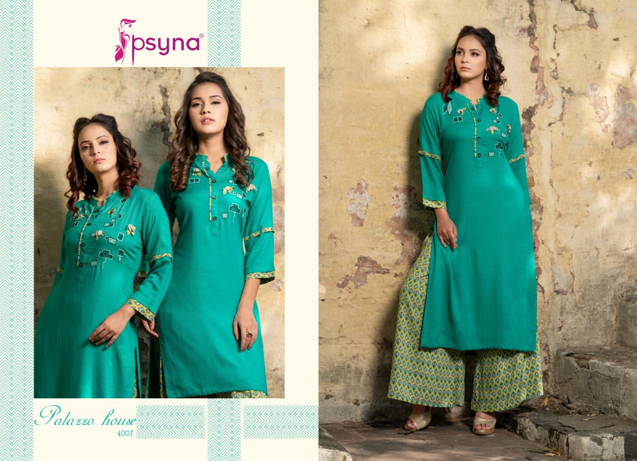 Buy Online Palazzo House Vol 4 By Psyna 4001 Series Fancy Reyon Kurti With Plazzo Collection Wholesaler Surat 10 Pcs of Full Catalogue at Wholesale Price. Looking for Palazzo House Vol 4 By Psyna 4001 Series Fancy Reyon Kurti With Plazzo Collection Wholesaler Surat Full Catalouge at Best Price? Buy Now Palazzo House Vol 4 By Psyna 4001 Series Fancy Reyon Kurti With Plazzo Collection Wholesaler Surat at Wholesale Rate of Rs 7250 with Total 10 Pcs from authroized dealer and supplier of PSYNA Brand. Cost of Each piece is just only Rs 725 which is very low and affordable price to resale the product in your retail store ,This is Surat based Wholesale Supplier & Dealer of PSYNA Brand. Click on Brand name to Know more about PSYNA Brand's products.Call or Whatsapp on 9898838984 for booking or enquiry
