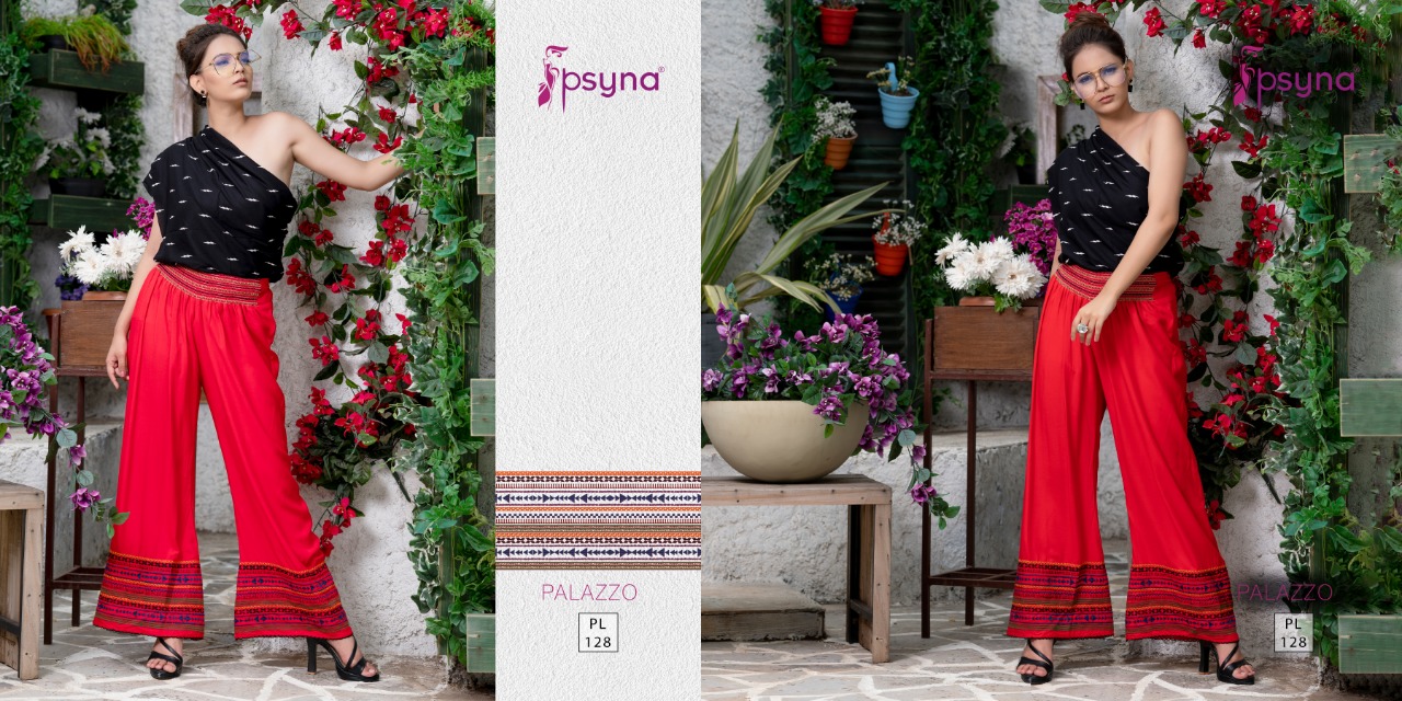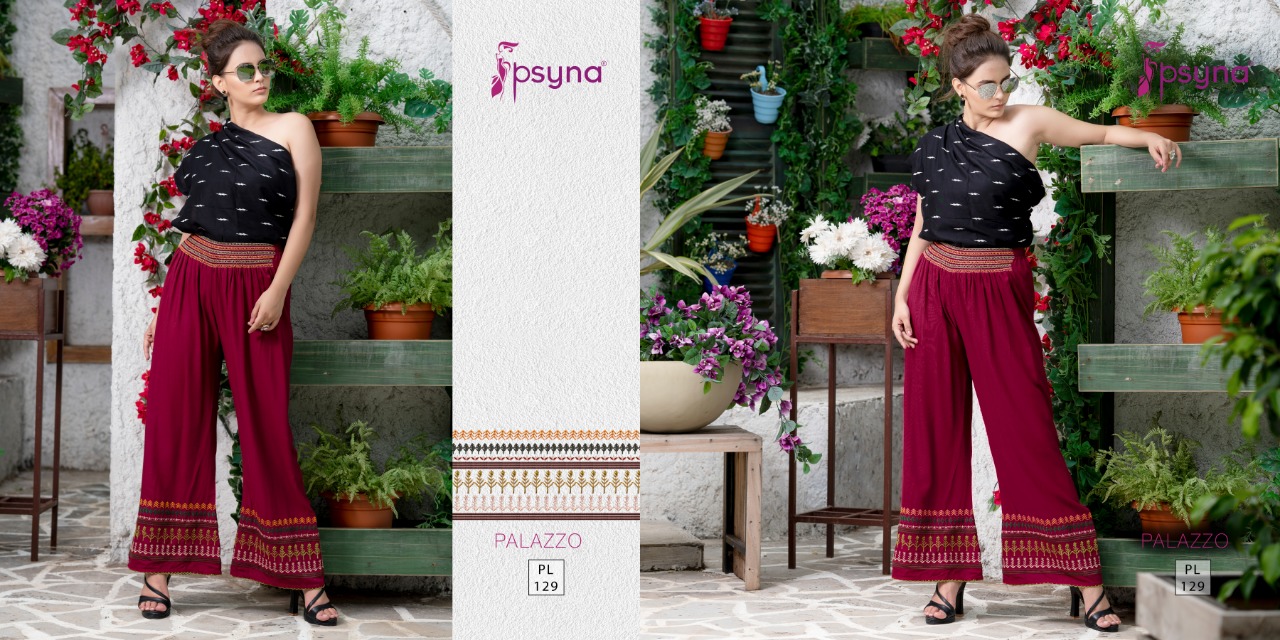 _We are launching Fashionably Elegant Palazzo's for the Season_ *from PSYNA* Catalog: _*PALAZZO VOL-12*_ *Pack of :* 10 Palazzo Set *Size:* - Elastic that fits upto 40Â? *Fabric* - *Rayon -14kg* *Pattern:* EMBROIDERY Sizes Available: *FREE SIZE* Rate 425 |