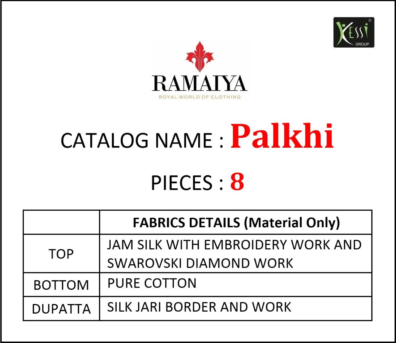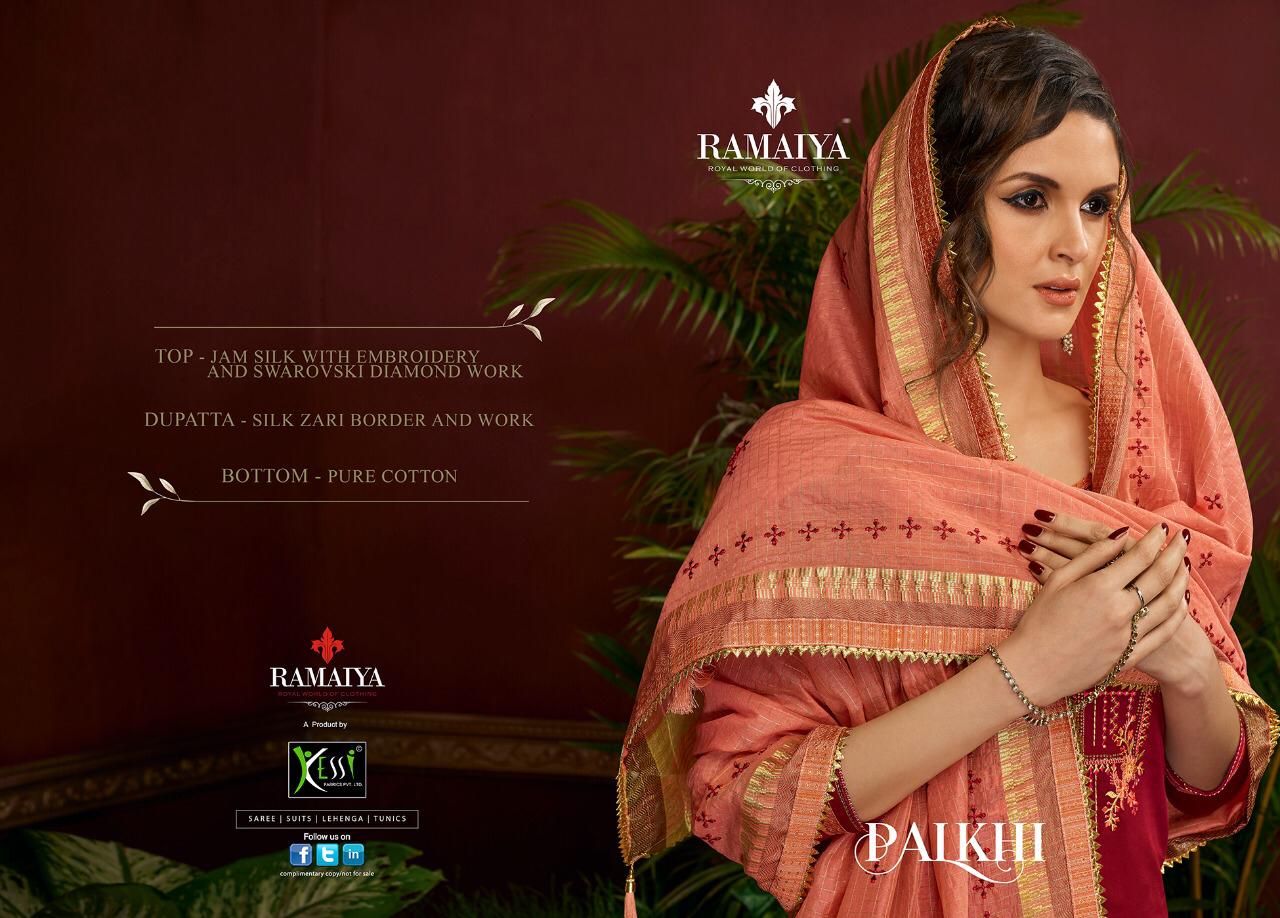 Buy Online Palkhi By Ramaiya Jam Silk Dress Materials Wholesale Supplier Surat 8 Pcs of Full Catalogue at Wholesale Price. Looking for Palkhi By Ramaiya Jam Silk Dress Materials Wholesale Supplier Surat Full Catalouge at Best Price? Buy Now Palkhi By Ramaiya Jam Silk Dress Materials Wholesale Supplier Surat at Wholesale Rate of Rs 6392 with Total 8 Pcs from authroized dealer and supplier of Brand. Cost of Each piece is just only Rs 799 which is very low and affordable price to resale the product in your retail store ,This is Surat based Wholesale Supplier & Dealer of Brand. Click on Brand name to Know more about Brand's products.Call or Whatsapp on 9898838984 for booking or enquiry