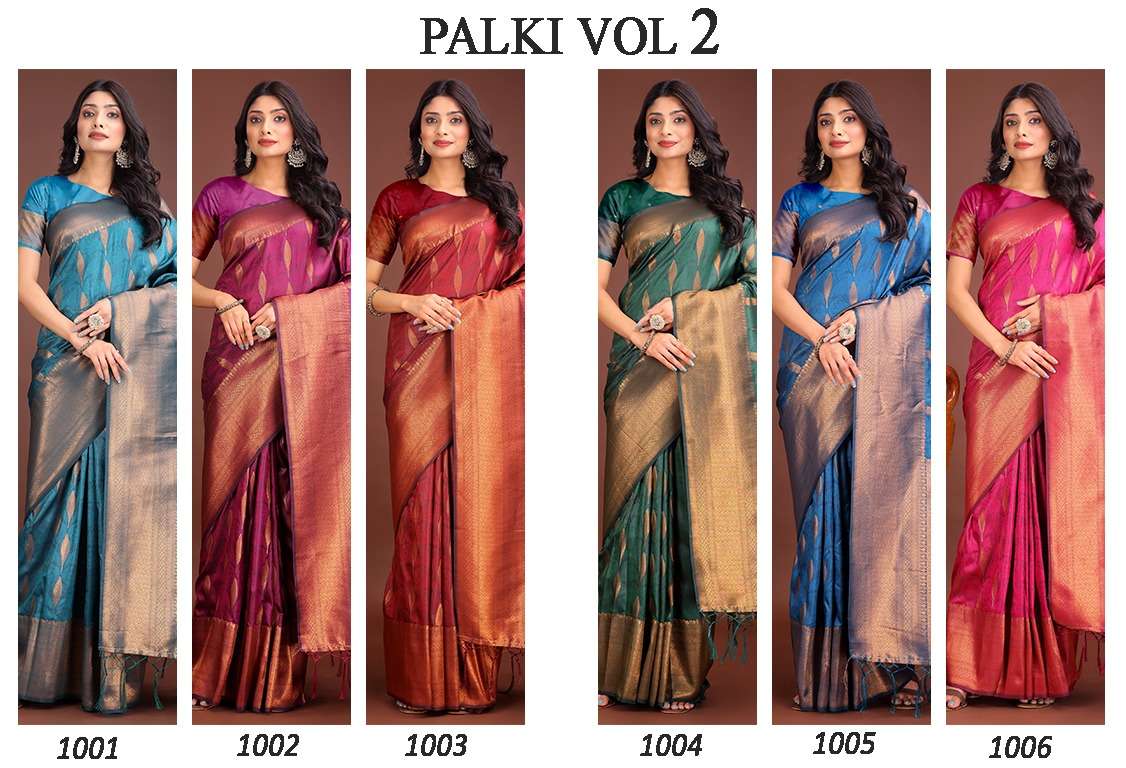 Catalog Name: *PALKI VOL 2* Brand: *ASTITA* Product Type: Banarasi silk Fabric: Banarasi silk Price Per Piece: 699/- Gst Extra: 5% Other Specifications: Banarasi silk Saree Mtr: 5.5 Mtr Blouse: 0.8 Mtr Total Pcs: 6