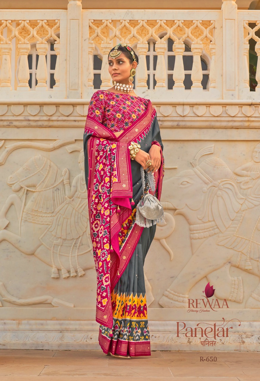 Brand - Rewaa Catlog name -PANETAR Rate- 2975/- per pcs GST 5 per extra Fabric- Smuth silk Patola print with hand work Delivery from today SINGLE AVAILABLE |
